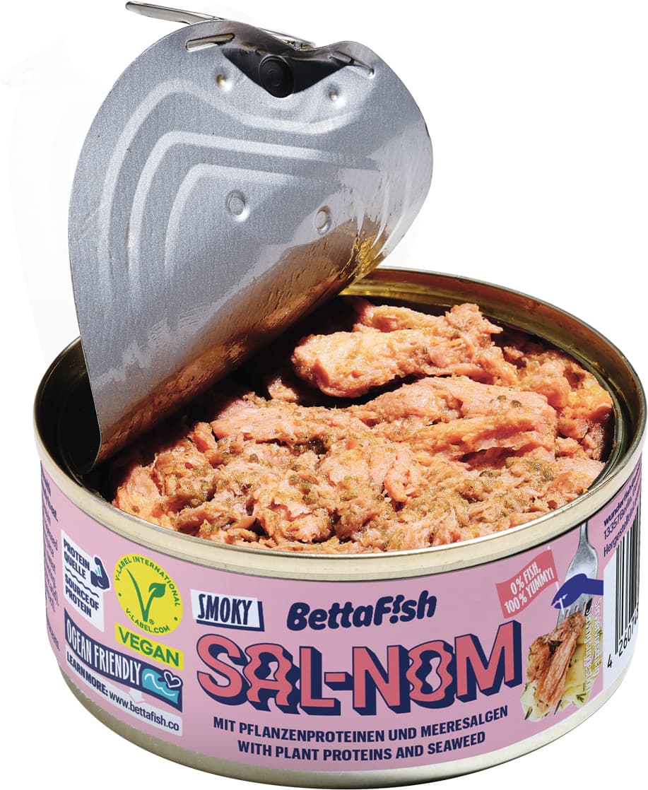 BettaF!sh SAL-NOM ist unsere Antwort auf den beliebtesten Fisch weltweit! Aus europäischen Meeresalgen und pflanzlichen Proteinen von der Ackerbohne und Erbse ist SAL-NOM die köstliche Alternative zum heiß geräucherten Lachs - 100% pflanzlich, frei von Weizen und Soja und deine perfekte Quelle für Omega-3-Fettsäuren.