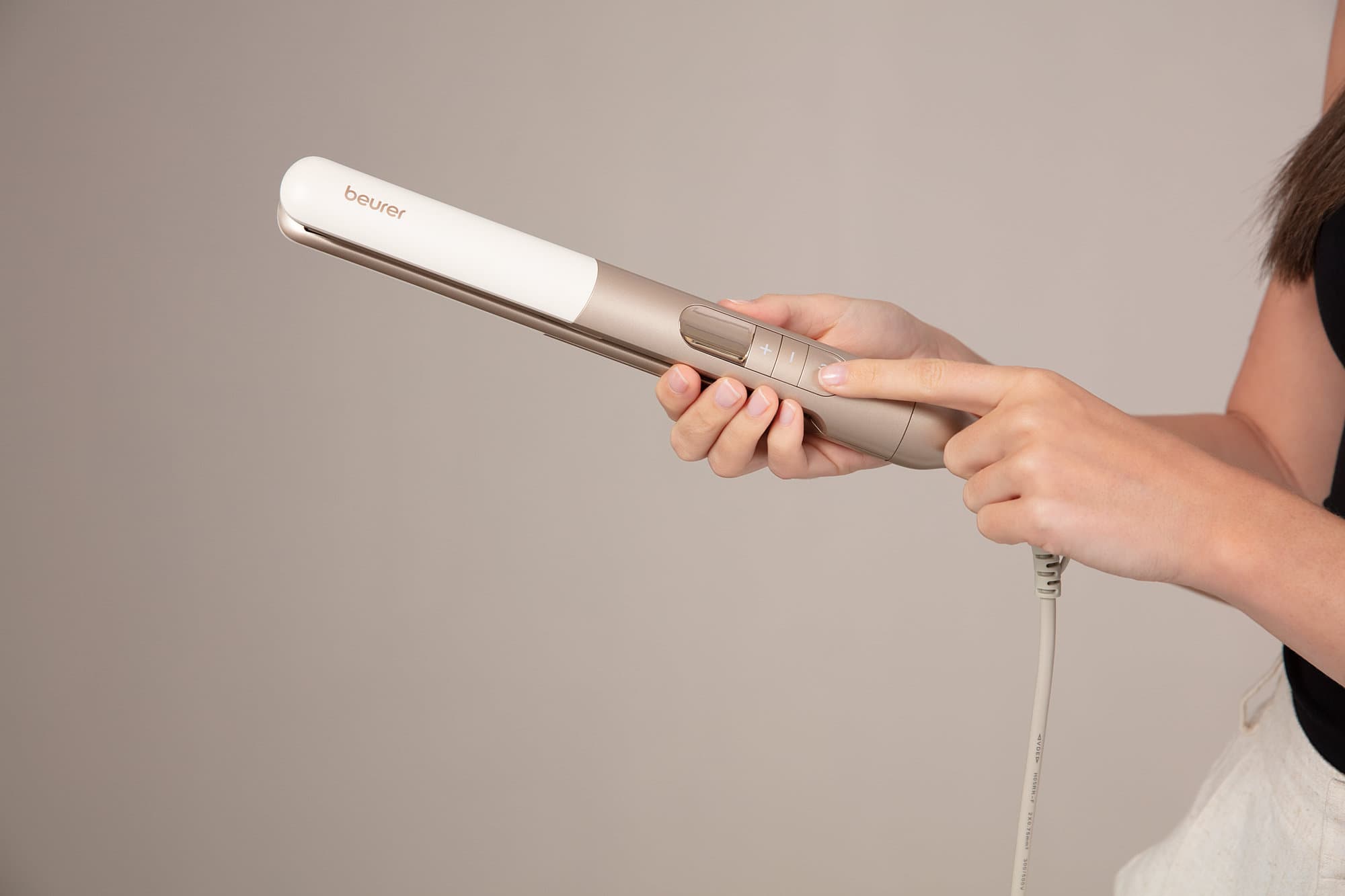 Für geschmeidig glänzendes Haar sorgt die integrierte Ionenfunktion, während die Keramik-Beschichtung das Haar zuverlässig schützt. Dank der Schnellaufheizung ist das Gerät sofort einsatzbereit. Die stufenlose Temperaturregelung von 100 °C bis 220 °C ermöglicht eine individuelle Anpassung an jeden Haartyp. Eine Tastensperre fixiert die gewählte Temperatureinstellung zuverlässig.