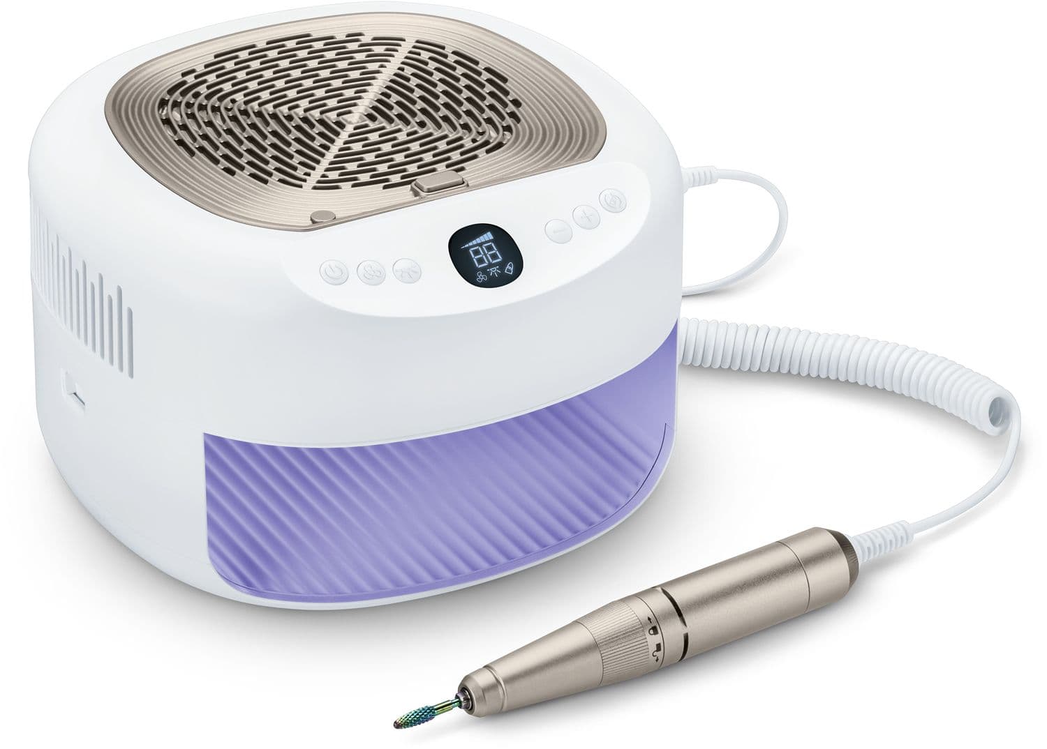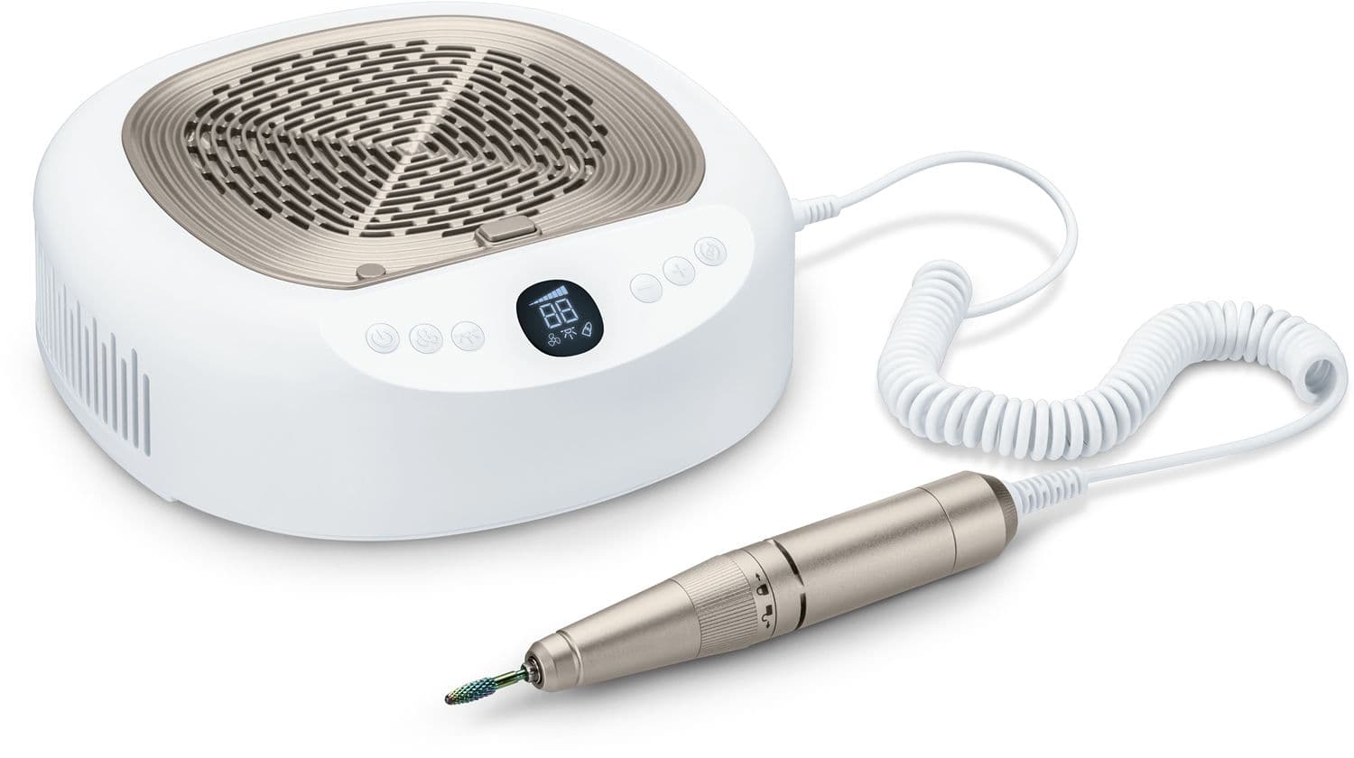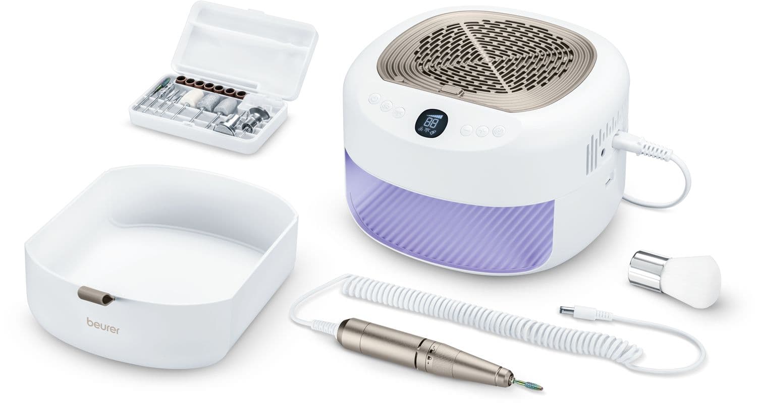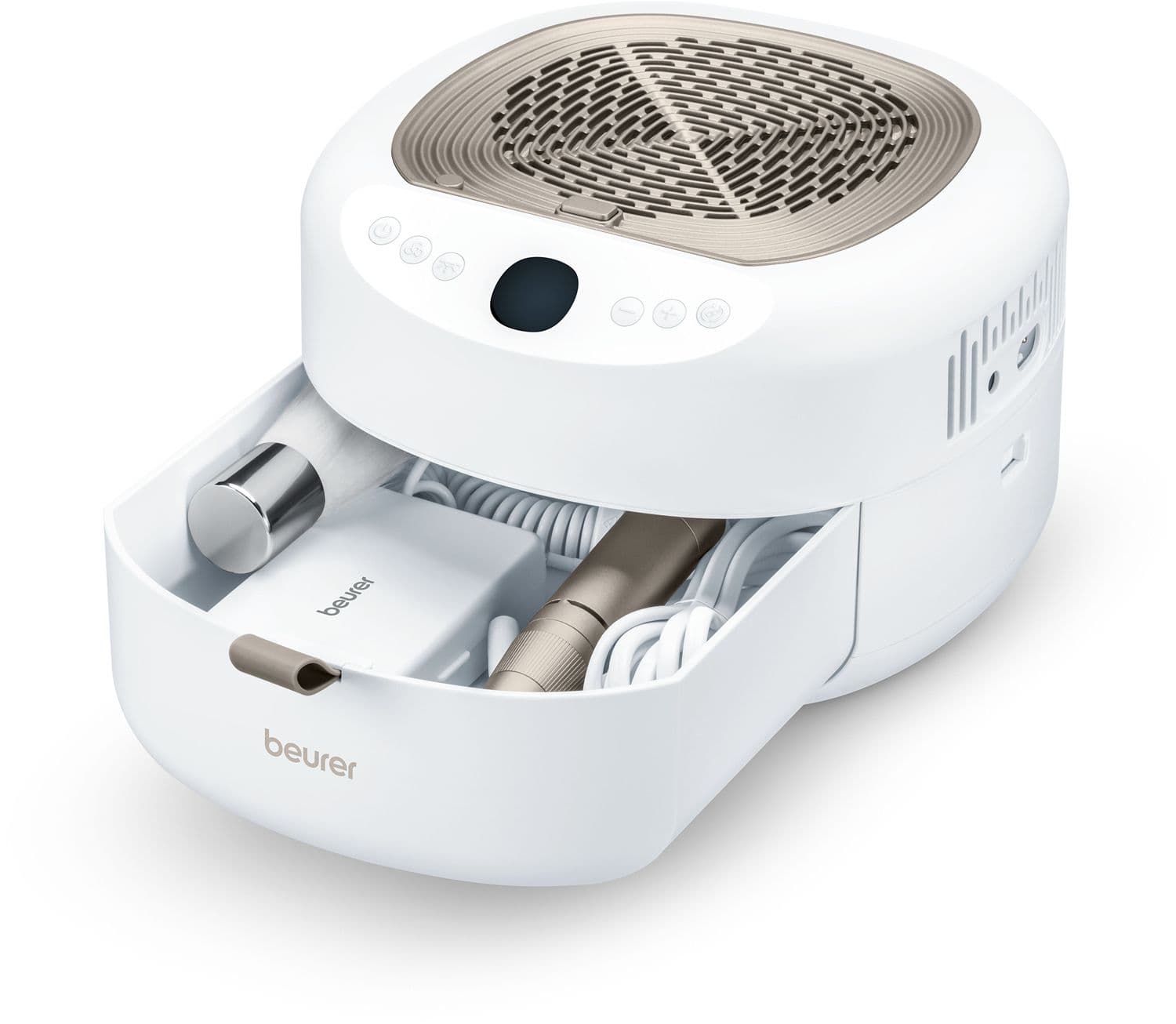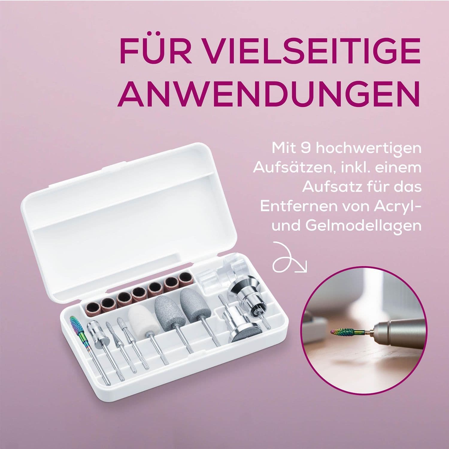 Der Rechts-/Linkslauf ermöglicht einen vielseitigen Einsatz und ist sowohl für Rechts- als auch für Linkshänder geeignet. Extra schmale Form für präzise Maniküre/Pediküre sowie präzises Feilen und Formen der Nägel. Dank des Aluminiumgehäuses arbeitet der Nagelfräser geräusch-, vibrations- und temperaturarm. 9 hochwertige Aufsätze aus Saphir, Filz und Hartmetall für den individuellen Einsatz nach Bedarf. Die Absaugfunktion ermöglicht ein sauberes Arbeiten und verhindert das Aufwirbeln von Nagelstaub. Der integrierte Filter ist langlebig, herausnehmbar und schnell zu reinigen. Der integrierte UV/LED Nageltrockner ermöglicht eine effiziente Nageltrocknung, die zu einem langanhaltenden Ergebnis führt. Der UV/LED Nageltrockner ist für alle UV-härtenden Lacke und Gele geeignet und garantiert somit optimale Ergebnisse unabhängig von der gewählten Lack- oder Gelmarke