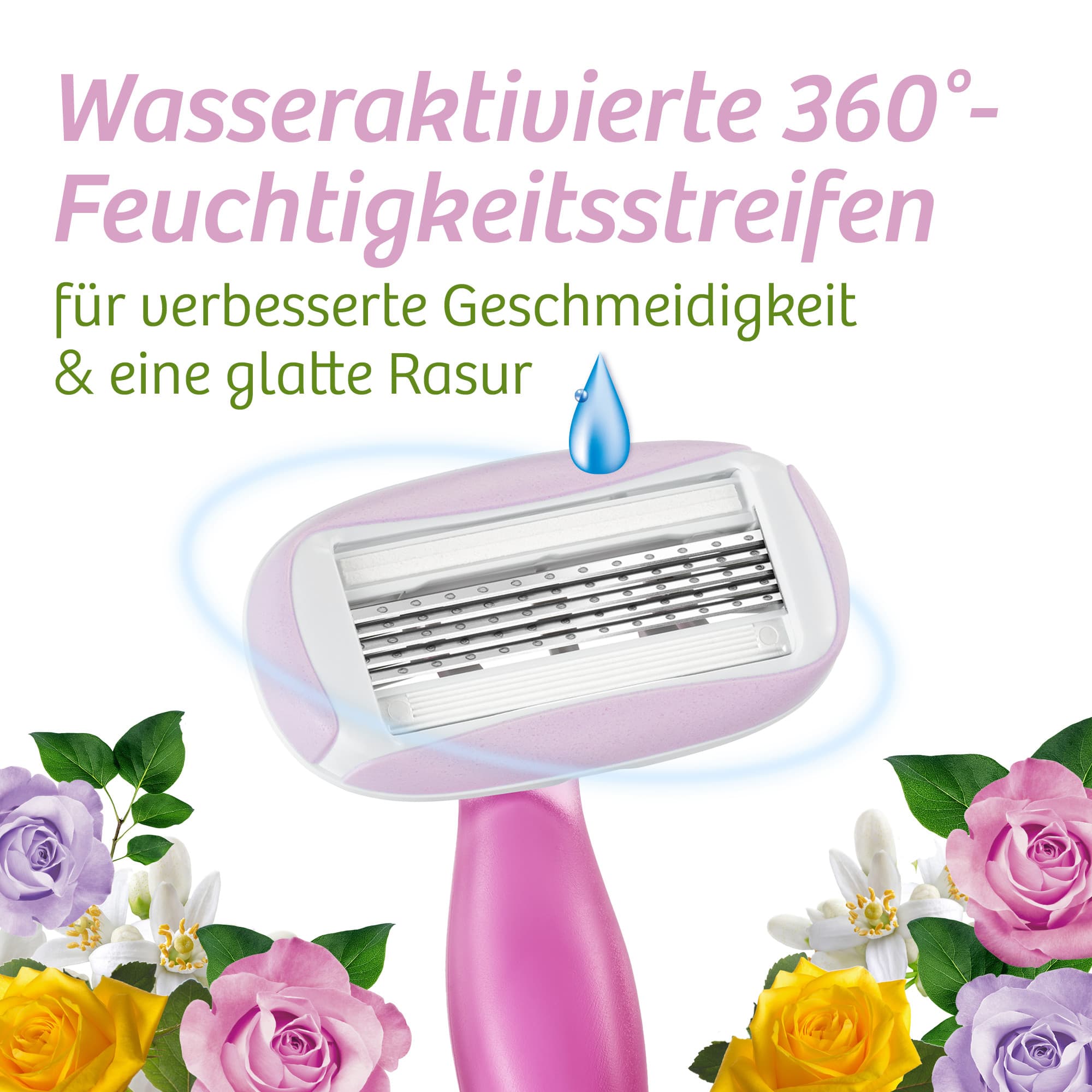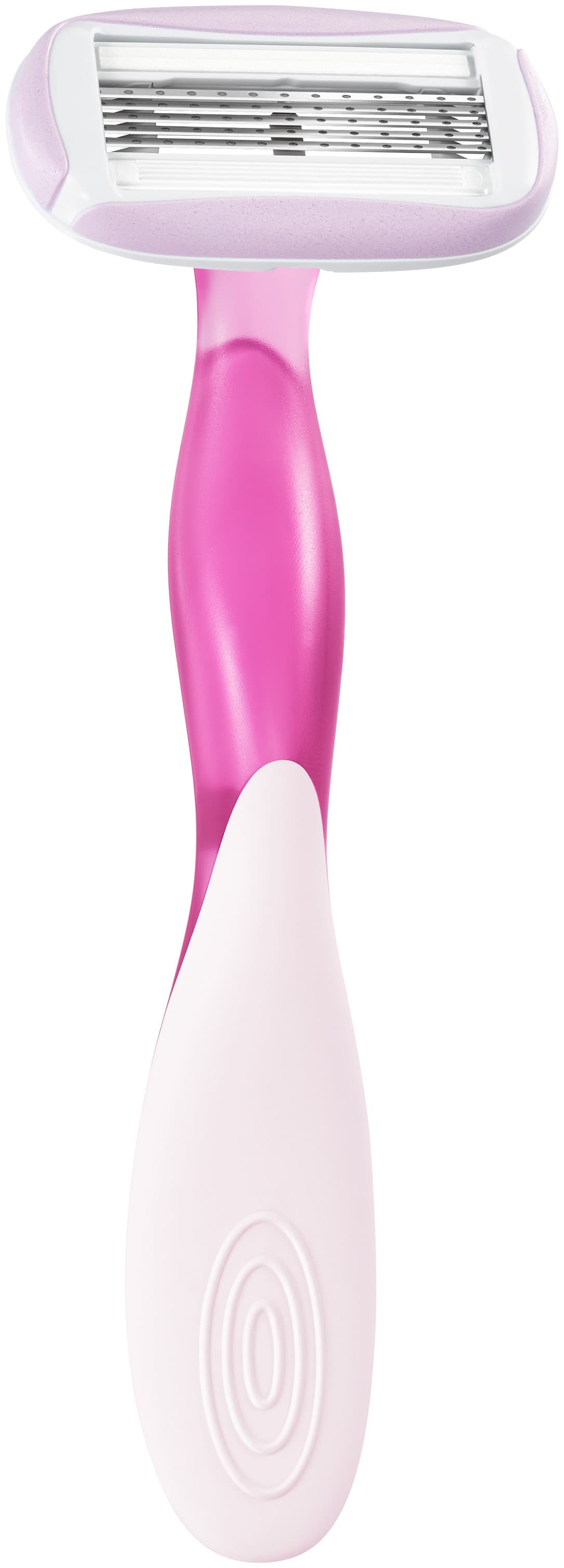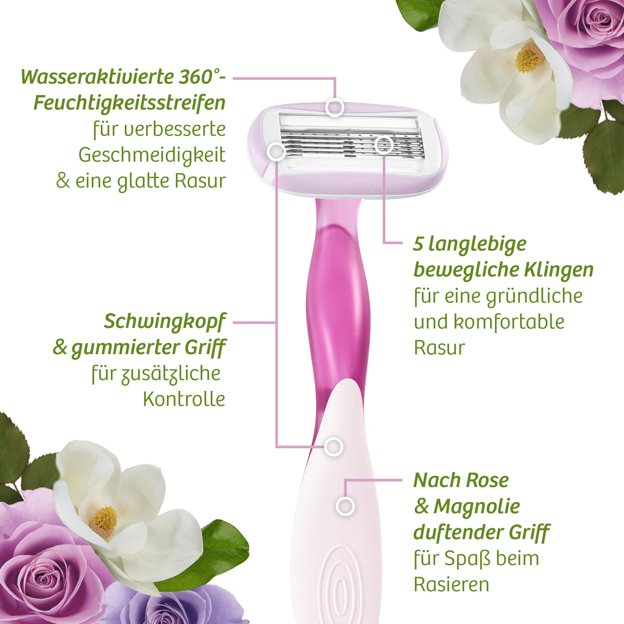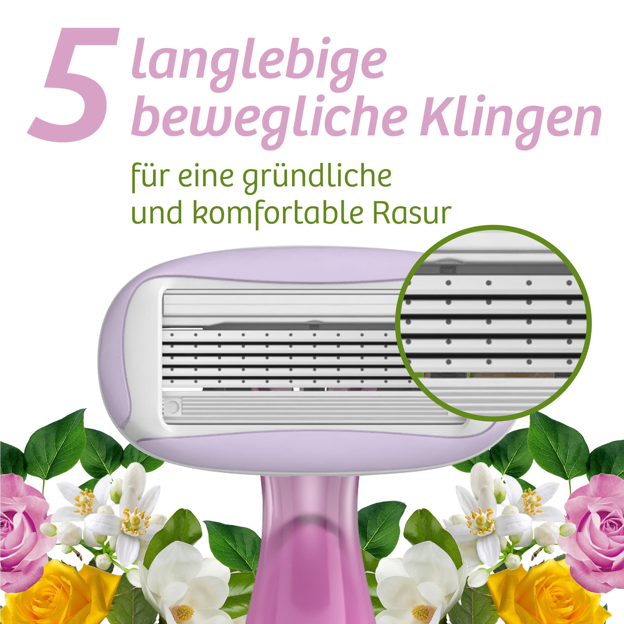 Die fünf beweglichen Klingen des Rasierers passen sich den Körperkonturen an und sorgen für ein ebenmäßiges Hautgefühl. Die Feuchtigkeitsstreifen sind mit pflegenden Inhaltsstoffen angereichert und unterstützen das Gleiten der Klingen über die Haut. Der speziell geformte Griff liegt gut in der Hand und ermöglicht eine kontrollierte Führung während der Rasur.