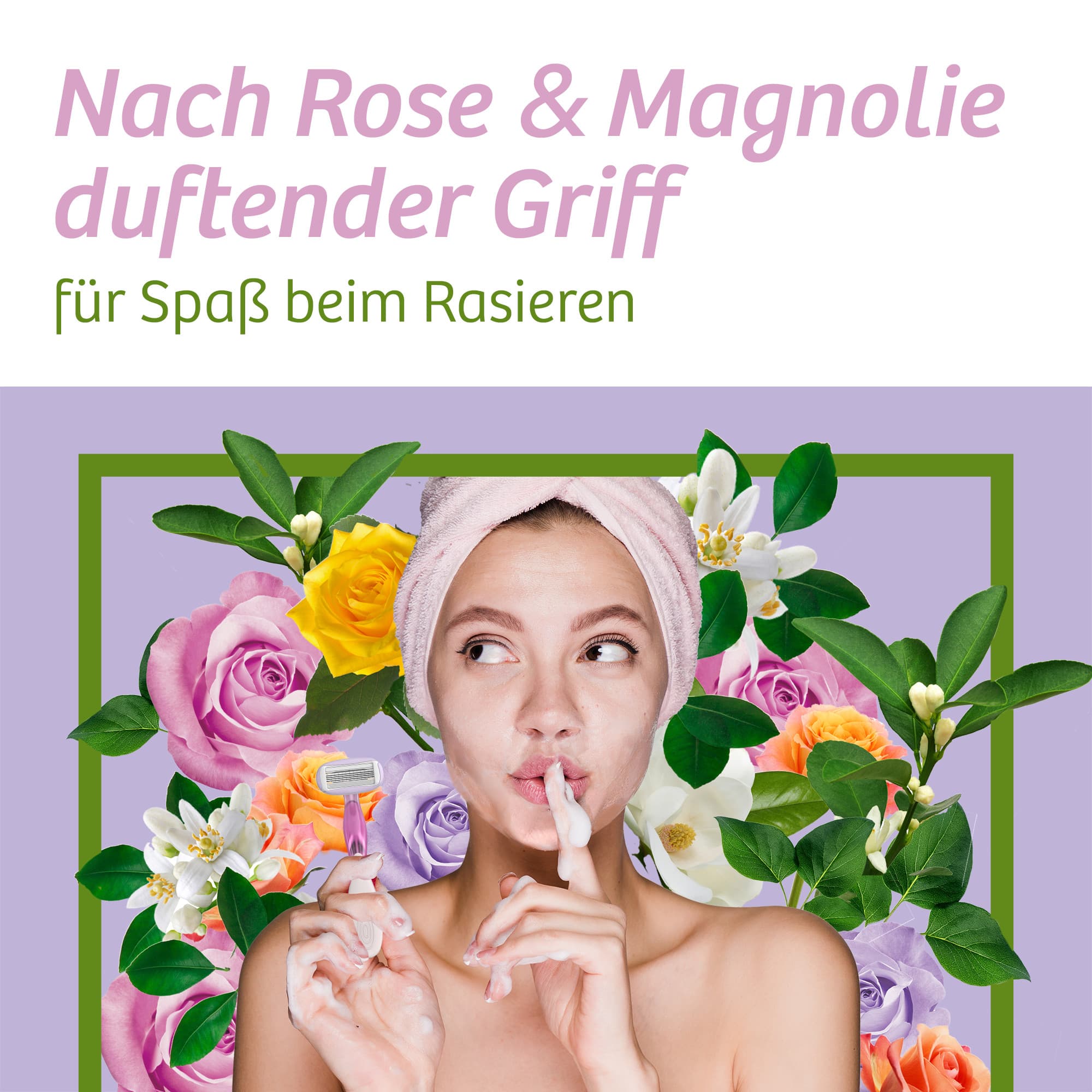 Der BIC Soleil Escape Einwegrasierer ermöglicht eine gründliche Haarentfernung. Sein Griff verströmt einen zarten Duft nach Rose und Magnolie und macht die Anwendung zu einem angenehmen Erlebnis.