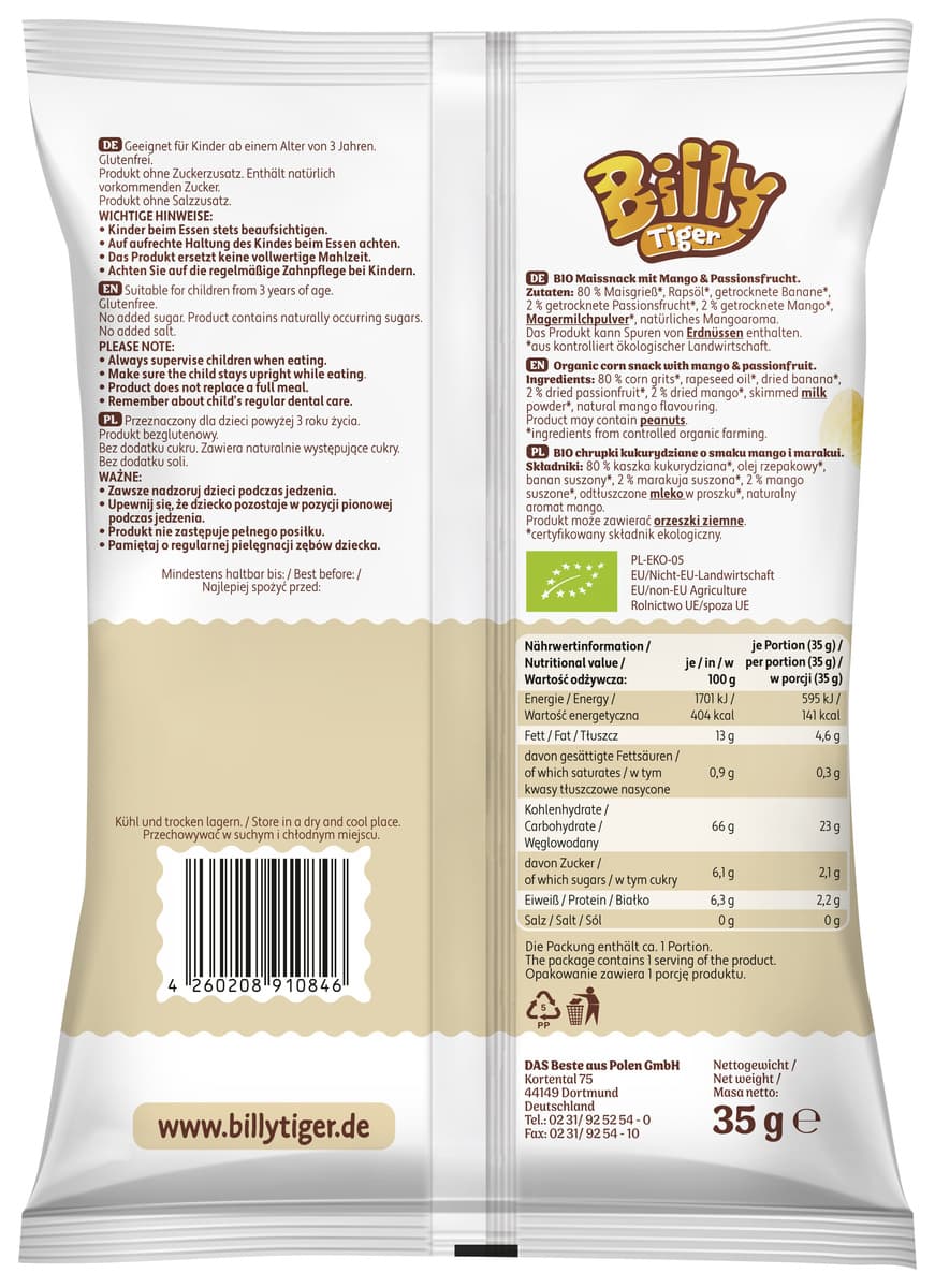 | Zutaten | 80 % Maisgrieß*, Rapsöl*, getrocknete Banane*, 2 % getrocknete Passionsfrucht*, 2 % getrocknete Mango*, MAGERMILCHPULVER*, natürliches Mangoaroma. Das Produkt kann Spuren von Erdnüssen enthalten. *aus kontrolliert ökologischer Landwirtschaft. |
