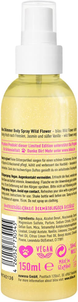 Shimmer Body Spray „Wild Flower“ – floral, frisch & einfach unwiderstehlich – für extra Flowerpower und glow to go. Mit der Wild & Flower Edition setzt bilou ein Zeichen für mehr Artenvielfalt und den Schutz unserer Natur. Hinter Pink Leopard und Wild Flower steckt deshalb mehr als nur Duft und Design: Gemeinsam mit der Naturschutzorganisation Wilderness International wächst mit jedem verkauften Produkt der bilou Forest – ein geschütztes Regenwaldgebiet in Peru, das dauerhaft bewahrt wird. So kann jeder Kauf dazu beitragen, wertvollen Lebensraum für Tiere und Pflanzen zu erhalten. Selfcare, die Spaß macht und gleichzeitig Gutes tut.