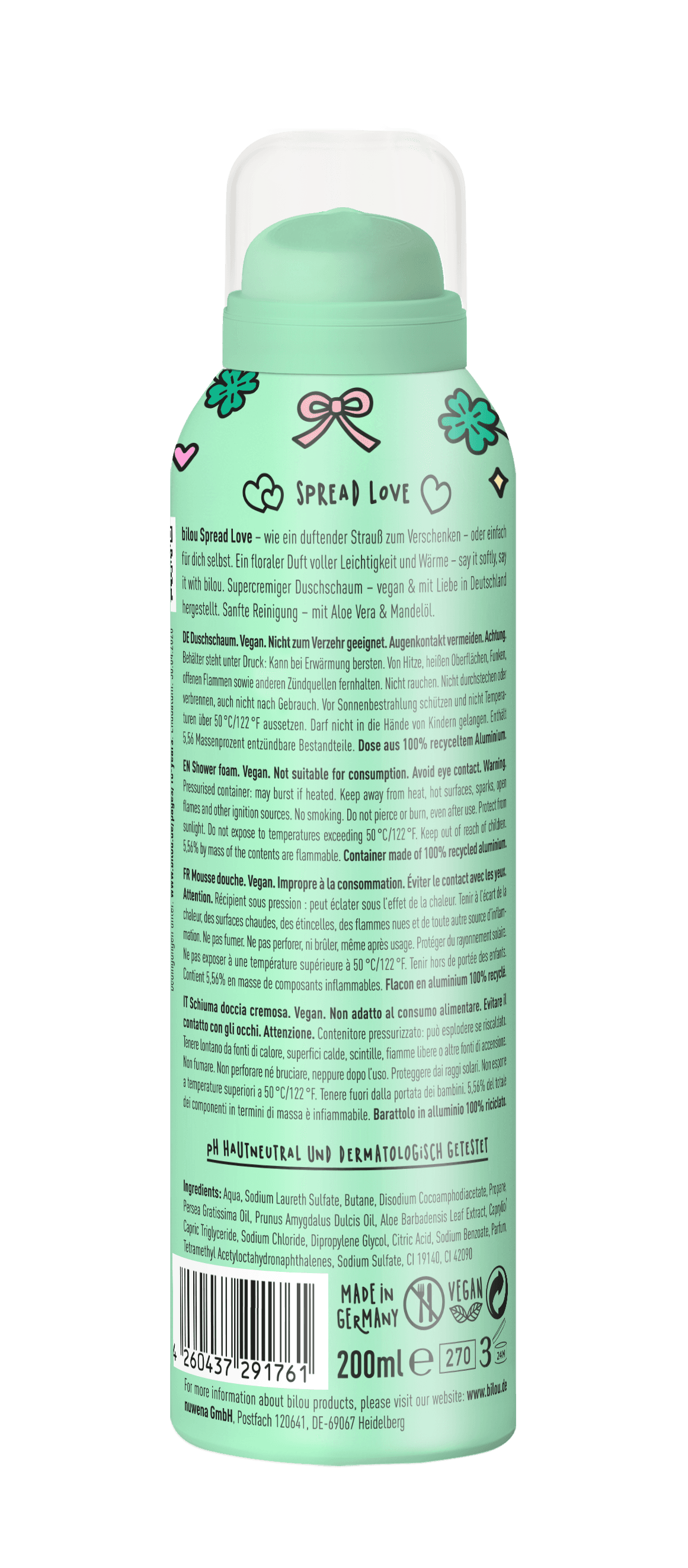 bilou Spread Love – wie ein duftender Strauß zum Verschenken – oder einfach für dich selbst. Ein floraler Duft voller Leichtigkeit und Wärme – say it softly, say it with bilou. Supercremiger Duschschaum – vegan & mit Liebe in Deutschland hergestellt. Sanfte Reinigung – mit Aloe Vera und Mandelöl.