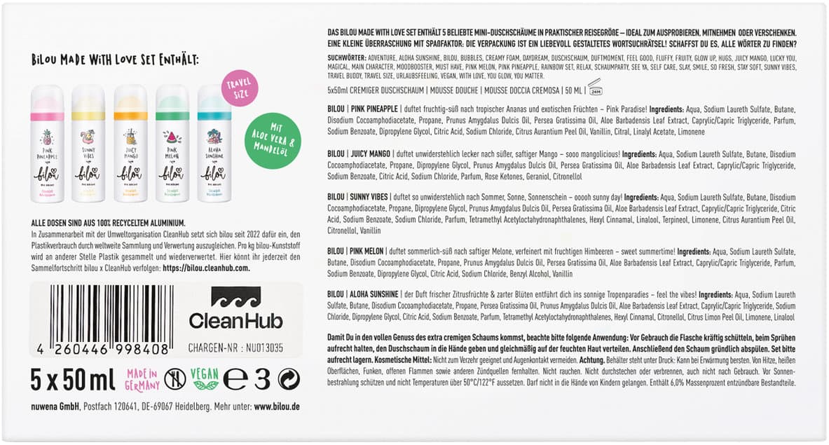 Unser bilou Made with Love Set verzaubert dich mit fünf cremigen Mini-Duschschäumen in praktischer Reisegröße, perfekt zum Ausprobieren, Mitnehmen oder einfach für unterwegs. Jede Sorte bringt deinen Alltag zum Strahlen und sorgt für kleine Wohlfühlmomente, die dich den ganzen Tag begleiten – und das in einer bunten, richtig coolen Verpackung, die sofort gute Laune macht.