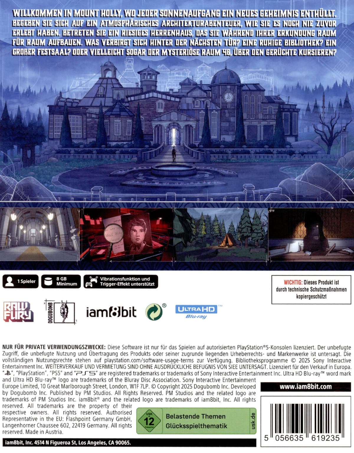 Als Erbe von Mt. Holly hast du die Aufgabe, die sich verändernden Gänge auf der Suche nach Zimmer 46 zu erkunden. Je tiefer du in das Anwesen vordringst, desto bewusster wird dir, dass dort noch weit mehr lauert als nur ein verschollenes Zimmer. Komm einer Vergangenheit auf die Spur, die aus den Fäden von Erpressung, politischen Intrigen und dem geheimnisvollen Verschwinden eines Kinderbuchautors aus der Umgebung gesponnen wurde. Und je mehr du erkundest, desto bewusster wird dir, dass die Vergangenheit näher ist, als es scheint.