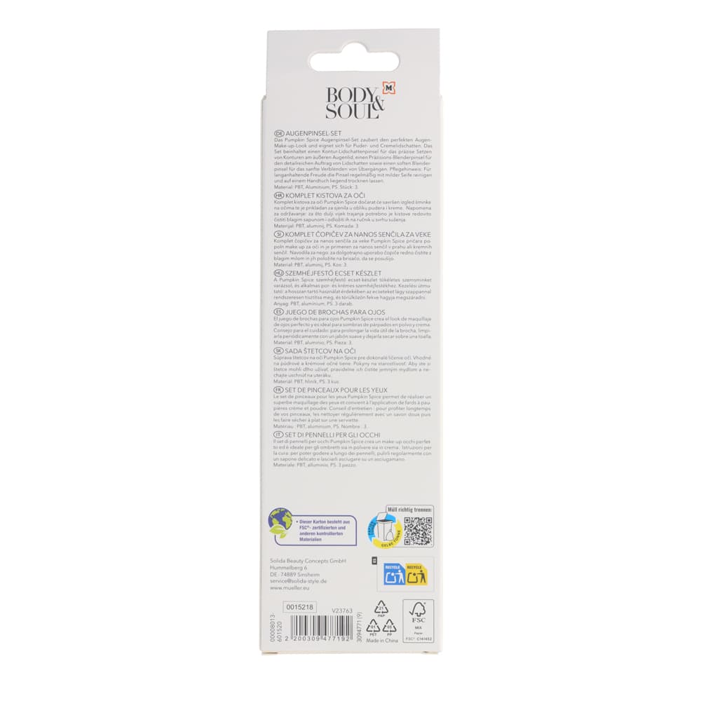 Das Pumpkin Spice Augenpinselset zaubert den perfekten Augen Make Up Look und eignet sich für Puder- und Cremelidschatten. Das Set beinhaltet einen Konturlidschattenpinsel für das präzise Setzen von Konturen am äußeren Augenlid, einen Präzisions-Blenderpinsel für den detailreichen Auftrag von Lidschatten sowie einen soften Blenderpinsel für das sanfte Verblenden von Übergängen.