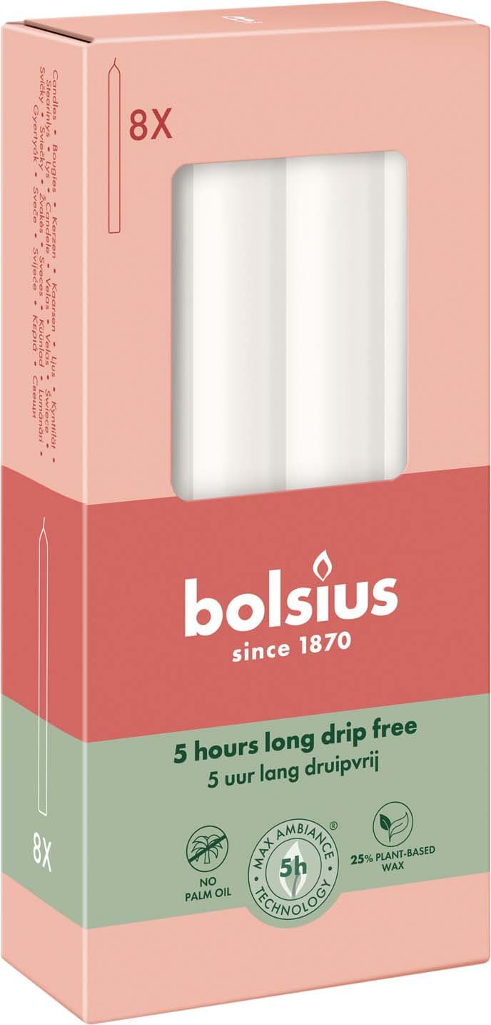 Entdecken Sie die Essentials-Kollektion: die glatten Tafelkerzen von Bolsius! Diese Dinnerkerze ist 17 cm hoch und brennt bis zu 5 Stunden. Sie ist tropffrei und erzeugt keinen sichtbaren Ruß dank unserer MaxAmbiance-Technologie. Diese Technologie kombiniert eine einzigartige Rezeptur mit einem speziell ausgewählten Docht für perfekte Brennleistung. Und dank des Easy-Fit-Fußes passt die Kerze in fast jeden Kerzenhalter. Hergestellt ohne Palmöl. Die Kollektion umfasst elegante Kerzen in verschiedenen Größen und Farben, die sich mühelos miteinander kombinieren lassen. Eine wertvolle Ergänzung für jedes Interieur!