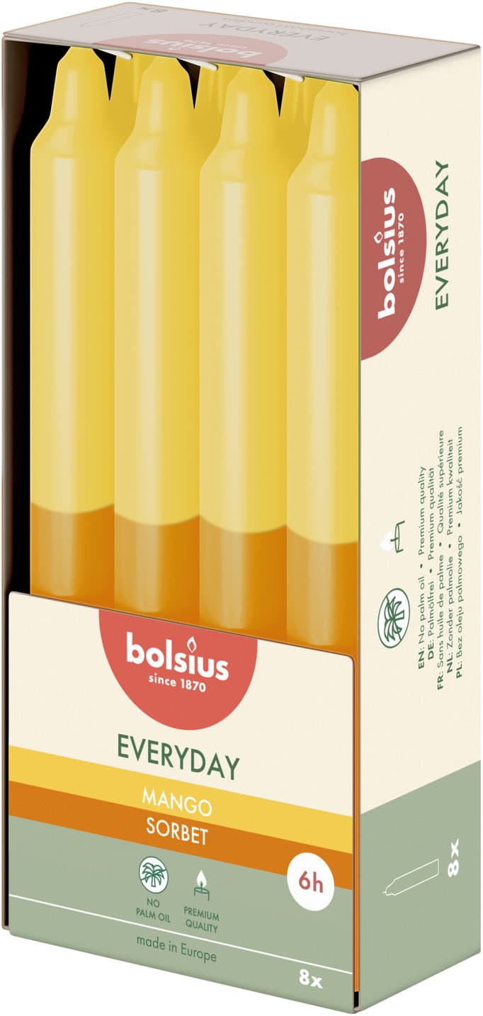 Diese gelbe Bolsius Everyday Mango Sorbet-Dinnerkerze brennt ganze 6 Stunden. Premiumqualität, hergestellt ohne Palmöl. Erlebe die verführerische Mischung aus reifen Mangos und saftiger Passionsfrucht – ganz bequem bei dir zu Hause. So genießt du ganz einfach jeden Tag ein bisschen mehr Atmosphäre!