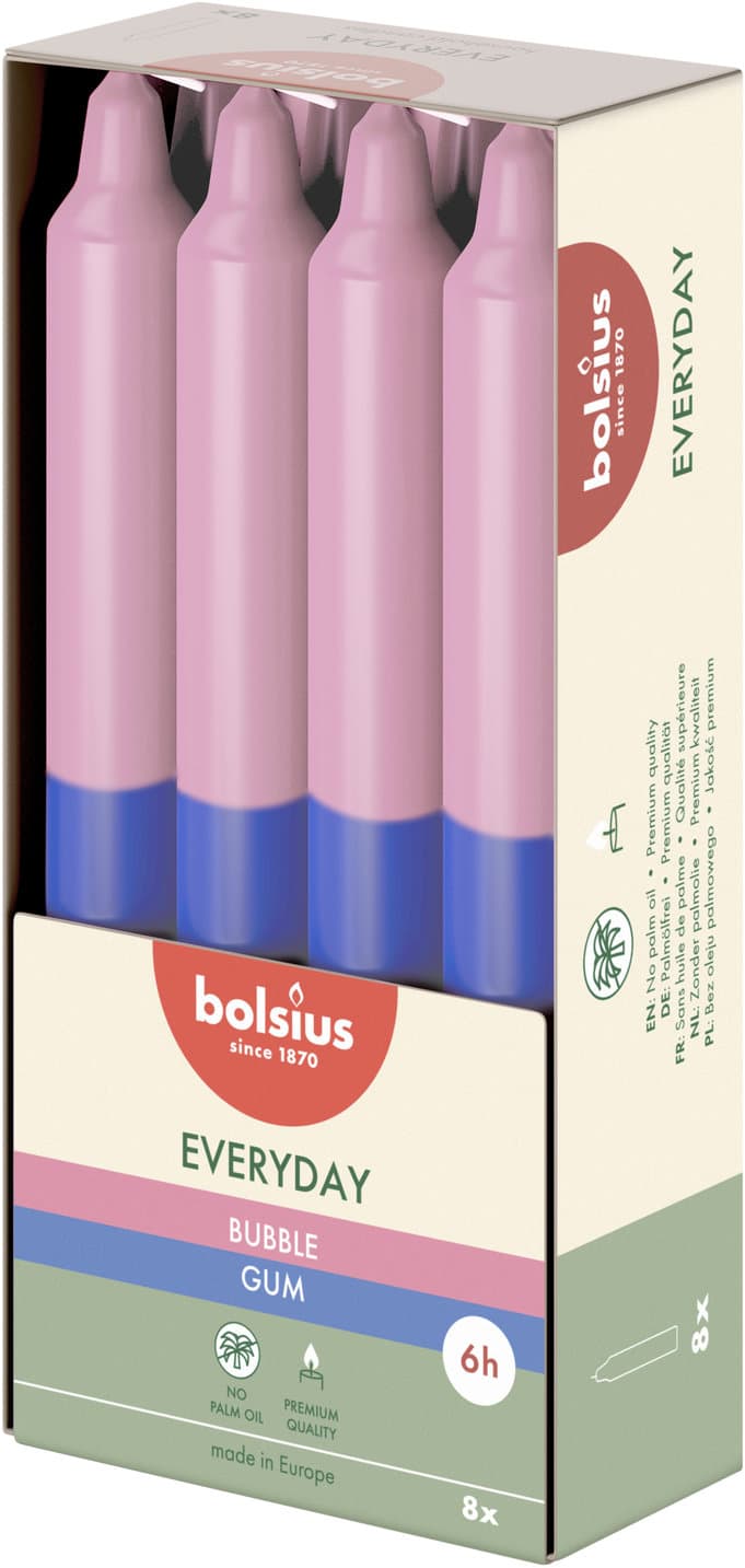 Diese rosa-blaue Bolsius Everyday Bubble Gum-Dinnerkerze brennt ganze 6 Stunden. Premiumqualität, hergestellt ohne Palmöl. Eine fruchtige Mischung aus reifen Himbeeren und saftigen Erdbeeren – ganz bequem bei dir zu Hause. So genießt du ganz einfach jeden Tag ein bisschen mehr Atmosphäre!