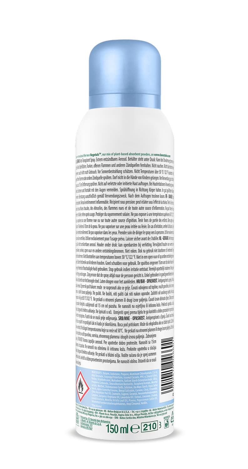 Das Borotalco® Deo Spray Fresh Non-Stop Powder Fresh bietet ein extra trockenes Hautgefühl mit erfrischender Duft-Reaktivierung – für ein langanhaltendes Frische-Gefühl