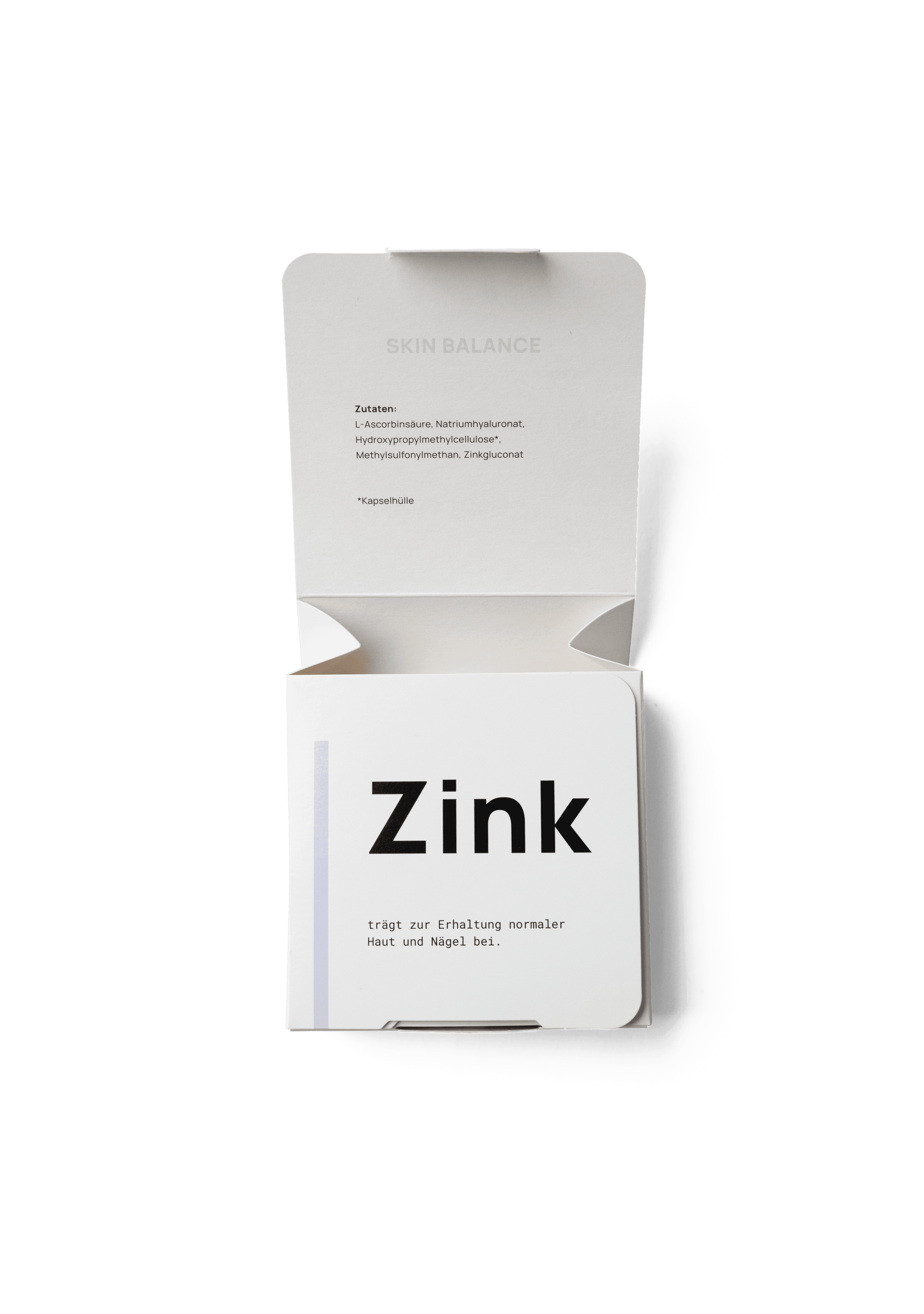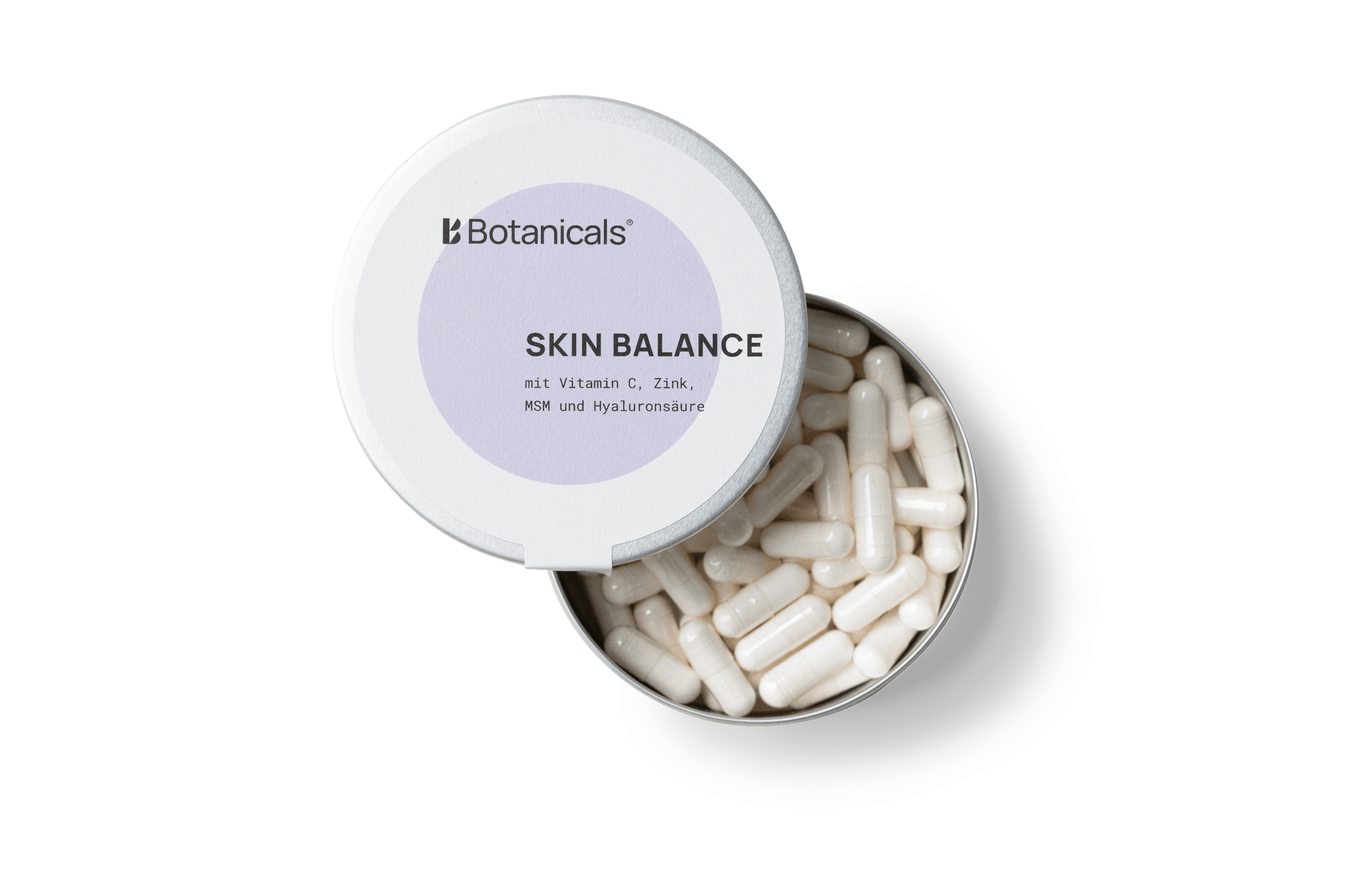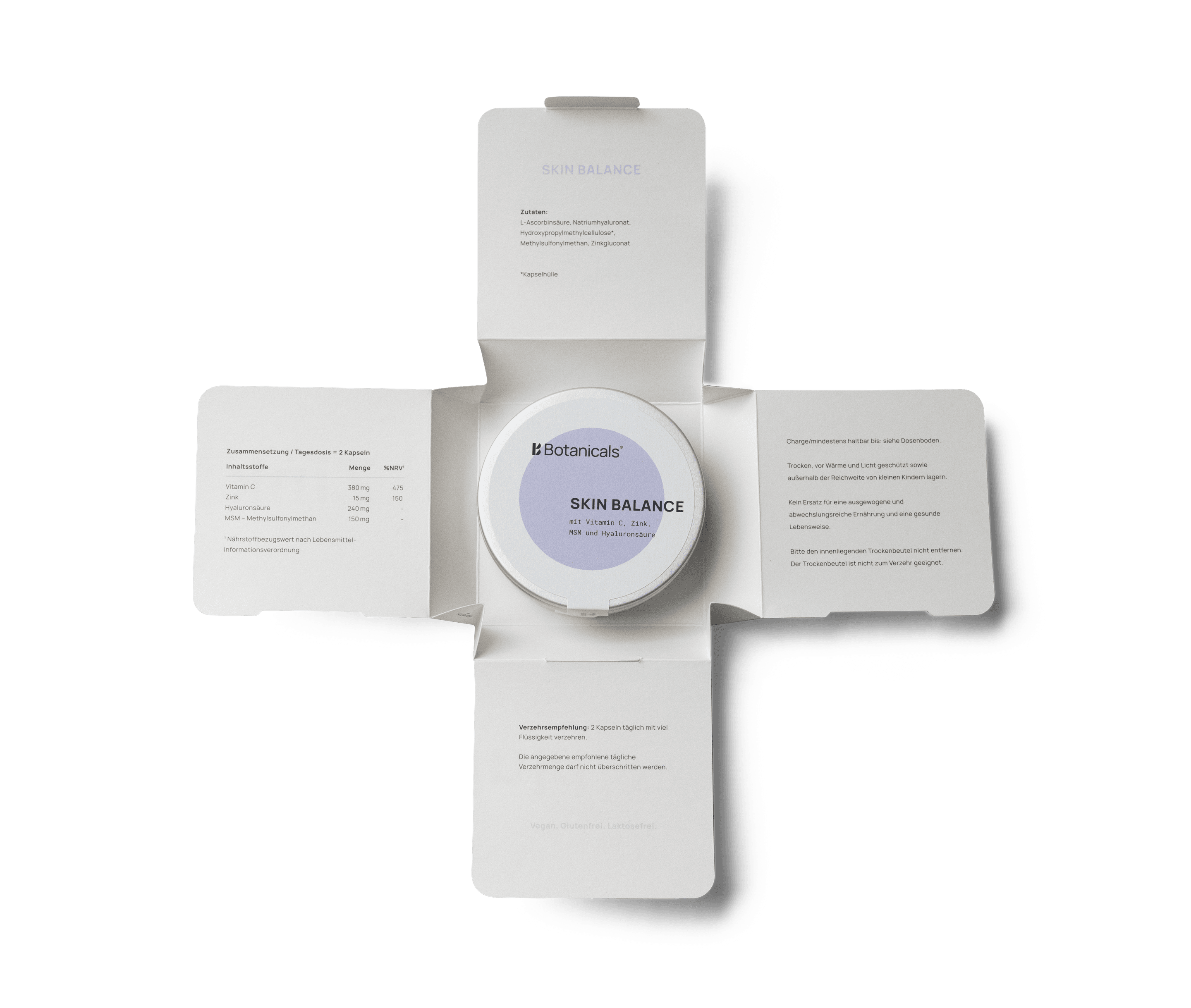 Nahrungsergänzungsmittel: Die Haut ist ein wichtiges Schutzschild gegen äußere Einflüsse. Sie kann jedoch durch verschiedene Faktoren aus dem Gleichgewicht geraten, wie zum Beispiel Umweltbelastungen, Stress, ungesunde Ernährung oder hormonelle Veränderungen. Besonders oxidativer Stress, verursacht durch freie Radikale, kann die Hautzellen schädigen, das Hautbild beeinflussen und vorzeitige Alterszeichen wie Faltenbildung begünstigen. In solchen Phasen benötigt die Haut besondere Unterstützung, um ihre natürliche Balance und Gesundheit zu erhalten. Skin Balance kombiniert wertvolle Inhaltsstoffe, die dazu beitragen können, die Haut von innen zu unterstützen und ihre natürliche Ausstrahlung zu fördern. Vitamin C trägt zur normalen Kollagenbildung bei, was für die Erhaltung der Hautfunktion wichtig ist. Zink hilft dabei, die Haut in einem normalen Zustand zu erhalten und schützt sie vor oxidativem Stress. Hyaluronsäure ist bekannt für ihre feuchtigkeitsspendenden Eigenschaften und kann so die Hautelastizität unterstützen. MSM (Methylsulfonylmethan) liefert organischen Schwefel, der eine zentrale Rolle in der Struktur von Haut, Haaren und Nägeln spielt.