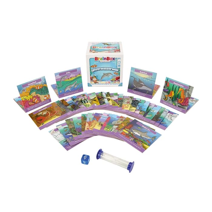 Jede Karte zeigt Bilder von faszinierender Lebewesen, vom niedlichen Clownfisch bis zu den farbenprächtigen Korallen, und vom gewaltigen Buckelwal bis zu den verspielten Delfinen. Auf der Rückseite jeder Karte stehen dazu sechs Fragen zum jeweiligen Thema auf der Vorderseite. Die BrainBox fördert spielerisch die Beobachtungs- und Erinnerungsfähigkeit der Kinder.