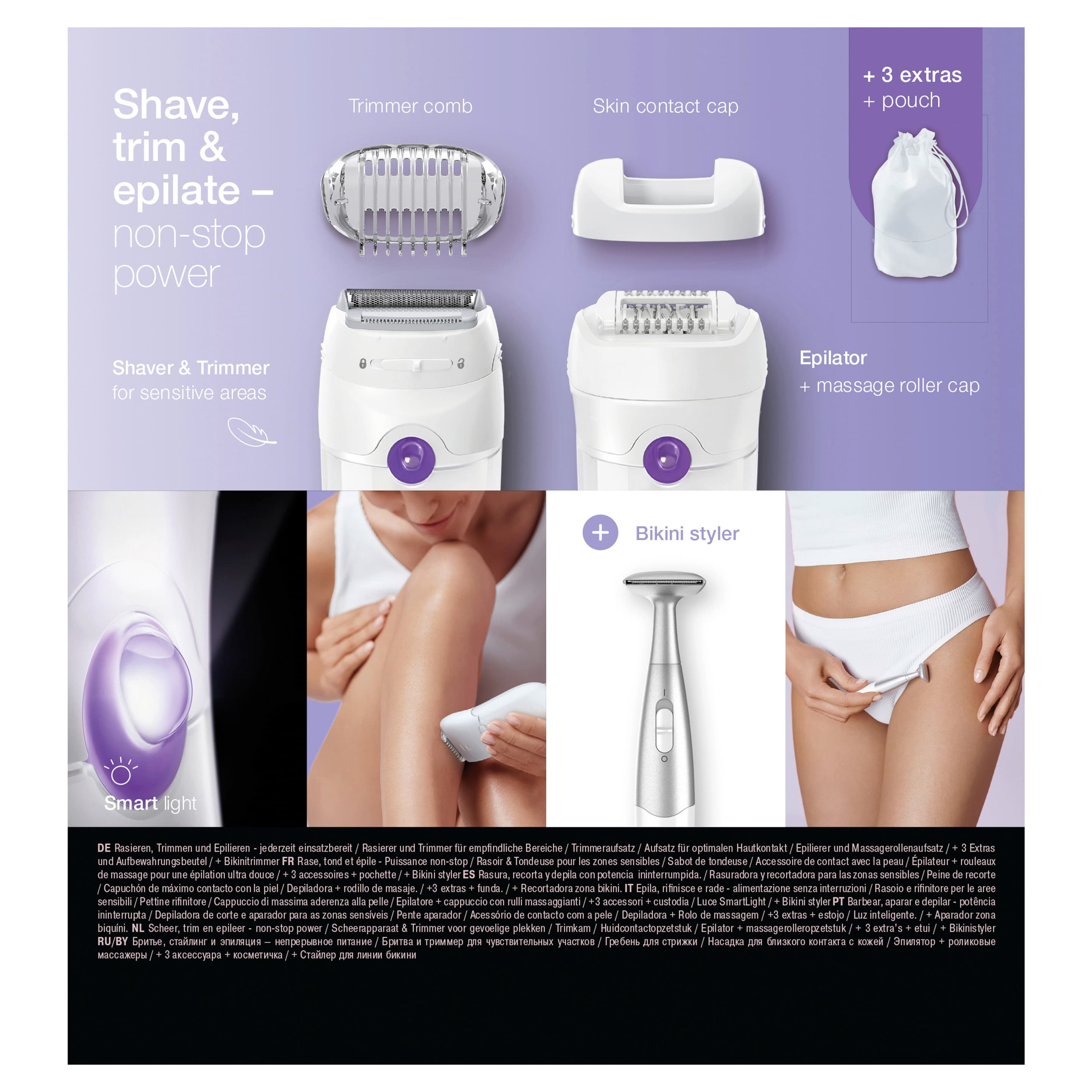| Lieferumfang | 1x Epilierer 1x Rasieraufsatz 1x Trimmeraufsatz 1x Bikinitrimmer 1x Reinigungsbürste 1x Ladekabel 1x AAA Batterie 1x Aufsatz für optimalen Hautkontakt |