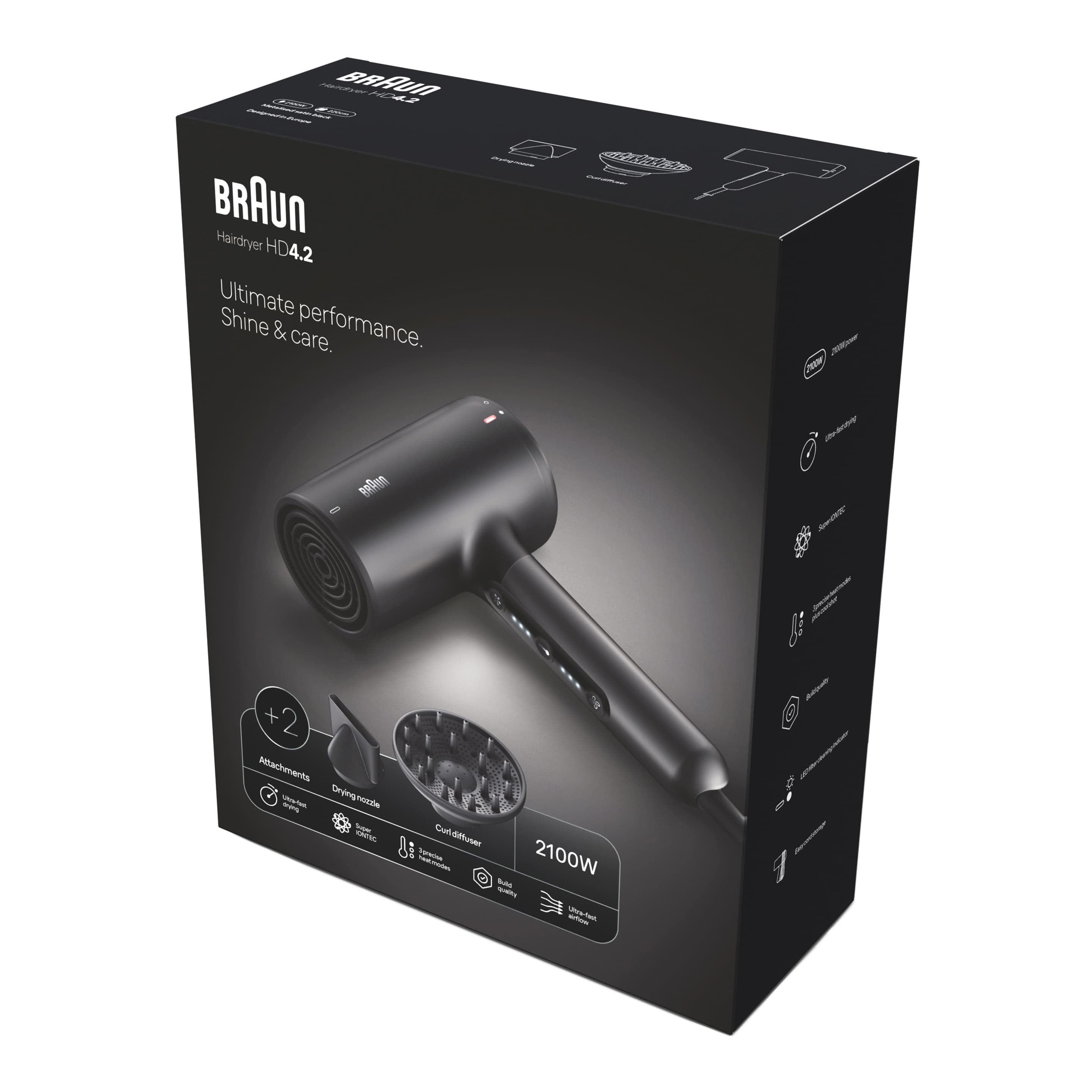 Der leistungsstarke Braun Haartrockner HD4.2 mit 2100 W und innovativem HTDC-Motor liefert einen ultrapräzisen Hochgeschwindigkeits-Luftstrom und eine schnellere Trocknungsleistung als herkömmliche Haartrockner.