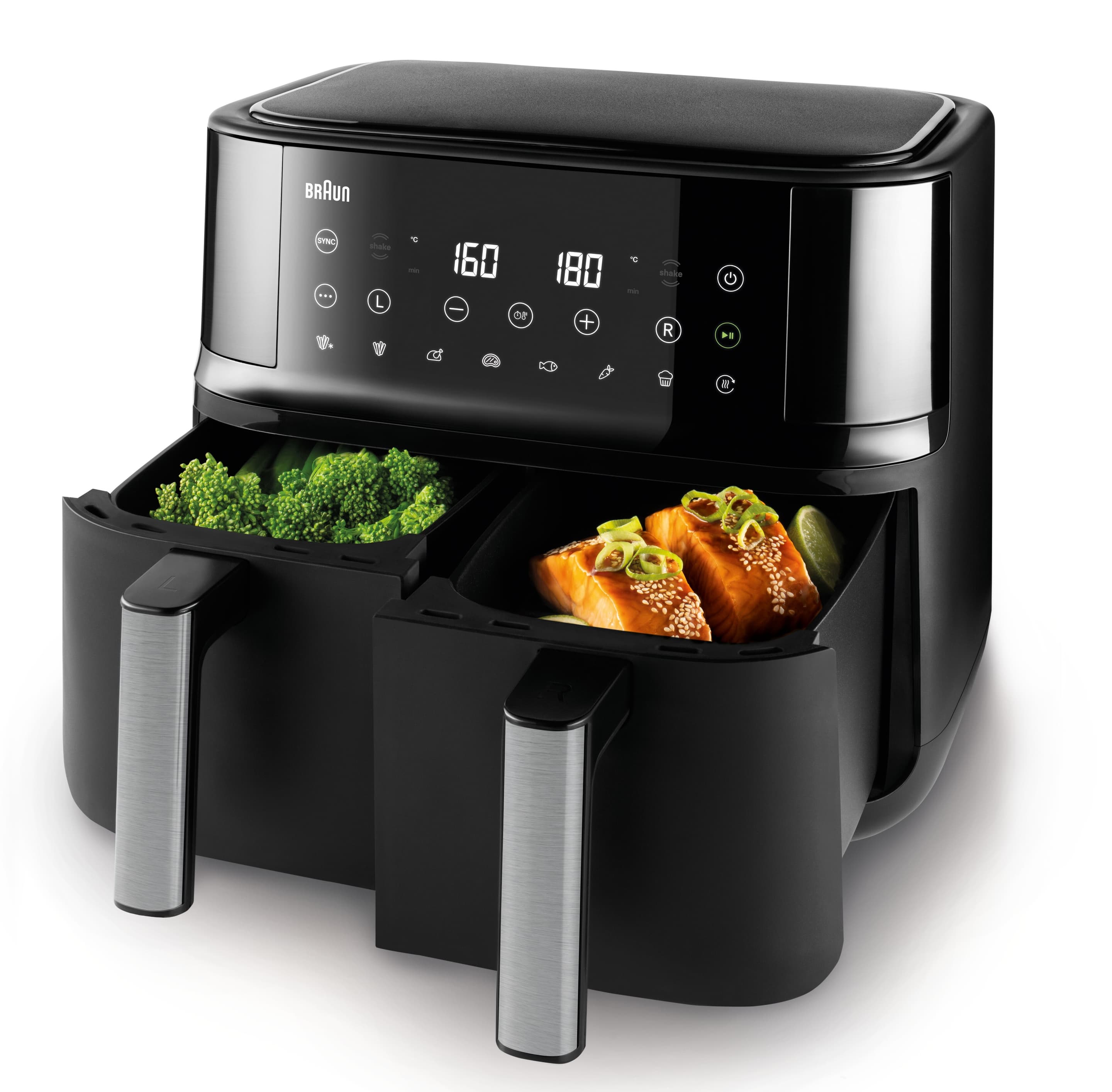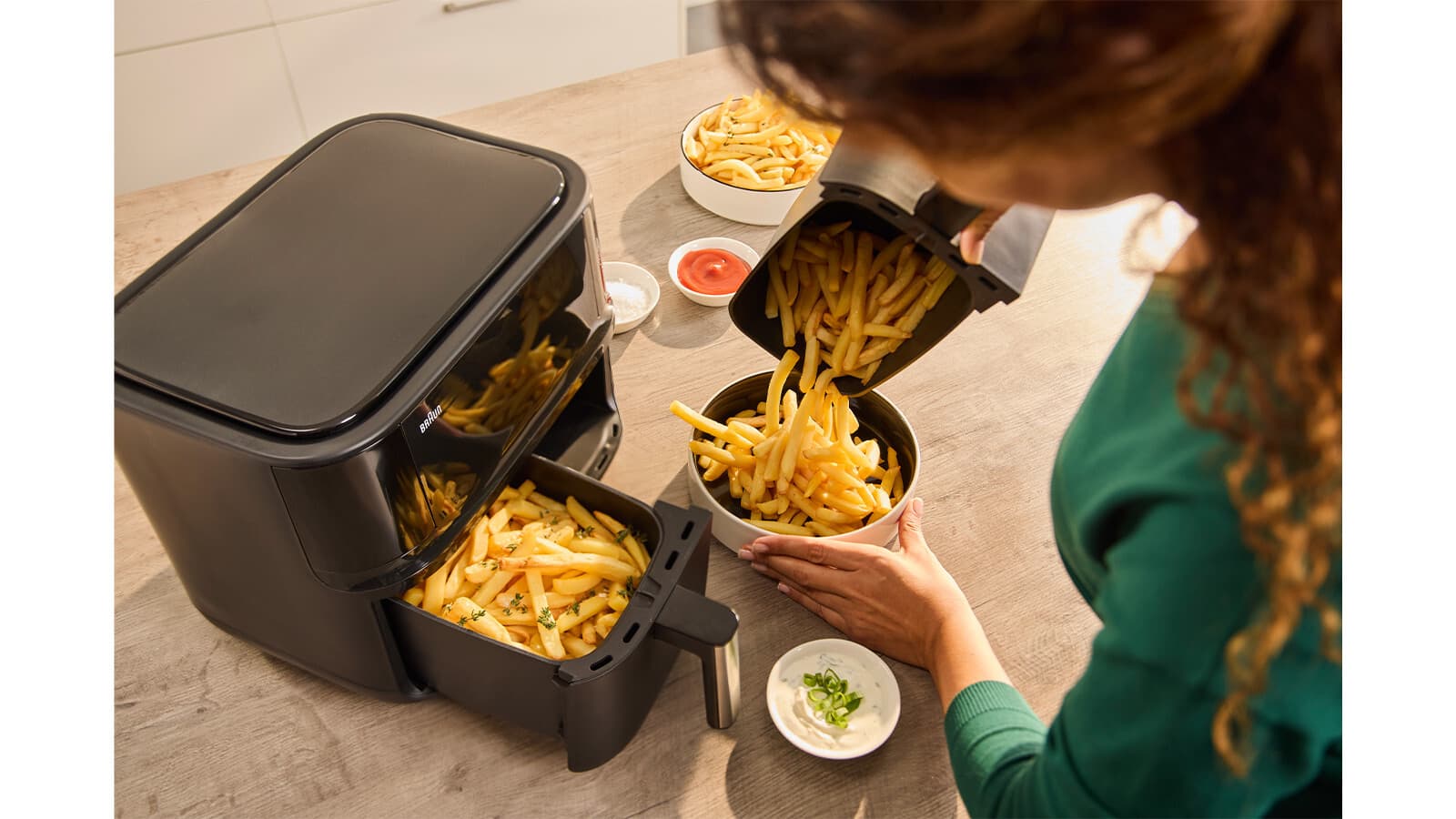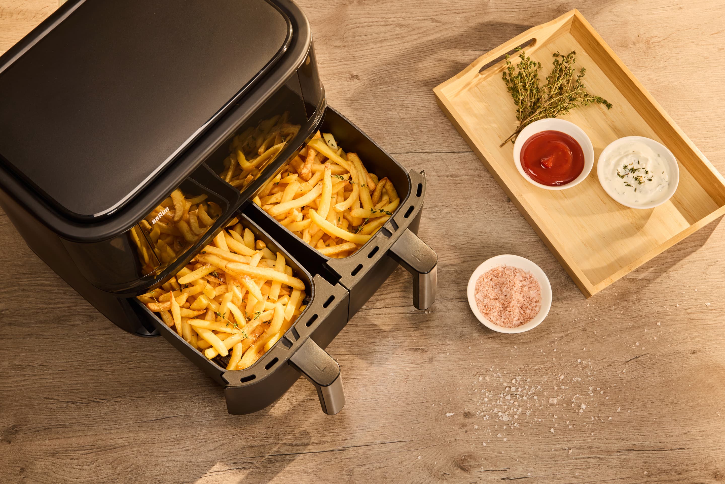 Genieße eine komplette Mahlzeit – mit der Braun TwinCook 3 Heißluftfritteuse kannst du zwei verschiedene Gerichte auf einmal zubereiten und so eine komplette Mahlzeit 50% schneller* genießen. Die Sync Funktion übernimmt das perfekte Timing. Mit nur einem Knopfdruck sind beide Gerichte gleichzeitig fertig, trotz unterschiedlicher Zubereitungszeiten. Die RealAir Technologie sorgt für köstlichen Geschmack – mit bis zu 90% weniger Fett**. Und die spülmaschinengeeigneten Garkörbe machen die Reinigung zum Kinderspiel.