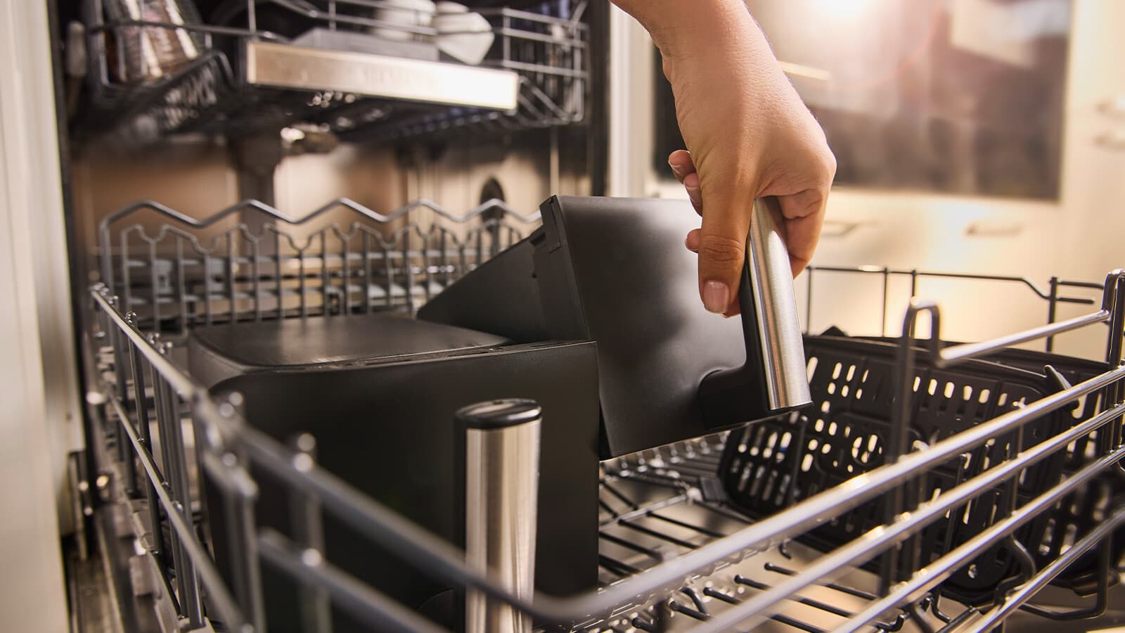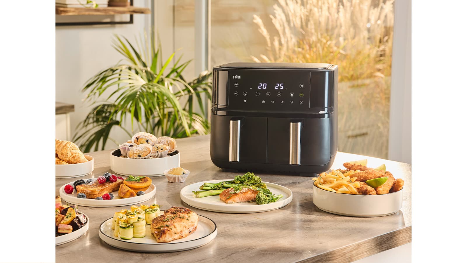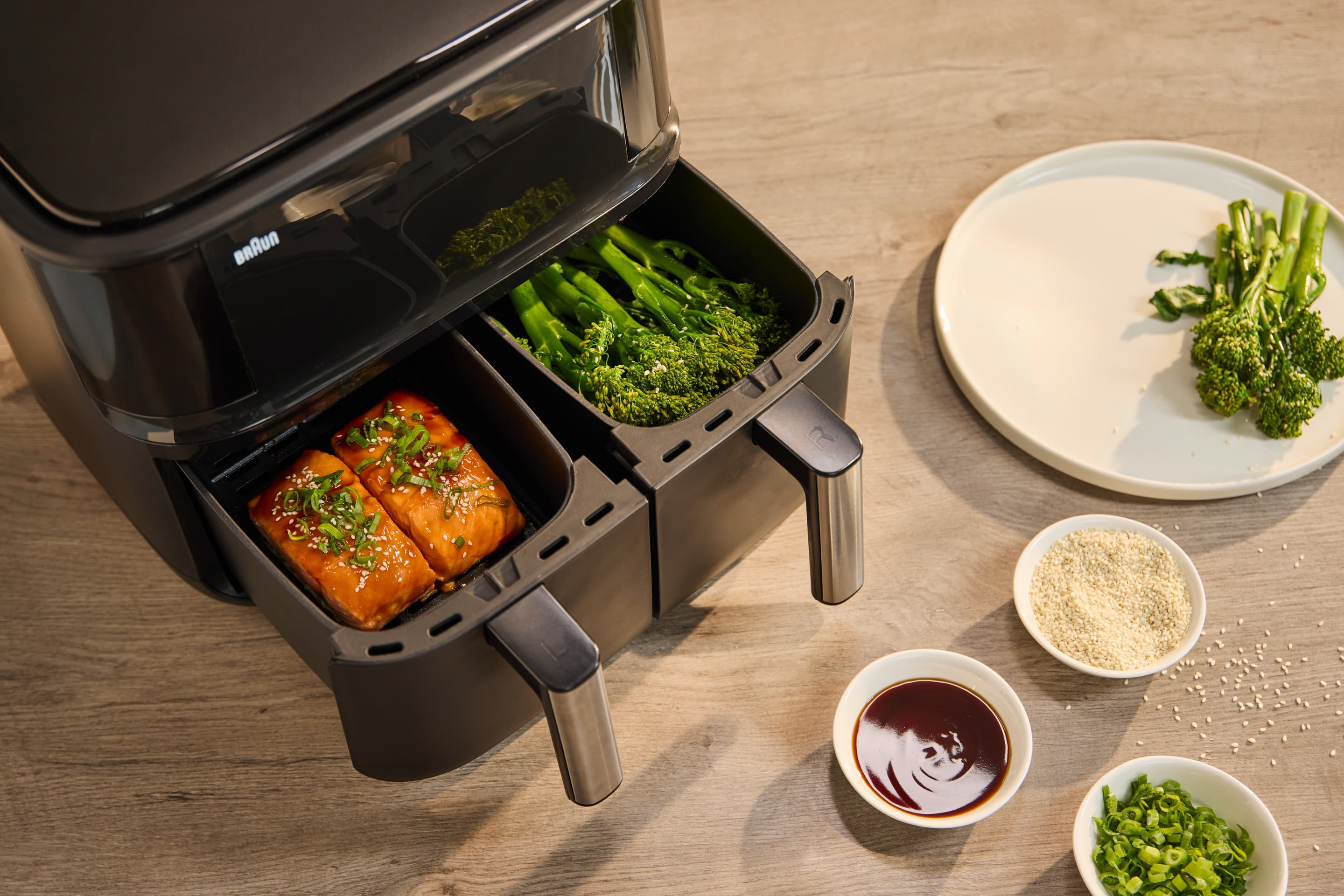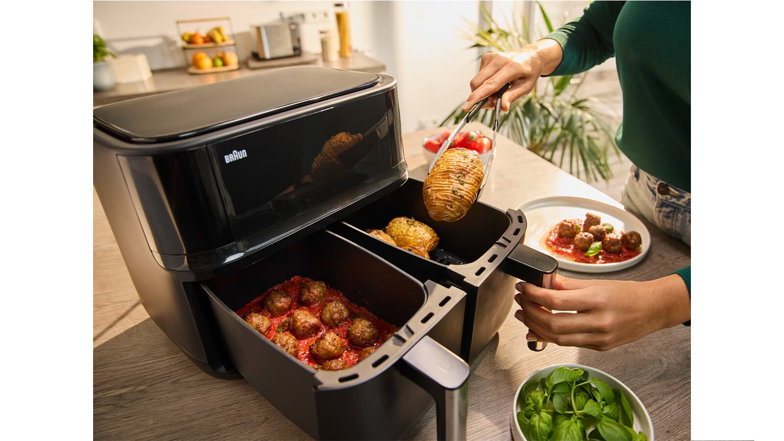 Genieße eine komplette Mahlzeit – mit der Braun TwinCook 3 Heißluftfritteuse kannst du zwei verschiedene Gerichte auf einmal zubereiten und so eine komplette Mahlzeit 50% schneller* genießen. Die Sync Funktion übernimmt das perfekte Timing. Mit nur einem Knopfdruck sind beide Gerichte gleichzeitig fertig, trotz unterschiedlicher Zubereitungszeiten. Die RealAir Technologie sorgt für köstlichen Geschmack – mit bis zu 90% weniger Fett**. Und die spülmaschinengeeigneten Garkörbe machen die Reinigung zum Kinderspiel.