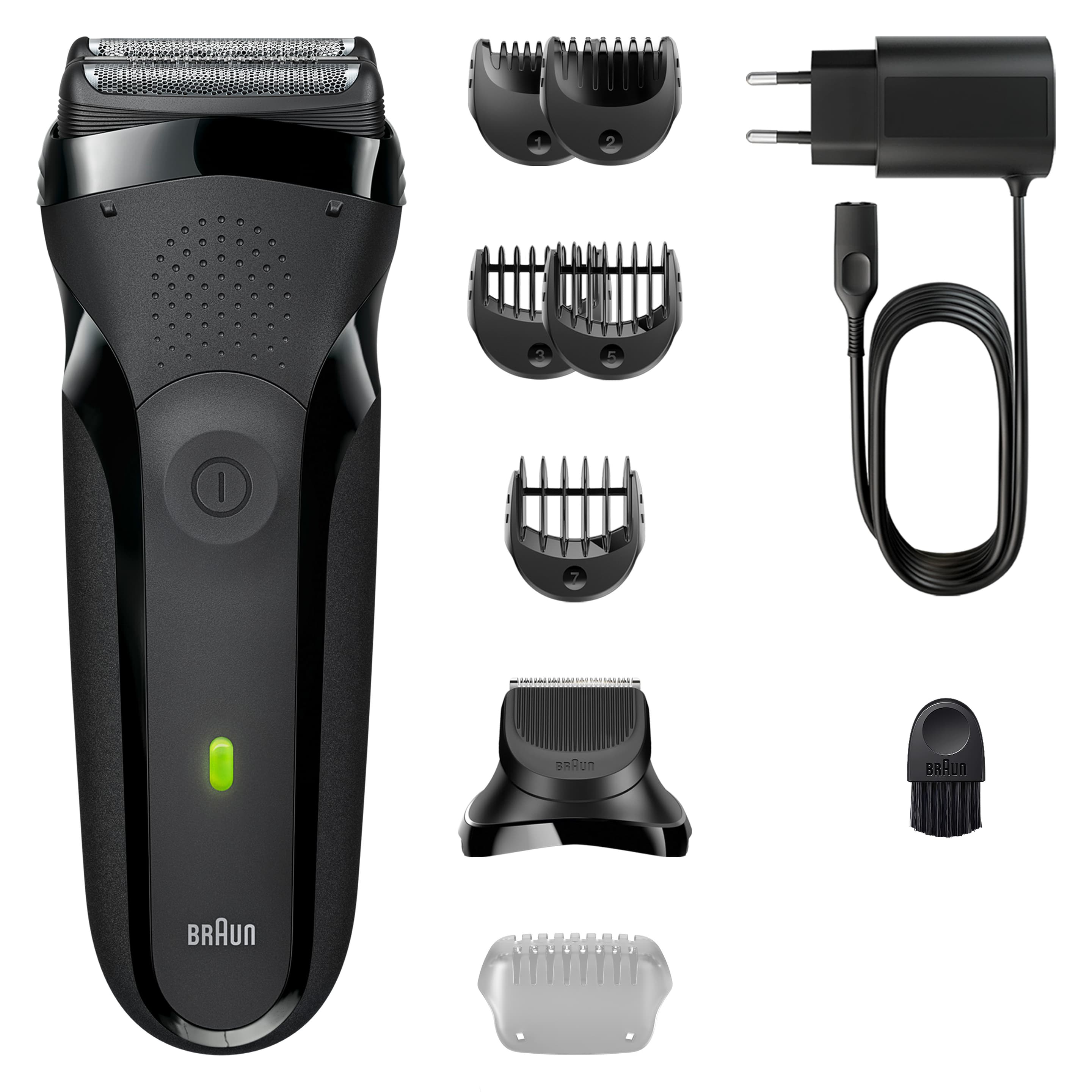 Der Braun Series 3 Elektrorasierer bietet eine gründliche und glatte Rasur mit 2 Scherfolienelementen und 1 zentralen Mitteltrimmer zum Schneiden von längeren Haaren. Die flexiblen Klingen passen sich an, um den Konturen deines Gesichts zu folgen. Der Barttrimmer Aufsatz ermöglicht eine präzise Kontur von Koteletten oder Schnurrbärten. Der schmale Rasierkopf bietet eine einfache Rasur auch in schwer erreichbaren Bereichen. Der Series 3 Elektrorasierer für Männer ist wasserdicht. Designed in Deutschland (Kronberg im Taunus). Lieferumfang: 1x Braun Series 3 Rasierer, 1x Schutzkappe, 1x Barttrimmer-Aufsatz, 5 Kammaufsätze