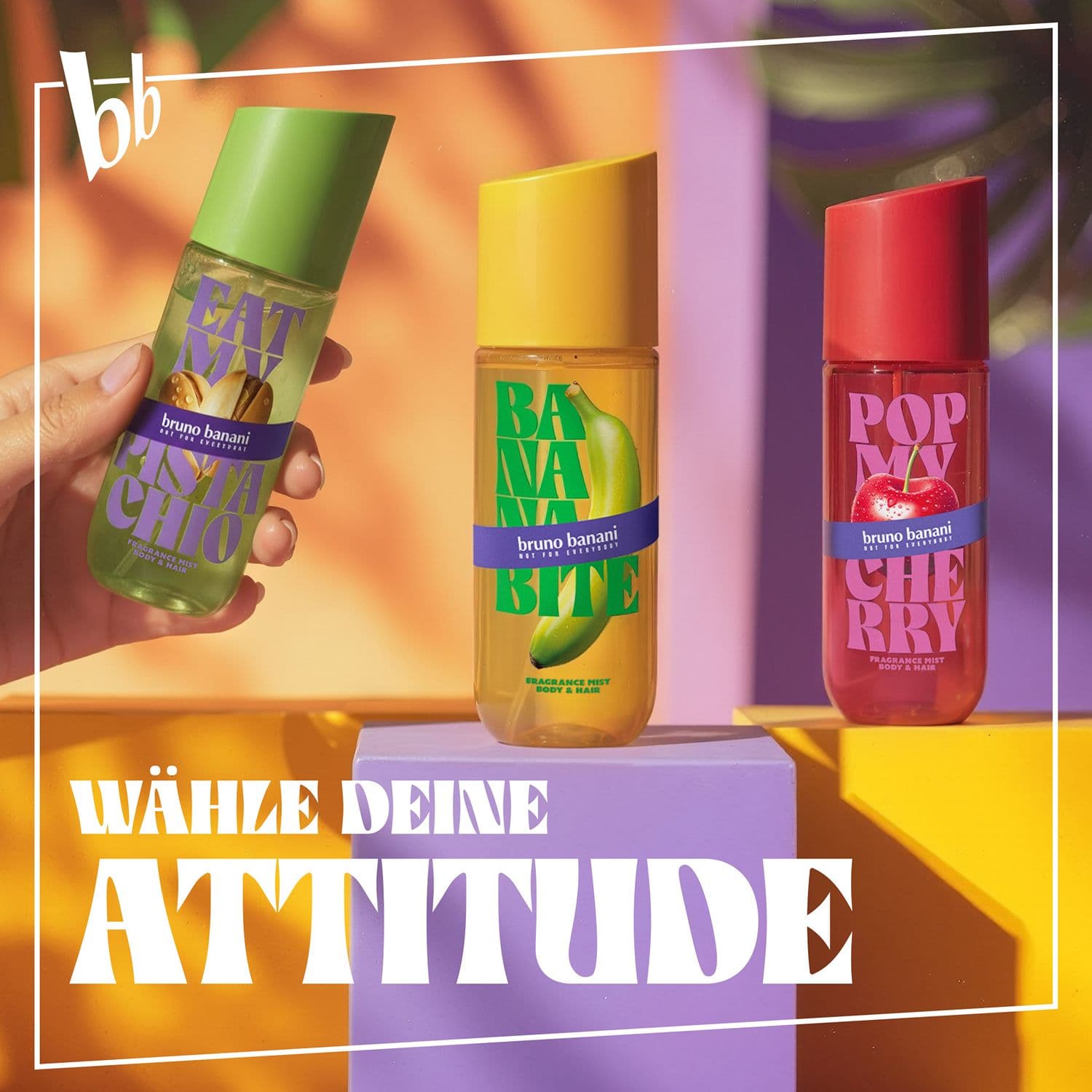 Erlebe die süchtig machenden Body & Hair Mists von bruno banani – für jede Stimmung, jeden Moment und jeden Main Character Vibe. Diese Body & Hair Mists sind mehr als nur ein Duft: Sie sind Attitude in a Bottle und passend für jeden Vibe. Von einem Flirt am Nachmittag bis hin zu unvergesslichen Nächten. Wähle den Duft, der zu deiner Stimmung passt und sprühe ihn von Kopf bis Fuß auf. Ideal für eine schnelle Auffrischung zwischendurch, vom Gym am Morgen bis hin zum Drink am Abend. Träumst du von einer Pistazien-Vanille-Verführung? Eat My Pistachio ist ein unwiderstehlicher, ambrierter Gourmand-Duft, der an samtiges Pistazieneis erinnert. Knusprig geröstete Mandeln und Kardamomessenz eröffnen den Duft, bevor er in ein genussvolles Herz aus Pistazie und Sesamakkord übergeht. Zart abgerundet durch warme Vanille und Praline. Zum Anbeißen gut!