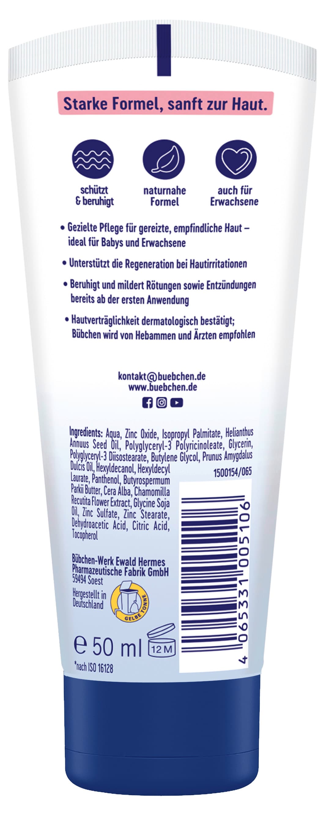 | Inhaltsstoffe | Aqua, Zinc Oxide, Isopropyl Palmitate, Helianthus Annuus Seed Oil, Polyglyceryl-3 Polyricinoleate, Glycerin, Polyglyceryl-3 Diisostearate, Butylene Glycol, Prunus Amygdalus Dulcis Oil, Hexyldecanol, Hexyldecyl Laurate, Panthenol, Butyrospermum Parkii Butter, Cera Alba, Chamomilla Recutita Flower Extract, Glycine Soja Oil, Zinc Sulfate, Zinc Stearate, Dehydroacetic Acid, Citric Acid, Tocopherol |