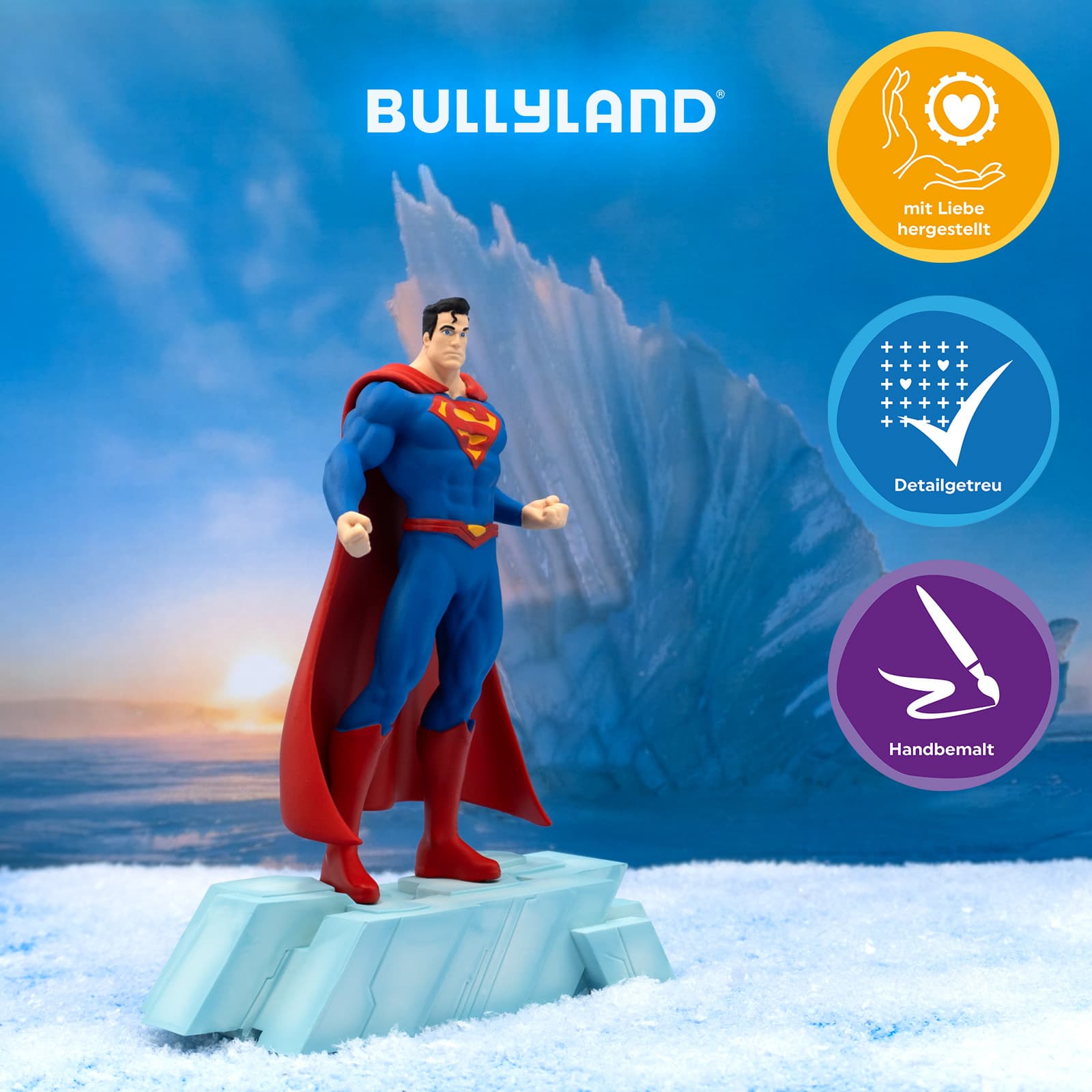 SPIELSPASS ZUM SAMMELN. Unsere Spielfiguren eignen sich für Groß und Klein. Clark Kent lebt in Metropolis uns wacht als Superman über die Stadt. Mit übermenschlicher Stärke, der Kraft des Fliegens und seinem unerschütterlichen Sinn für Gerechtigkeit schützt er die Menschheit. Tauchen Sie mit Superman ein, in die faszinierende Welt des DC Comics Superhelden Universum. Die Bullyland DC Superman Figur bringt den stärksten Superhelden des DC‑Universums direkt ins Spiel‑ oder Sammlerregal. Mit einer Höhe von ca. 15 cm zeigt die liebevoll handbemalte Spielfigur Superman in seiner klassischen Pose mit detailreicher Gestaltung und hochwertiger Verarbeitung.