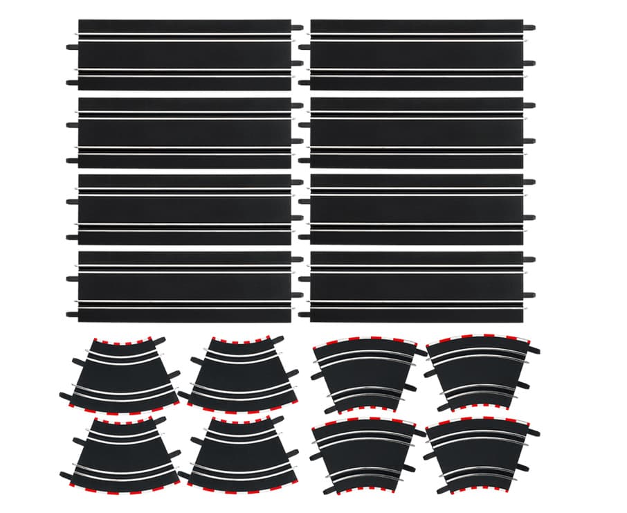 Jeder eingeschworene Carrera-Fan hegt und pflegt seine mit Liebe aufgebaute und ständig wachsende Rennbahn. Um diese noch besser, größer und spannender zu gestalten, kannst Du mit neuen Features und weiteren Streckenabschnitte Deine Carrera DIGITAL 143 Rennbahn erweitern. Mit diesem Ausbauset im Maßstab 1:43 erhältst Du acht Geraden mit einer Länge von 342 mm, vier 1/45° Kurven und vier 1/45° Steilkurven. Bei den 45 Grad Steilkurven sind Stützen vorhanden, um der steilen Kurve den nötigen Halt zu geben. Gestalte mit diesem Set Deine Rennstrecke um und füge neue Teile hinzu. Vor allem dieüber dem Boden liegenden Steilkurve wird Dir und Deinem Fahrzeug ein neues Fahrfeeling bescheren, das den Funfaktor oben hält.