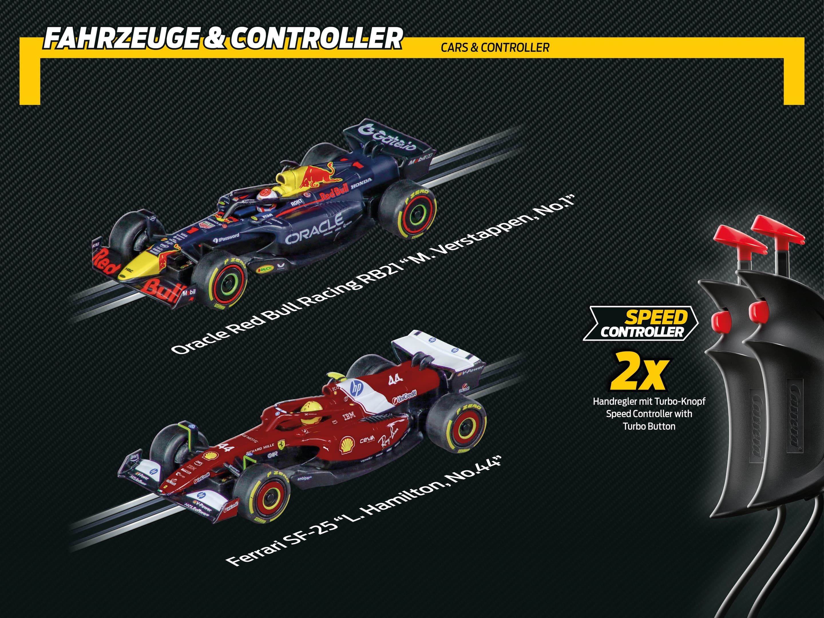 Mit dem Carrera GO!!! Speed Zone Set holst du dir packende Formel-1-Rennaction direkt ins Wohnzimmer! Auf der 6,3 Meter langen Rennstrecke liefern sich zwei Motorsport-Legenden – Max Verstappen im Oracle Red Bull Racing RB21 und Lewis Hamilton im Ferrari SF-25 – ein spannendes Kopf-an-Kopf-Rennen.