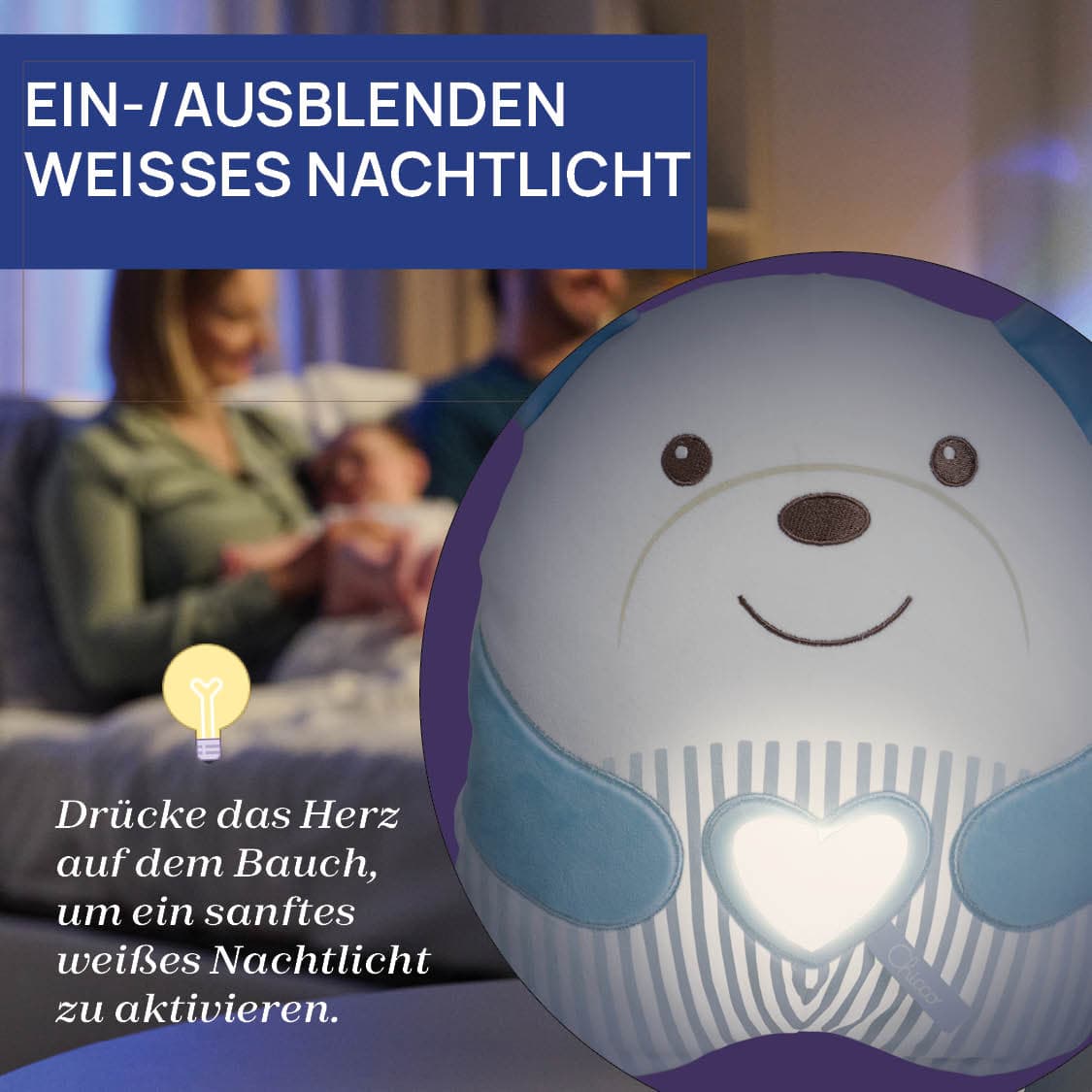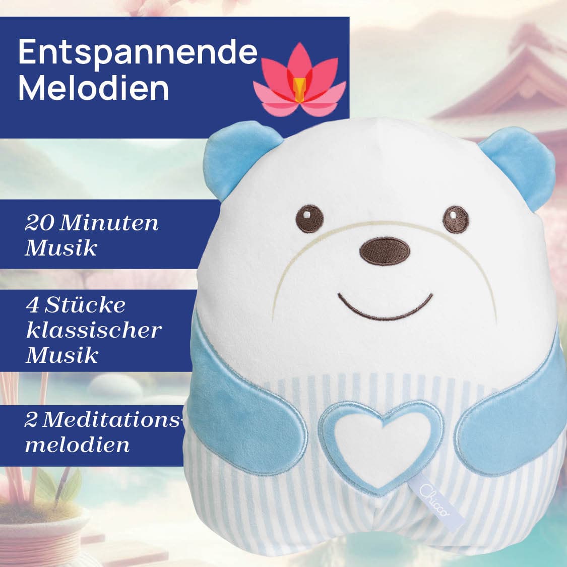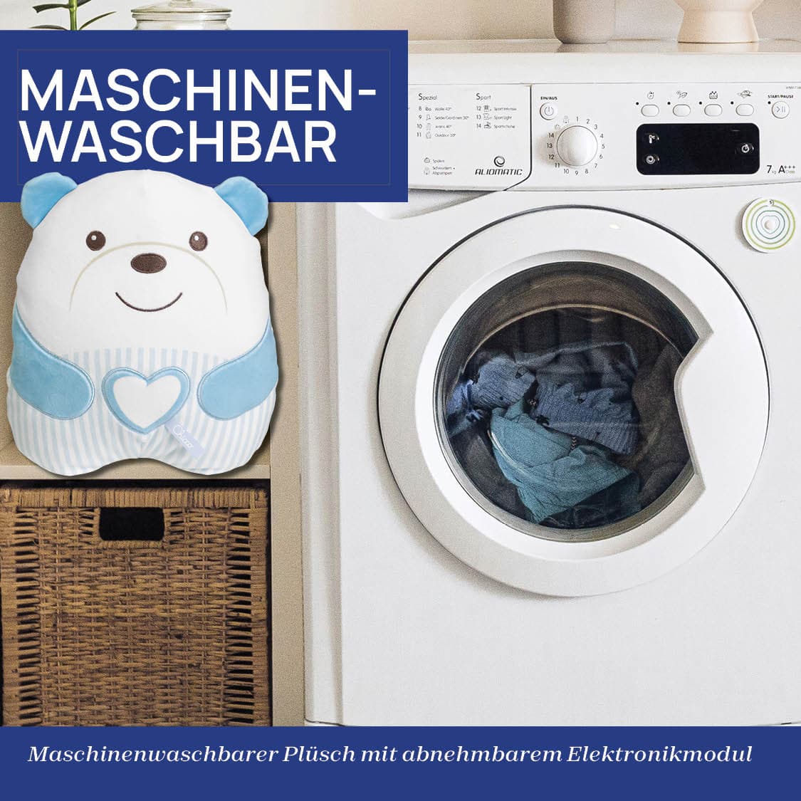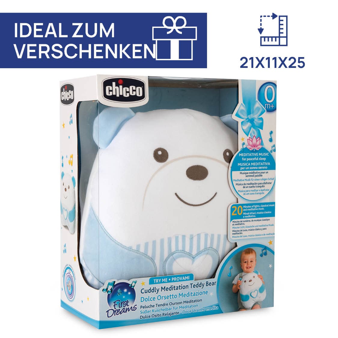 Süßer Kuschelbär: Sanfter Begleiter für entspannte Momente • Beruhigende Melodien: Der Kuschelbär spielt klassische Musik und Meditationsmelodien, die das Baby sanft beruhigen. Ein weiches, weißes Nachtlicht schafft eine entspannte Atmosphäre. • Sanftes Design: Kuscheliger Bär aus weichem Velours mit besonders softer Füllung. Seine kissenartige Form lädt Babys zum Kuscheln und Drücken ein. • Einfache Bedienung: Durch Drücken des herzförmigen Knopfes am Bauch startet ein 20-Minuten-Zyklus entspannender Melodien. Wähle eine Lieblingsmelodie, um das Baby sanft zu begleiten und eine tiefe Entspannung zu fördern. • Pflegeleicht: Der Kuschelbär ist maschinenwaschbar, nachdem das elektronische Modul entnommen wurde.