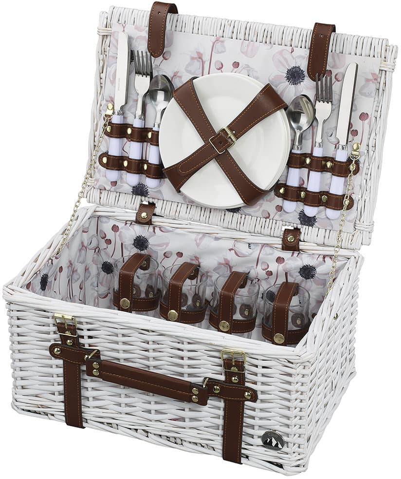 Der Picknickkorb für 4 Personen ist der ideale Begleiter für entspannte Ausflüge ins Grüne. Aus geflochtener Weide gefertigt, überzeugt er mit seinem klassischen und natürlichen Design. Die Ausstattung umfasst jeweils vier Löffel, Messer und Gabeln sowie vier Gläser und Teller, sodass einem stilvollen Picknick nichts im Weg steht.