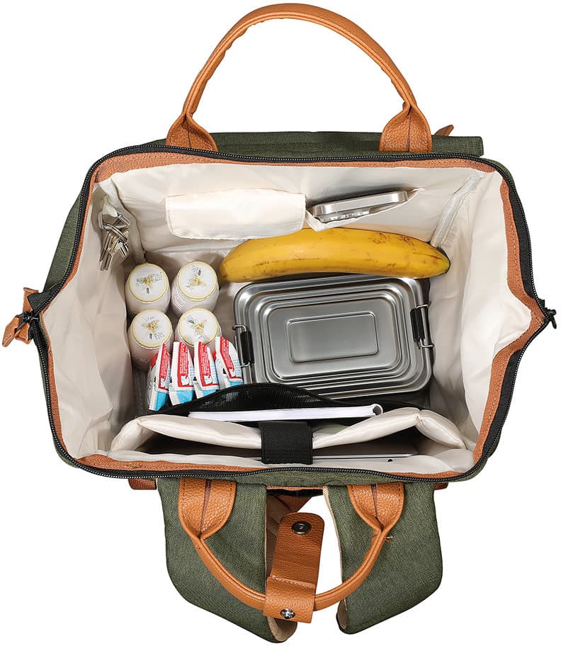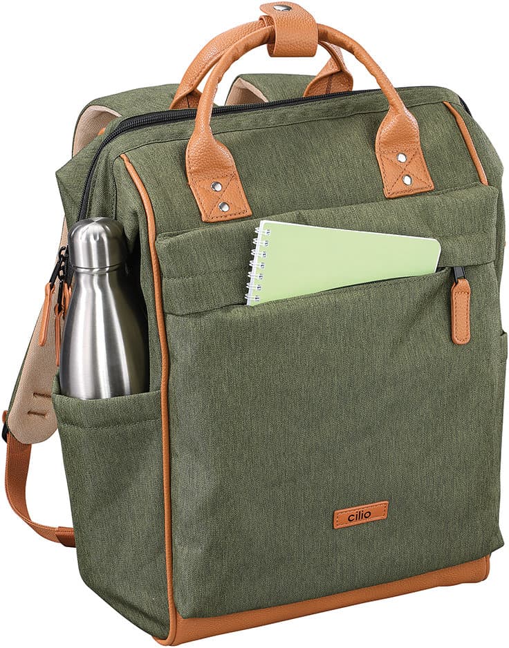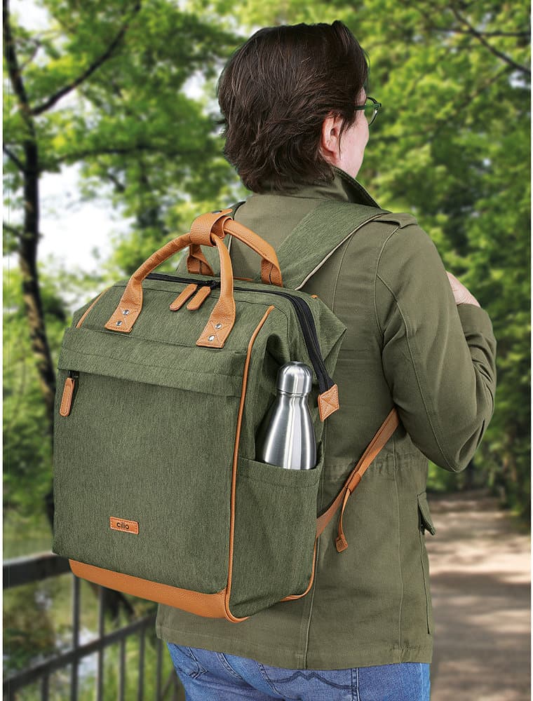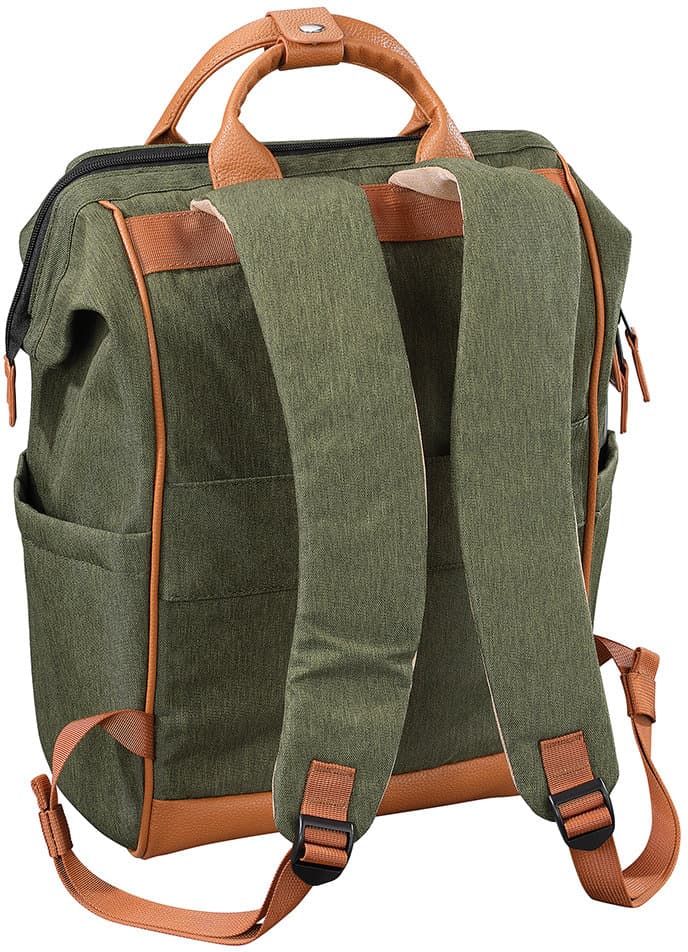 Dieser Rucksack überzeugt durch strapazierfähigen Polyester mit gewachster, wasserabweisender Oberfläche und ist bei Bedarf einfach feucht abwischbar. Der Boden aus Kunstleder sorgt zusätzlich für Stabilität und Langlebigkeit. Dank der großen, metallverstärkten Öffnung mit praktischem 2-Wege-Reißverschluss lässt sich der Innenraum bequem erreichen. Für hohen Tragekomfort sorgen die verstellbaren, gepolsterten Schultergurte sowie die stabilen Tragegriffe mit Verschluss aus Kunstleder. Trotz seiner robusten Verarbeitung besitzt der Rucksack ein angenehm geringes Eigengewicht. Praktische Aufbewahrungsmöglichkeiten bieten eine Fronttasche mit Reißverschluss, zwei seitliche Taschen (Höhe: 21 cm) sowie ein verdecktes Reißverschlussfach auf der Rückseite. Im großzügigen Innenraum befinden sich ein gepolstertes Tablet- bzw. Laptopfach (29 x 27 cm) mit Klettriemen, ein zusätzliches Netzfach, eine Einstecktasche, eine Klappentasche mit Klettverschluss sowie ein Karabinerhaken für Schlüssel und andere Kleinigkeiten. Die Innenbeschichtung schützt vor Feuchtigkeit und ermöglicht eine einfache Reinigung. Mit einem Fassungsvermögen ist der Rucksack ein funktionaler und vielseitiger Begleiter für Alltag, Freizeit oder Reisen.