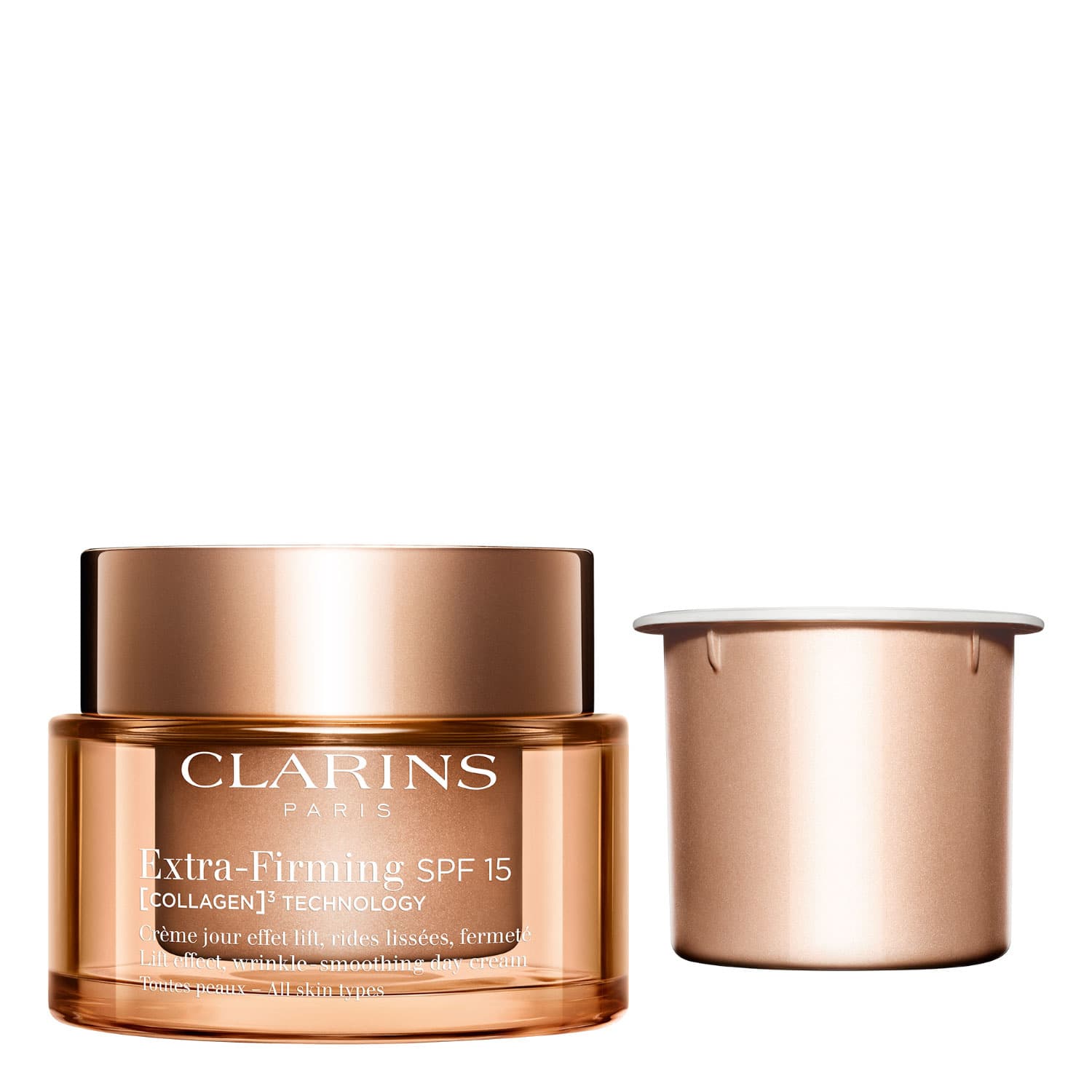 Diese straffende Tagescreme mit SPF 15 und der exklusiven Clarins Innovation [COLLAGEN]³ TECHNOLOGY liefert nachgewiesene High-Performance-Ergebnisse. Kollagen-Polypeptid + Pekannussbaum-Extrakt + Mitracarpus-Extrakt bilden ein leistungsstarkes Trio von Pro-Kollagen-Wikrkstoffen. Zusätzlich ist die Tagespflege mit Niacinamid angereichert. Es hilft, den Hautton auszugleichen und die Ausstrahlung der Haut zu verbessern. Die cremige Textur schenkt der Haut intensives Komfortgefühl und Schützt vor den negativen Auswirkungen von UV-Strahlen. Vereinfacht das anschließende Auftragen von Makeup.Durch die Verwendung dieses Refills für den Originaltiegel lässt sich die Umweltbelastung signifikant senken.