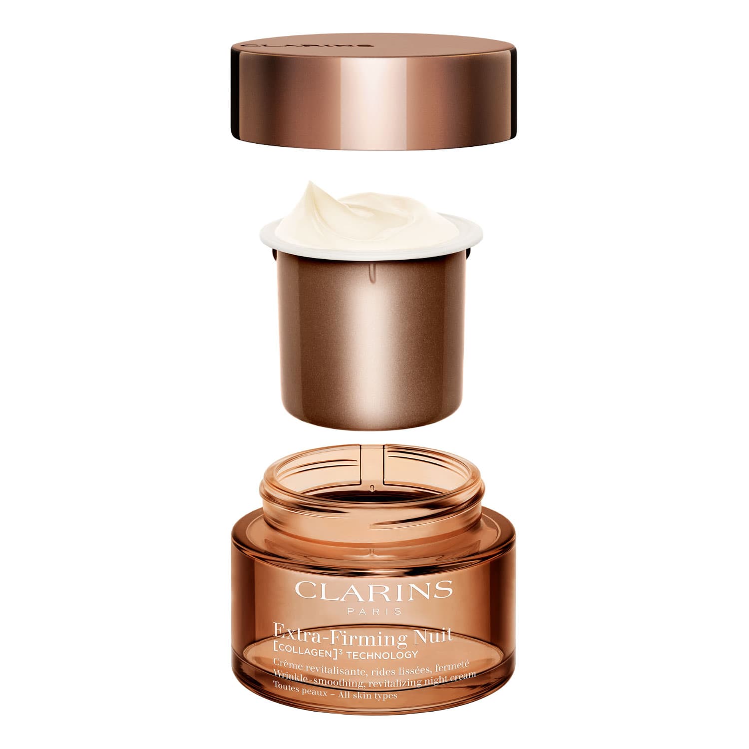 Diese straffende Nachtcreme mit der exklusiven Clarins Innovation [COLLAGEN]³ TECHNOLOGY liefert nachgewiesene High-Performance-Ergebnisse. Kollagen-Polypeptid + Pekannussbaum-Extrakt + Mitracarpus-Extrakt bilden ein leistungsstarkes Trio von Pro-Kollagen-Wikrkstoffen. Zusätzlich ist die Nachtpflege mit Peptiden aus der Avocado und Niacinamid angereichert, um die Jugendlichkeit der Haut zu fördern und die Ausstrahlung der Haut zu beleben. Die cremige Textur schenkt der Haut intensives Komfortgefühl und verbessert den Feuchtigkeitsgehalt der Haut.Der Tiegel ist nachfüllbar.