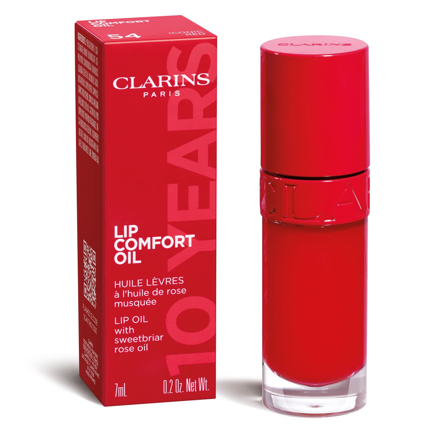 Anläßlich des 10-jährigen Jubiläums von Lip Comfort Oil erfindet Clarins das Lippenpflege-Öl in einer limitierten Auflage neu. Das typische Clarins Signature-Rot mit dem Namen "54 iconic red", ist auch eine Hommage an das Gründungsjahr der Marke. Zu diesem Anlass hat Clarins ein Design in einem leidenschaftlichen Look kreiert.