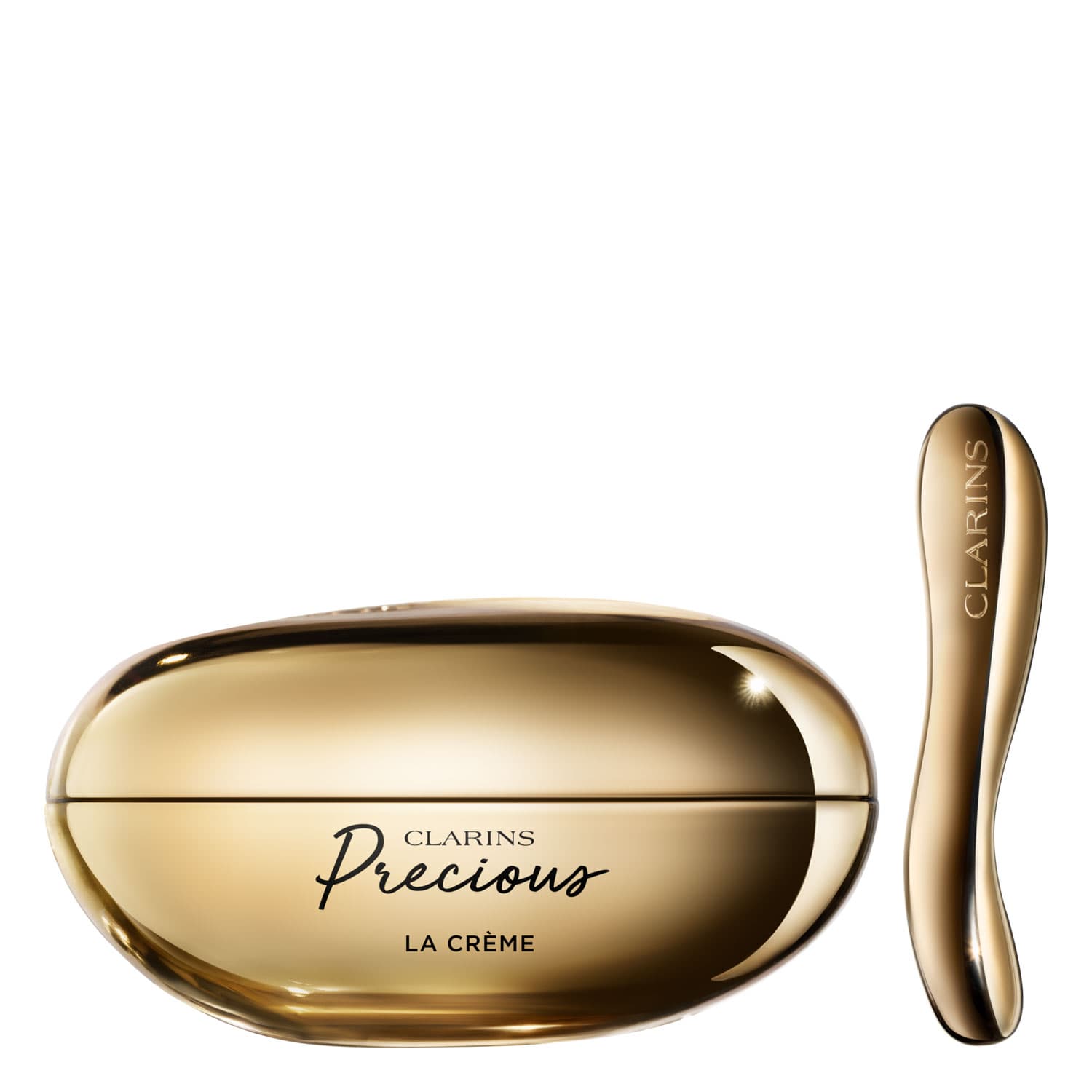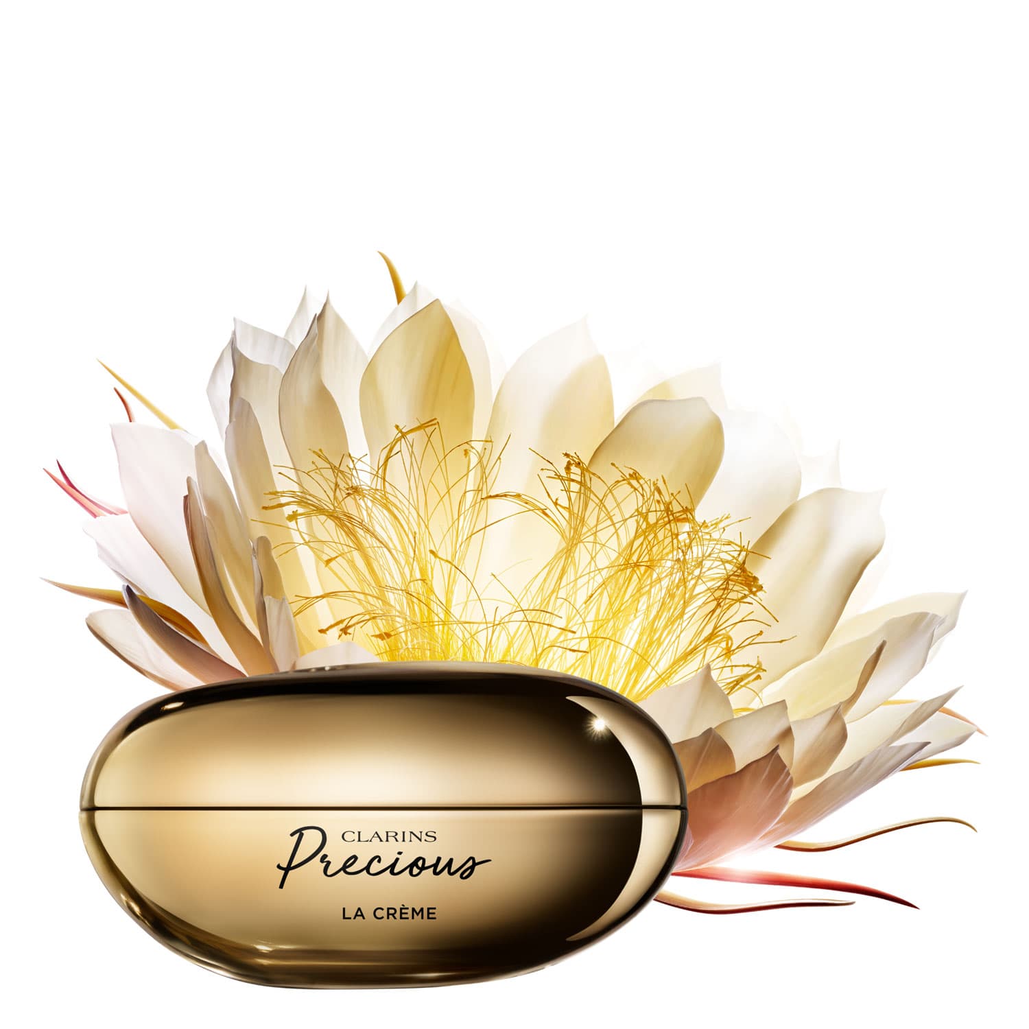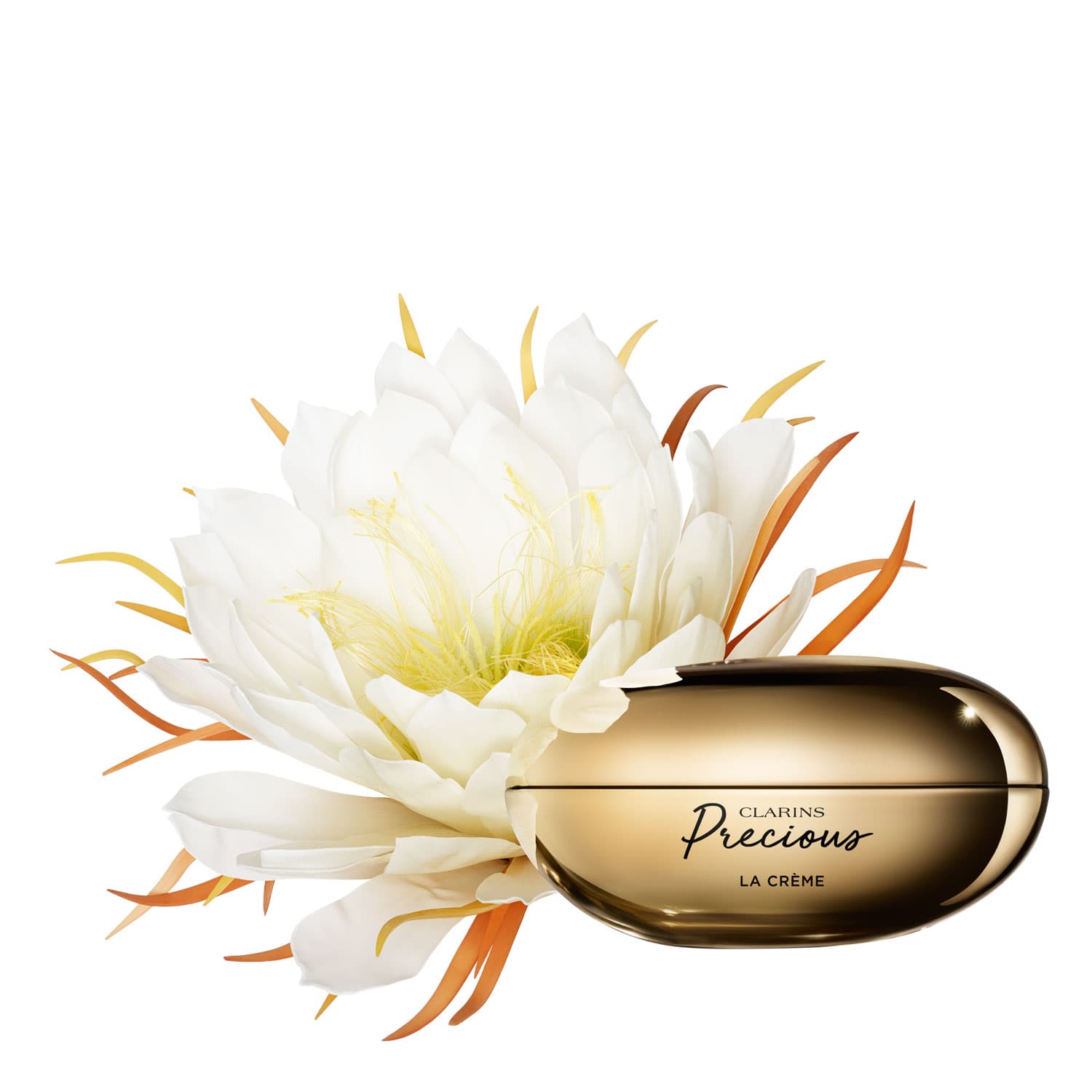 Clarins Precious La Crème ist eine außergewöhnliche Anti-Age Pflege, die über die Anti-Aging-Prävention hinaus eine echte aufbauende Wirkung bietet. Das Herzstück der Formel ist der Kryoxtrakt der Königin der Nacht und seine unglaubliche Fähigkeit, die Jugendlichkeit der Haut zu bewahren. Eine vorbeugende Anti-Aging-Wirkung, die durch ein Peptid-Trio mit verdichtenden und restrukturierenden Eigenschaften verstärkt wird, um die Zeichen der Zeit zu mildern und die Haut zu verdichten. Die Formel mit +90% Inhaltsstoffen natürlichen Ursprungs enthält Extrakte aus biologischer Goethe-Pflanze (regt den natürlichen Feuchtigkeitshaushalt an), Acerolasamen (lässt die Haut wieder strahlen) und biologischer Haferzucker für eine straffende Wirkung. Ein Vitamin C-Derivat hilft, das Auftreten von Pigmentflecken zu bekämpfen, und ein Seidenakazien-Extrakt hilft, die Ausstrahlung des Teints wiederherzustellen.