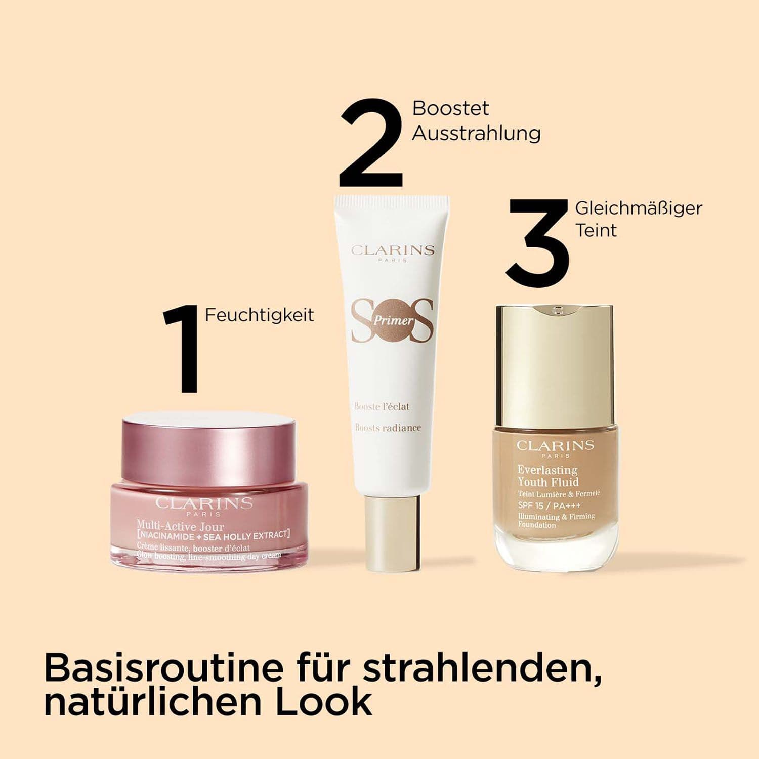 | Anwendungshinweis | Morgens auftragen, allein oder vor dem Auftragen von Makeup. Nach der üblichen Hautpflege auf das gesamte Gesicht auftragen. Alleine oder gemischt mit der flüssigen Foundation von Clarins verwenden. |