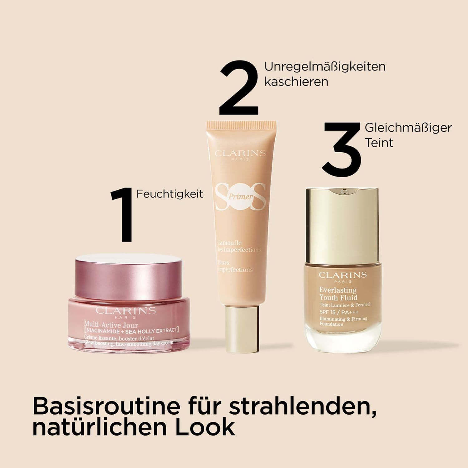 | Anwendungshinweis | Morgens auftragen, allein oder vor dem Auftragen von Makeup. Nach der üblichen Hautpflege auf das gesamte Gesicht auftragen. Alleine oder gemischt mit der flüssigen Foundation von Clarins verwenden. |