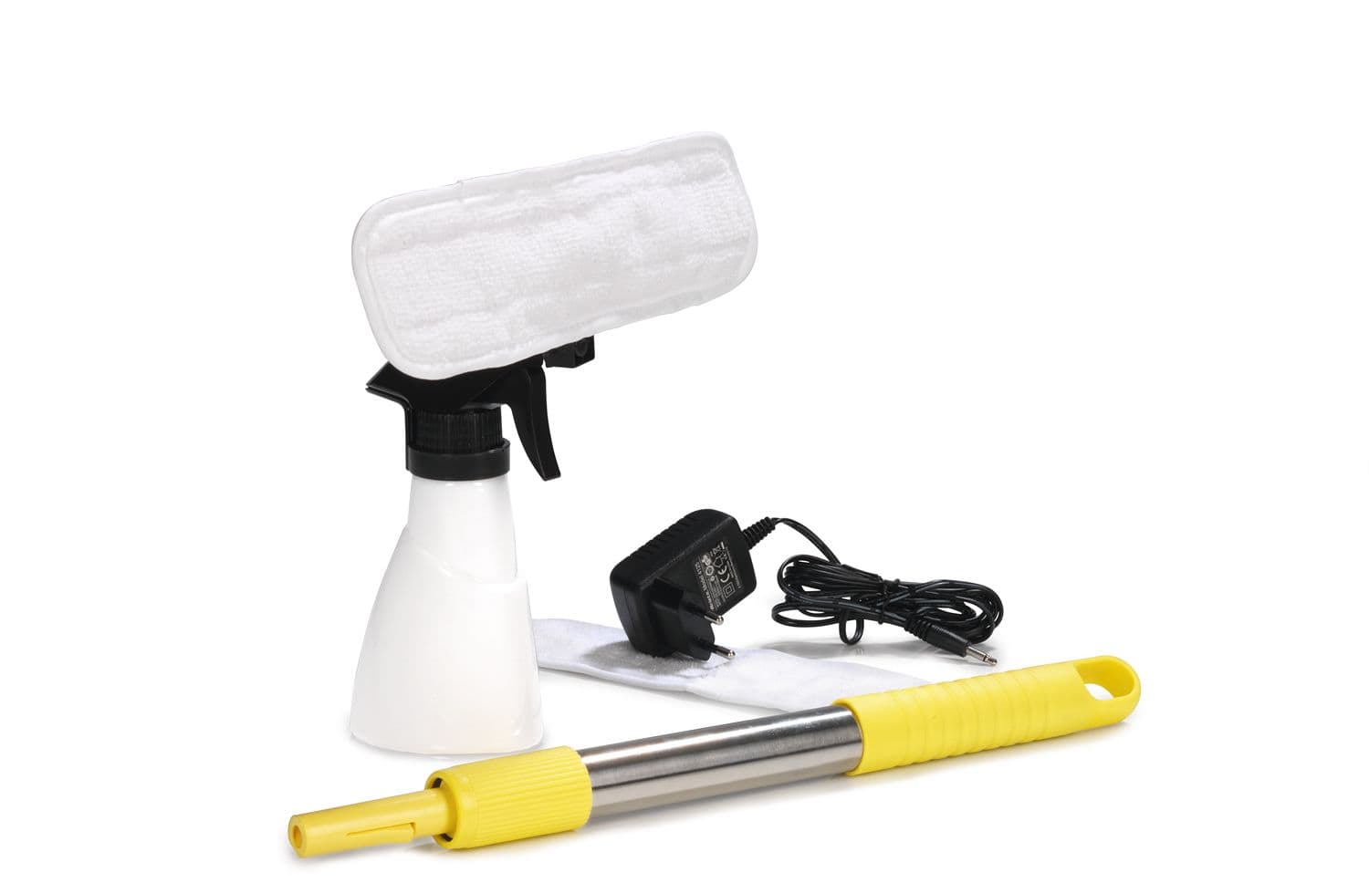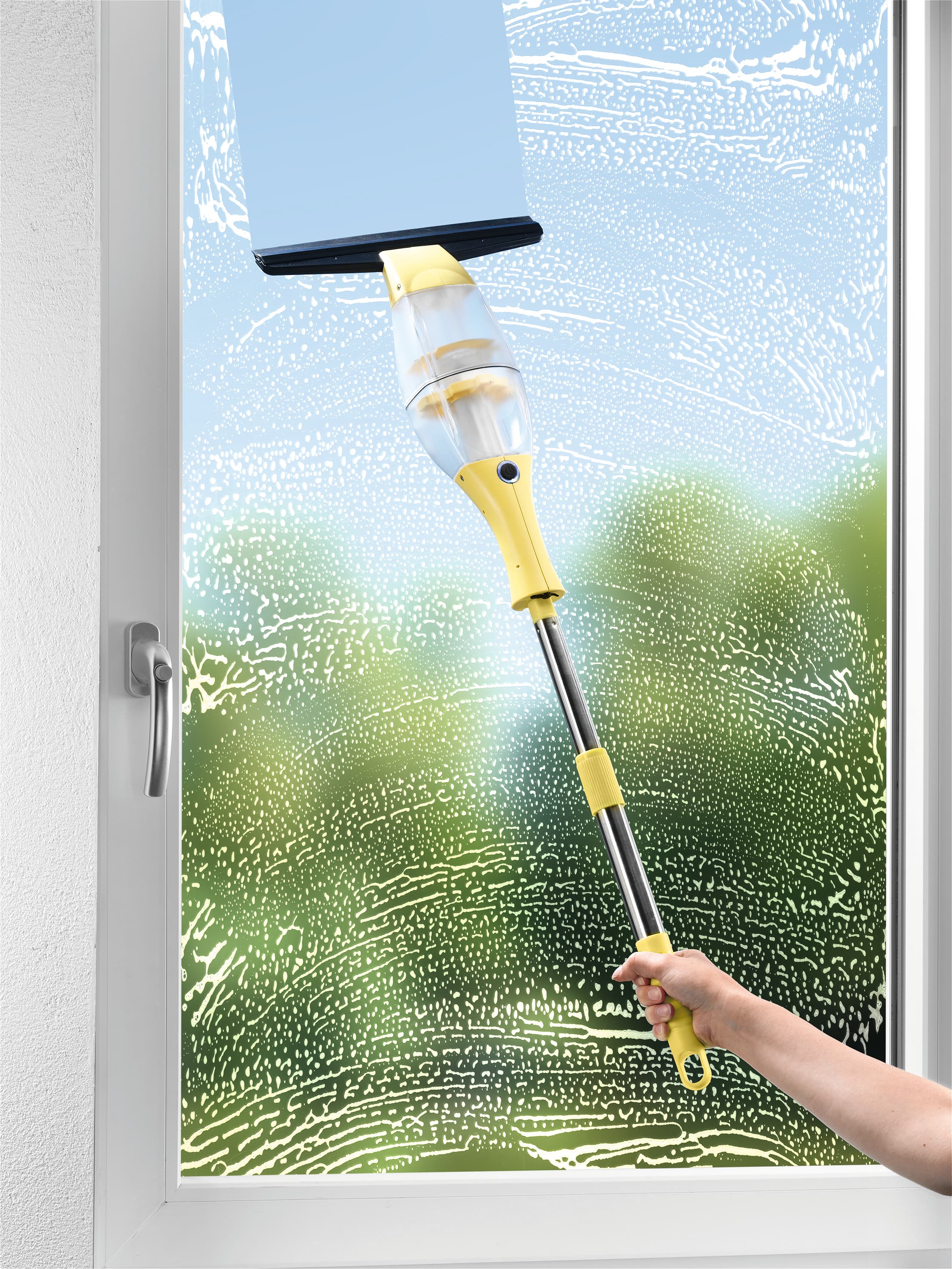| Lieferumfang | 1x Fensterreiniger, 1x Sprühflasche, 1x Verlängerungsstange, 2x Wischtücher, 1x Abzieher mit Gummilippe |