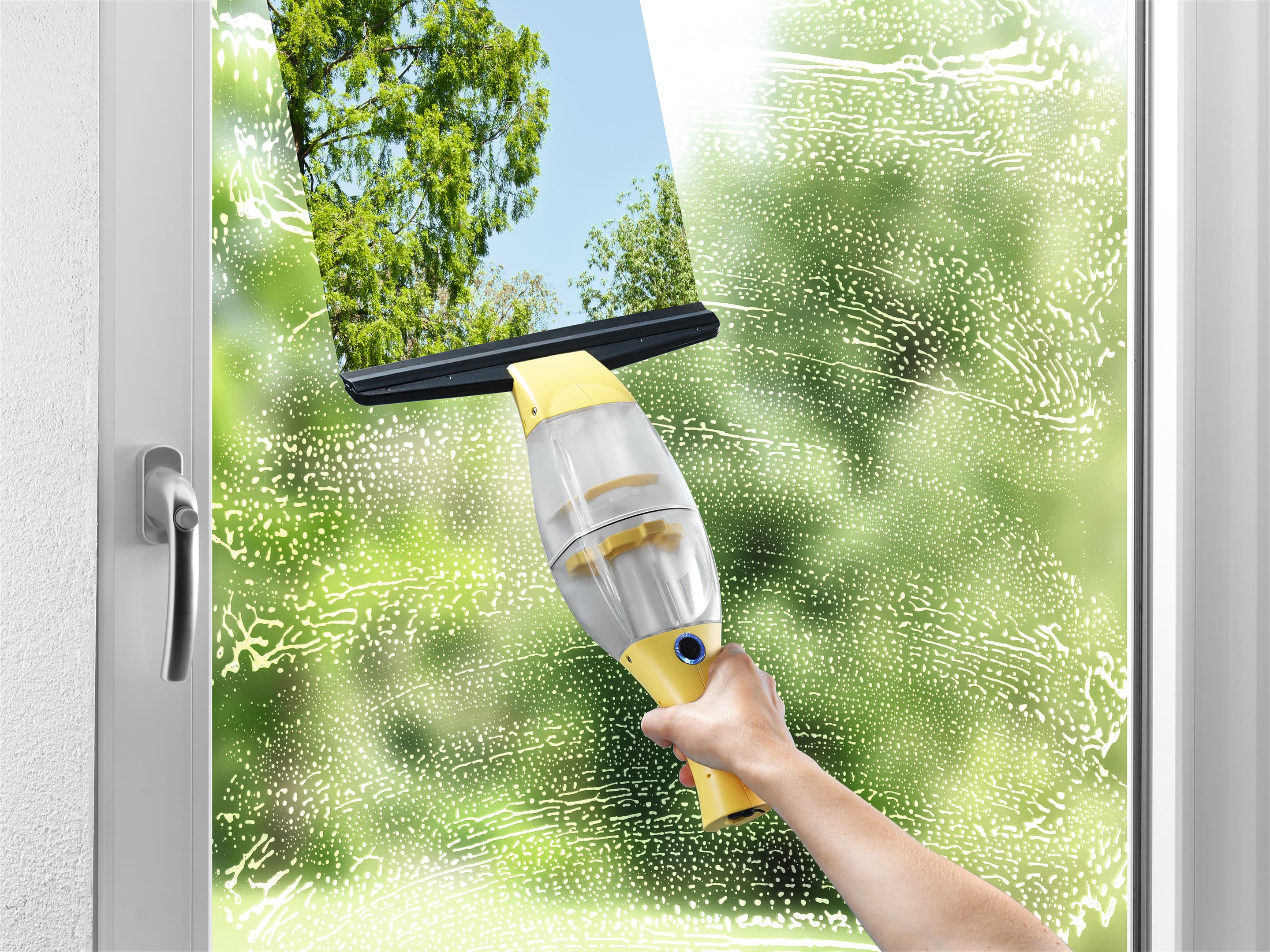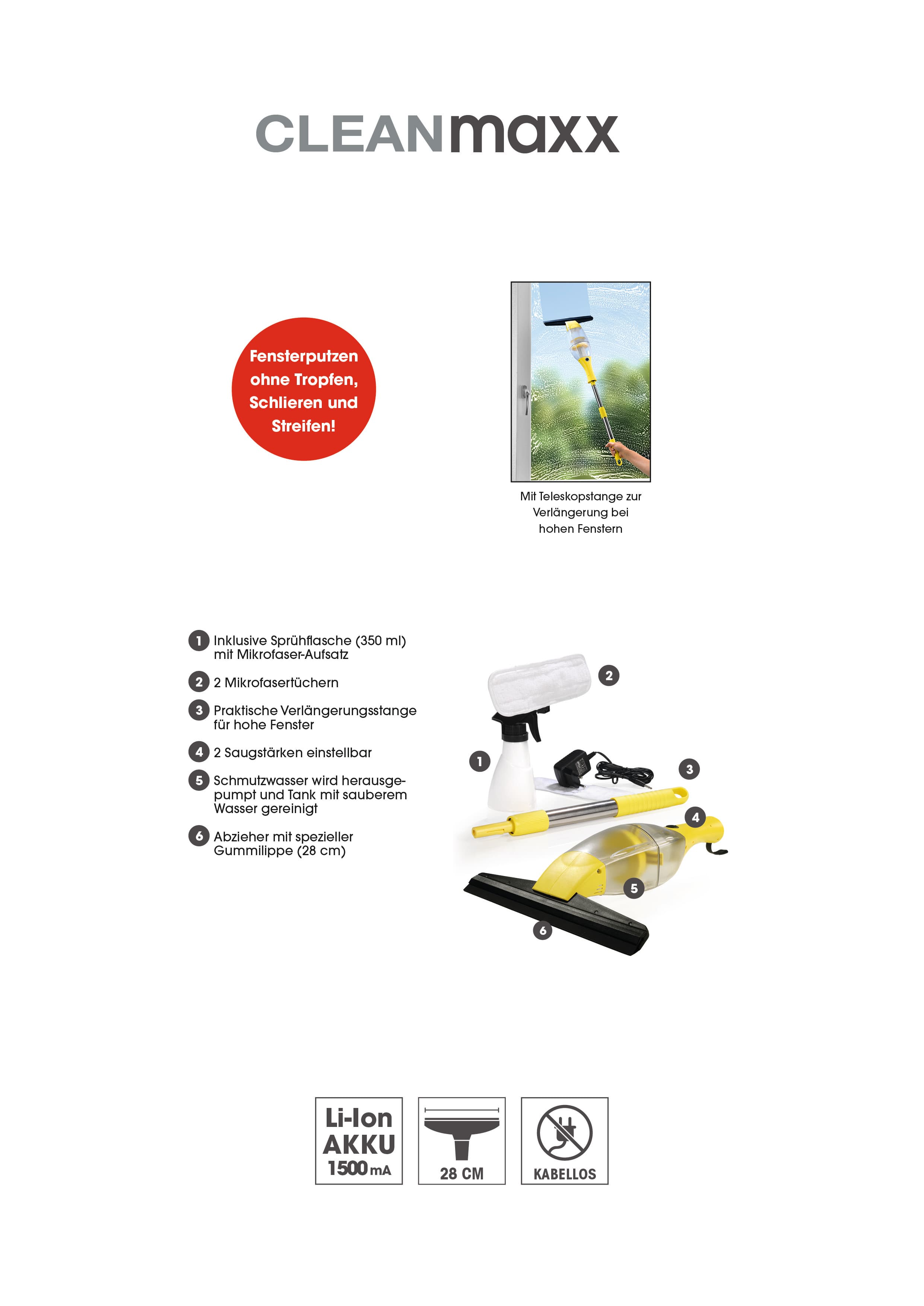 Fensterputzen ohne Tropfen, Schlieren und Streifen! Entdecken Sie jetzt das Reinigungs-Plus für Fenster und glatte Flächen im gesamten Haushalt! Mit dem handlichen CLEANmaxx Akku-Fensterreiniger sorgen Sie in kürzester Zeit für streifenfrei saubere Fenster und Fliesen in Küche und Bad. Herabtropfendes Wasser und Schmutzwasserpfützen nach dem Fensterputz gehören damit der Vergangenheit an: Das Putzwasser wird streifenfrei abgezogen und automatisch aufgesaugt. Dank Akkubetrieb ist der CLEANmaxx Akku-Fensterreiniger besonders komfortabel in der Handhabung und flexibel einsetzbar. Für hohe Fenster liegt dem Set eine Teleskopstange bei, so dass Sie auch bei diesen Problemfällen für streifenfreie Sauberkeit bis in die Ecken sorgen können. Die anschließende Reinigung des CLEANmaxx Akku-Fensterreinigers ist kinderleicht und funktioniert auf Knopfdruck. Übrigens: Mit dem CLEANmaxx Akku-Fensterreiniger sind auch verschüttete Flüssigkeiten blitzschnell beseitigt!