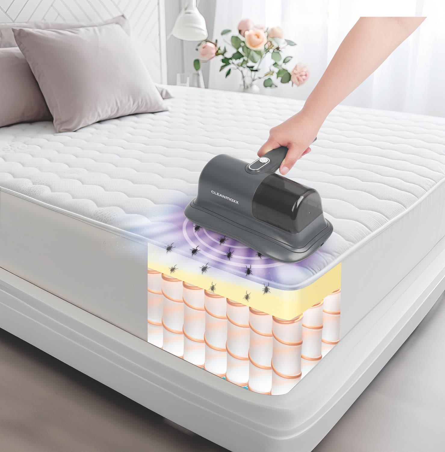 Sag Milben und Allergenen den Kampf an – schnell, gründlich und kabellos! Mit dem kompakten CLEANmaxx Akku-Milbensauger Vibration bringst du spürbar mehr Hygiene in dein Zuhause. Bis zu 6 kPa Saugkraft und eine Akkulaufzeit von 15 Minuten reichen aus, um Matratzen, Bettdecken, Kissen und mehr zuverlässig von 99,9 % aller Milben zu befreien. Dank des integrierten UV-C-Lichts werden Oberflächen gleichzeitig desinfiziert – ganz ohne Chemie. Das Reinigungsprinzip ist einfach und effektiv: Milben und Schmutz werden aufgerüttelt, per UV-C-Licht sterilisiert und anschließend restlos abgesaugt. Du reinigst und desinfizierst in nur einem einzigen Arbeitsgang – unkompliziert und effektiv! Der waschbare EPA-Filter hält selbst feinste Partikel zurück, während der ca. 300 ml große Staubbehälter genug Platz für eine komplette Reinigung bietet. Und weil der Sauger kabellos und besonders handlich ist, hast du ihn im Alltag immer schnell zur Hand – ob im Schlafzimmer, auf dem Sofa oder unterwegs. Auspacken, absaugen und endlich wieder erholsam schlafen – erlebe den CLEANmaxx Akku-Milbensauger Vibration für ein sauberes, allergenfreies Zuhause.