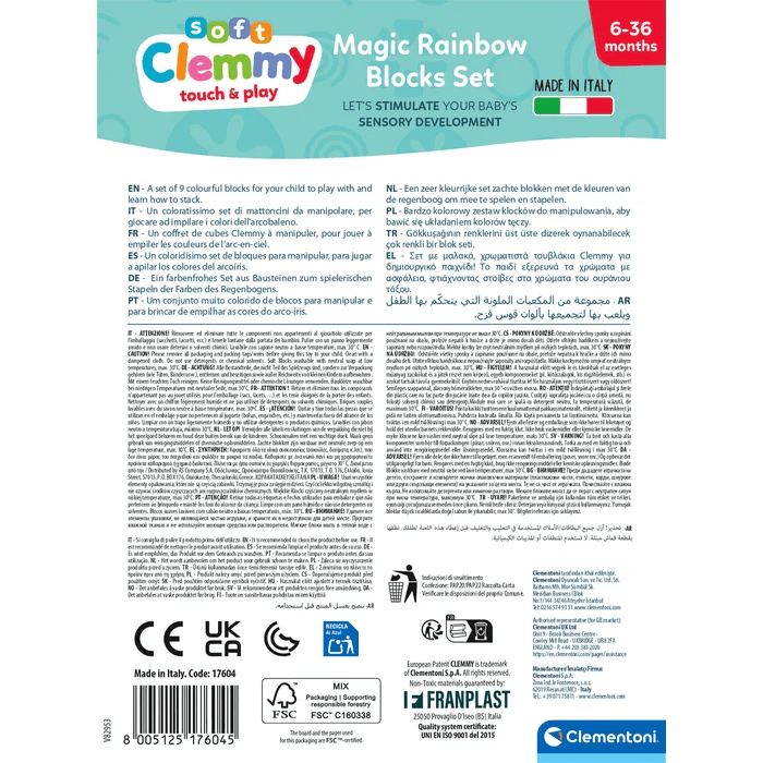 Mit dem Clementoni Clemmy Regenbogen Set entdecken Babys spielerisch die Welt der Farben, Formen und ersten Konstruktionen. Das Set enthält 9 extra weiche, bunte Bausteine, die speziell für kleine Hände entwickelt wurden und sich sicher greifen, stapeln, drücken und sogar in den Mund nehmen lassen.