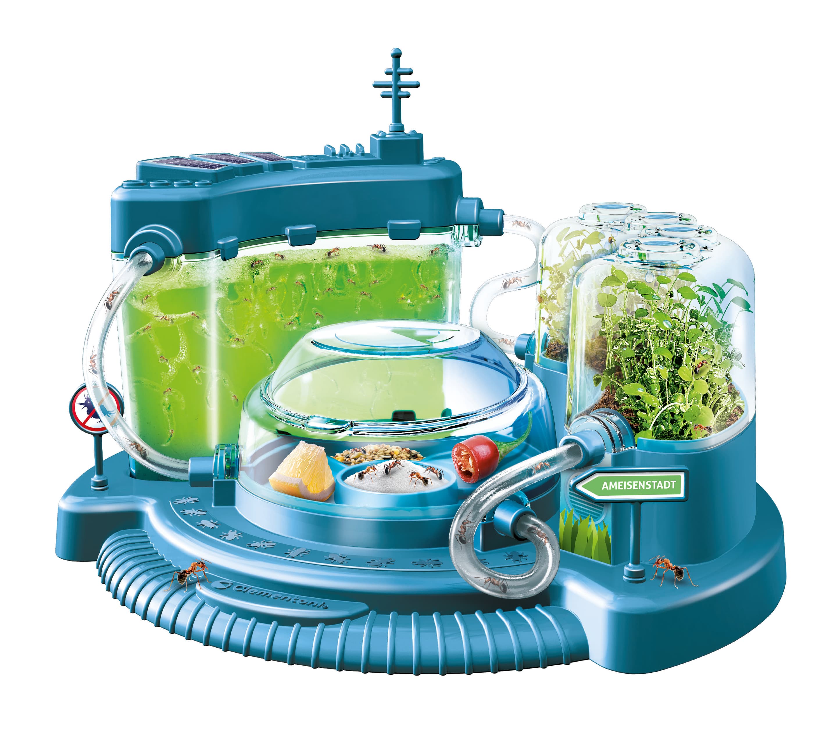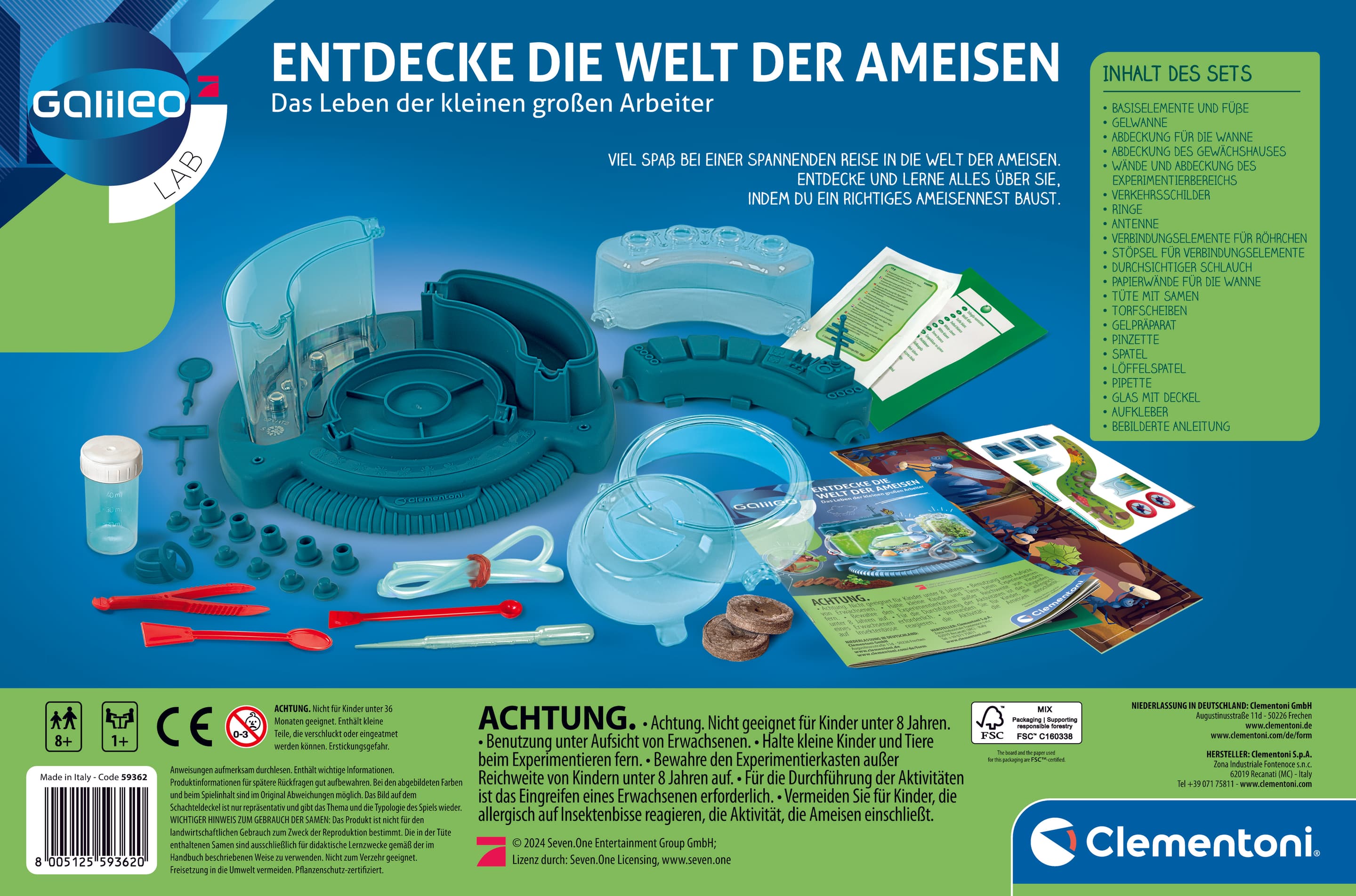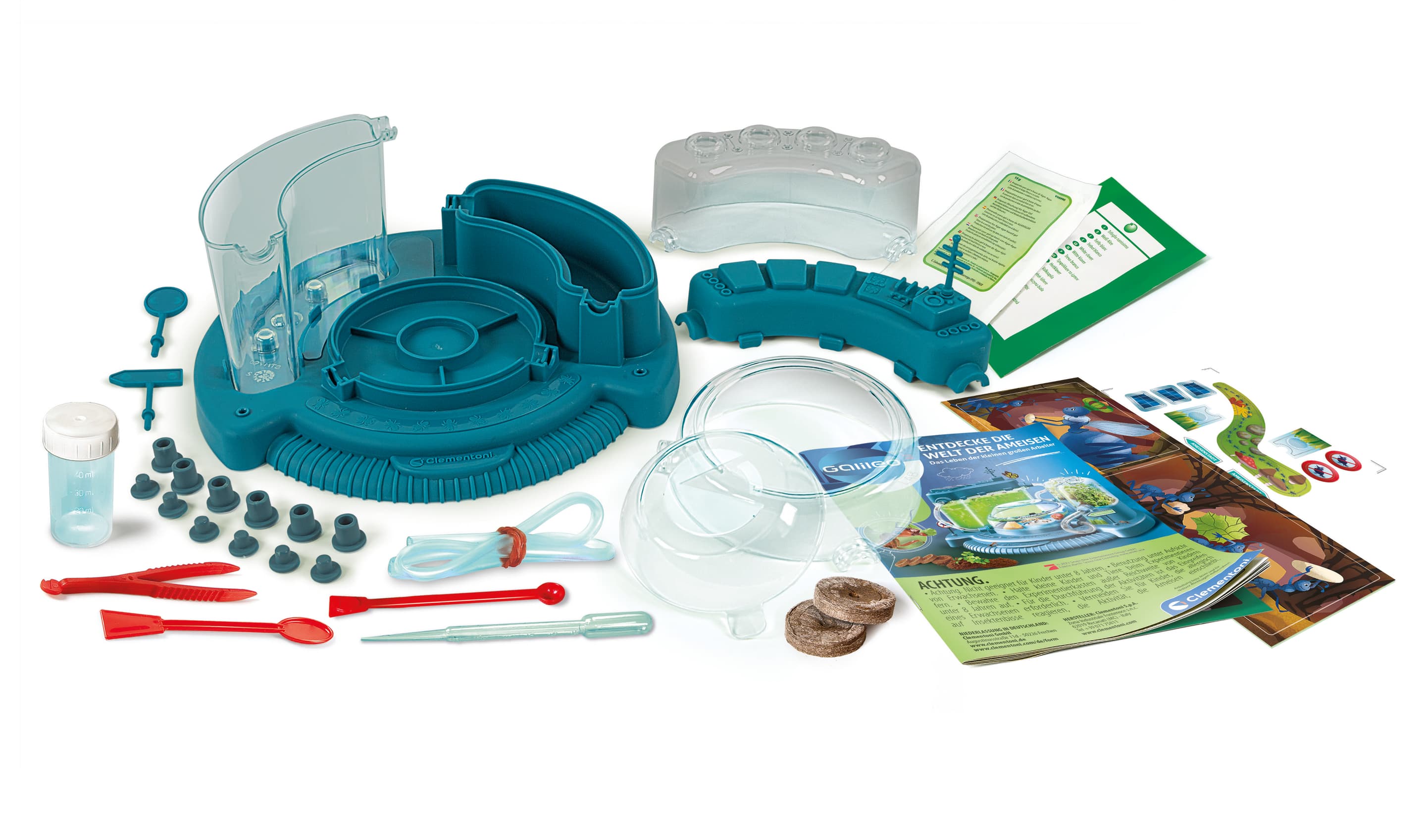 Ein modulares Set, um den Lebensraum der Ameisen nachzubauen und ihr Verhalten zu beobachten. • Das Spiel umfasst einen Bereich, in dem die Ameisen Tunnel graben können, ein Botanikmodul zur Beobachtung der Ameisen über dem Boden und einen Abschnitt, der dem Verständnis ihrer Ernährungsweise gewidmet ist. • Ein integrierter Aktivitätstisch enthält drei Umgebungen und alle Instrumente, um das Leben der Ameisen optimal zu beobachten.