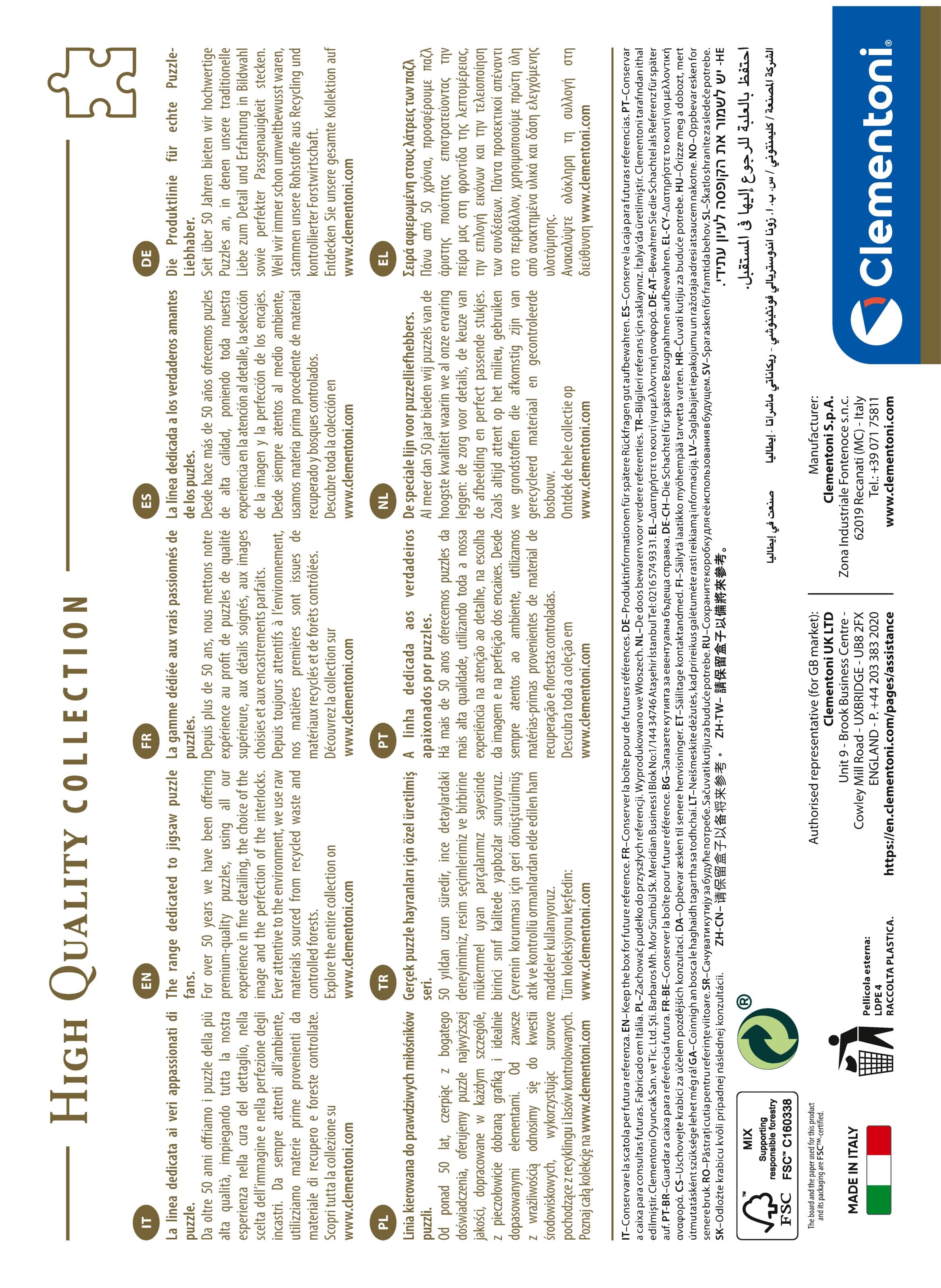 Clementoni Puzzles bestechen durch Materialien in höchster Qualität, wunderschöne Bilder, exklusive Kollektionen, hochwertige Drucke, sowie Puzzleteile von präziser Passform. Eine kluge Produktionstechnik macht ein perfektes Ineinanderpassen möglich. Die Puzzle-Sortimente werden höchsten Ansprüchen gerecht und nicht zuletzt dadurch ist Clementoni in vielen Ländern Europas Marktführer.