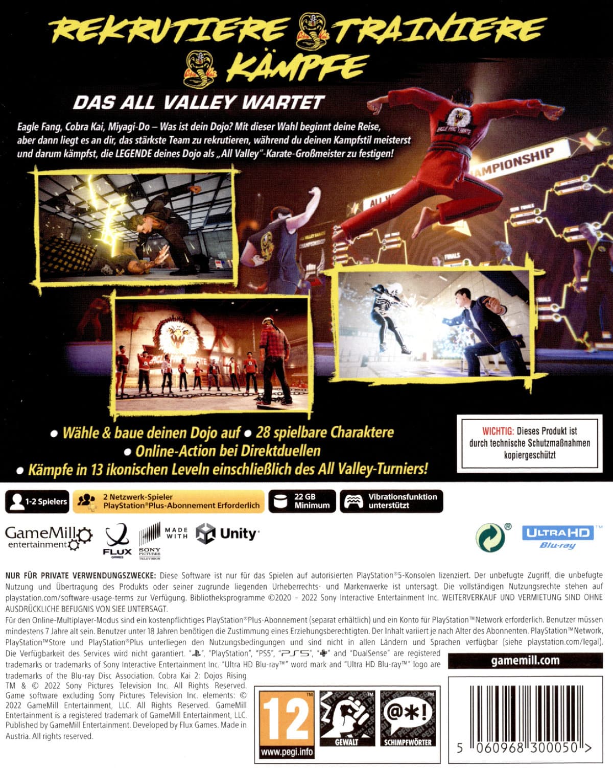 Wechsel in den Story-Modus und tauche ein in eine aufregende neue Geschichte, in der du dir deinen Weg zum All Valley Tournament erkämpfst, oder spiele Cobra Classics und erlebe epische Momente aus der Show und vieles mehr! Mit 28 spielbaren Charakteren kannst du als deine Lieblingscharaktere aus der umfangreichen Liste der Show spielen und ihre besonderen Fähigkeiten und Fertigkeiten auf deinem Weg zum Sieg nutzen!