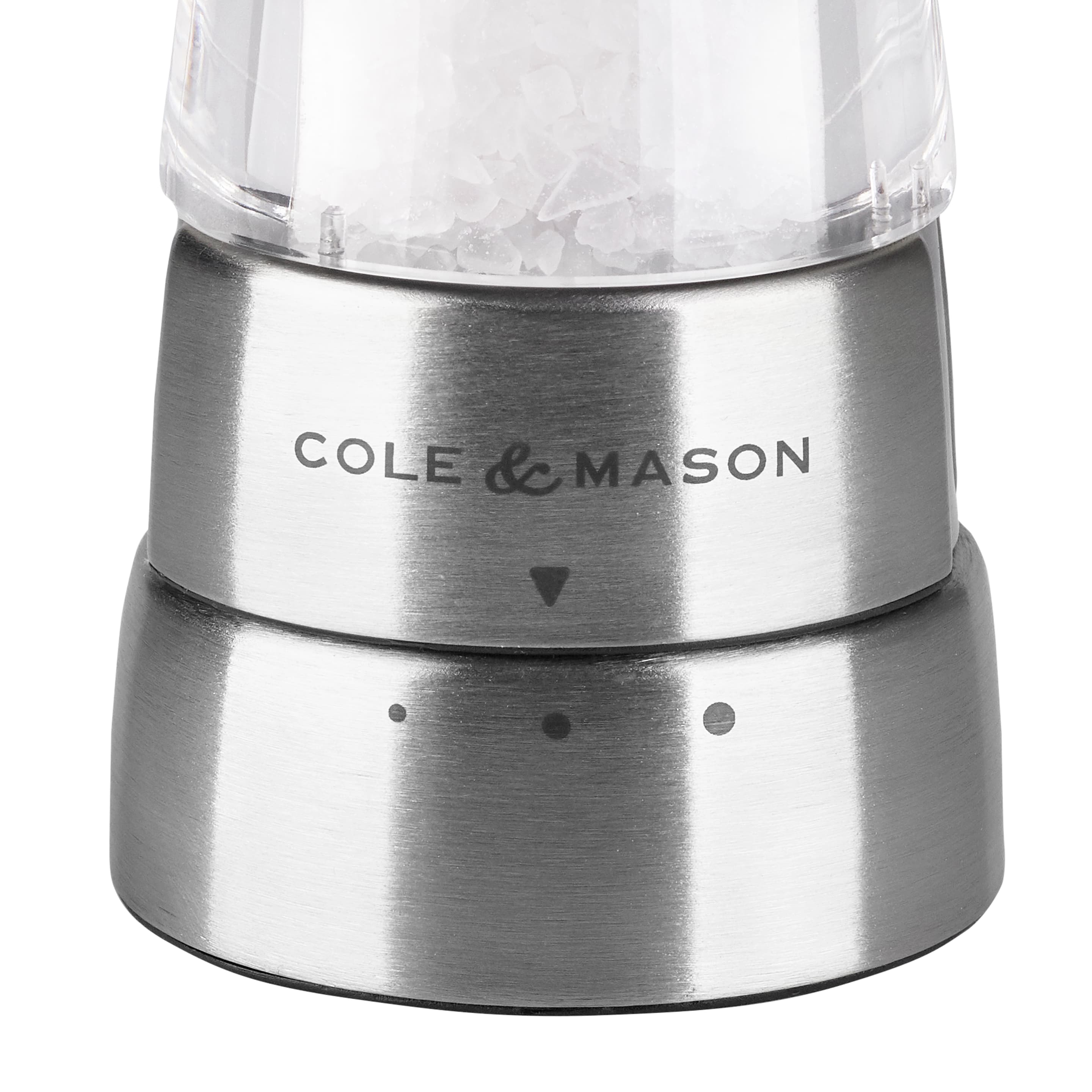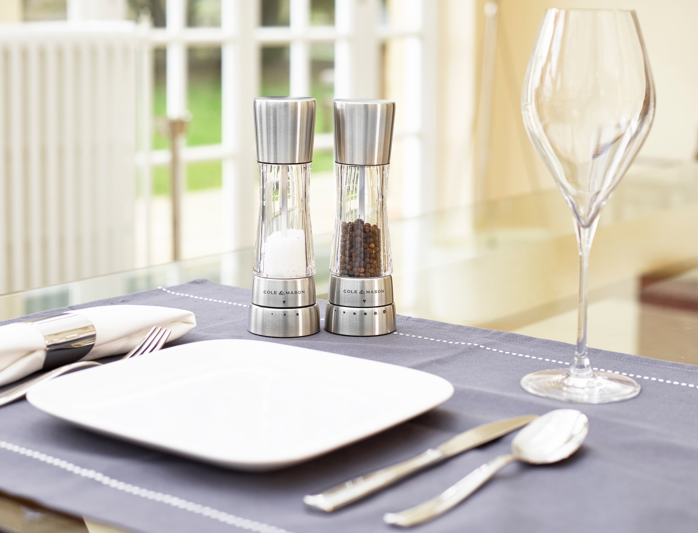 Gourmet-Präzision-Mühlen mit voreingestellten Mahlgraden, 6 Mahlstufen für Pfeffer und 3 Mahlstufen für Salz. Mit Gourmet Präzisionsmahlwerk. Gourmet-Präzisionsmahlwerk mit voreingestellten Mahlgraden. Fünf einstellbare Mahlstufen für Pfeffer und drei für Salz, von grober Körnung bis hin zu feinstem Salz- bzw. Pfefferstaub. Modernes Design; langlebiges Acryl und Edelstahl. Durchsichtiges Gehäuse für einfaches Einsehen der Füllhöhe. Das Cole&Mason Sortiment von hochwertigen Mühlen Gourmet-Präzision mit voreingestellten Mahlgraden gibt dem Koch die komplette Kontrolle. Sie können unter 6 Mahlstufen für Pfeffer und 3 Mahlstufen für Salz auswählen, um eine präzise Einstellung von grobkörnig bis fein sicherzustellen. Wählen Sie eine feine Mahlstufe für Saucen und stellen Sie dann mühelos eine gröbere Mahlstufe ein, um Steaks und Pizzas einen intensiven Geschmack zu verleihen. Das Sortiment setzt unsere preisgekrönte Technology ‘Präzisions-System’ ein, die ein diamantgeschliffenes Keramikmahlwerk (für Salz) und ein maschinengeschliffenes Mahlwerk aus gehärtetem Kohlenstoffstahl (für Pfeffer) miteinander kombiniert; ein Federmechanismus sorgt jedes Mal für einen gleichmäßigen Mahlvorgang.