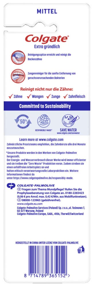 - Details & Lieferumfang – Colgate Extra Clean Zahnbürste Mittel, Reinigungsspitze sowie wellenförmige Borsten reinigen effektiv und gründlich alle Zähne, mit integriertem Zungenreiniger, 3 Stück