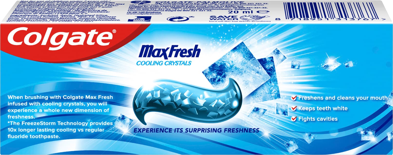 Halten Sie Ihre Zähne gesund und frisch mit der Colgate Max Fresh Cooling Crystals Zahnpasta. Die leistungsstarke Formel enthält kleine Kristalle, durch die Sie bei jedem Zähneputzen eine ganz neue Dimension der Frische erleben. Die FreshFX-Technologie sorgt für einen Frische-Effekt, der 10x länger anhält im Vergleich zu herkömmlicher Fluorid Zahnpasta.