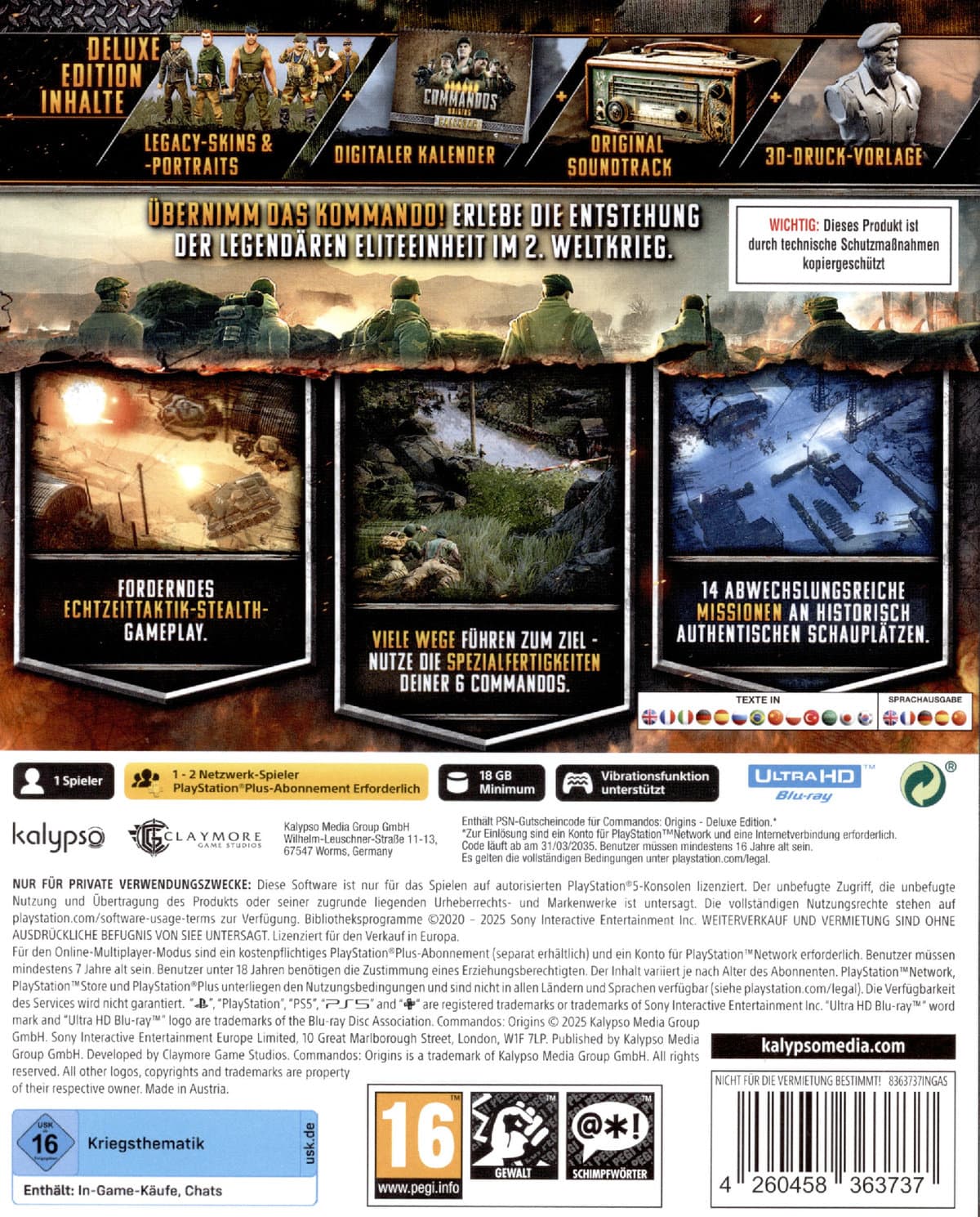 ALARM! Du wurdest für eine Spezialmission ausgewählt, die über das Schicksal der Welt entscheiden wird. Erlebe die Entstehung der legendären Eliteeinheit in Commandos: Origins. Der langerwartete Nachfolger der Commandos-Serie führt dich zurück zu den Anfängen des Echtzeit-Taktik-Genres. Und damit zu den Tagen, in denen Jack O’Hara – der Green Beret – und seine fünf Kameraden zu der berühmt-berüchtigten Truppe wurden, die seither dafür bekannt ist, all jene Missionen zu erledigen, an die sich niemand sonst herangewagt. Ein neues Kapitel wartet in den tiefen Schatten der Geschichte des Zweiten Weltkriegs, in dem Helden geboren und Legenden geschmiedet werden. Ob für einen waghalsigen Überfall, eine verdeckte Sabotage oder eine heldenhafte Rettungsaktion – der Green Beret, der Pionier, der Scharfschütze, der Fahrer, der Marine und der Spion werden all ihre Fähigkeiten vereinen müssen, um die anspruchsvollen Aufgaben zu meistern. Dies wird dir jedoch nur gelingen, wenn du einem durchdachten Plan folgst und geschickt gezielte Angriffe und Stealth-Aktionen kombinierst. Von den vereisten Ebenen der Arktis bis zu den weiten Wüsten Afrikas, von der Westküste Europas bis an die Ostfront liegt es an dir, die Commandos in hochriskanten Einsätzen in ihrem Kampf gegen die Nazi-Besatzung zum Erfolg zu führen. Forderndes Echtzeittaktik-Stealth-Gameplay: Nutze die einzigartigen Fähigkeiten deiner Commandos, infiltriere die Stützpunkte des Feindes und triff ihn an strategisch wichtigen Stellen, bevor du wieder in die Schatten verschwindest. Ein außerordentliches Team: 6 berühmt-berüchtigte Charaktere, jeder mit seiner eigenen Geschichte, schließen sich zu einer außergewöhnlichen Eingreiftruppe zusammen – den Commandos: Übernimm die Kontrolle über Jack O’Hara, den „Green Beret“, Thomas „der Pionier“ Hancock, Francis T. „der Scharfschütze“ Woolridge, Samuel „der Fahrer“ Brooklyn, James „der Marine“ Blackwood und Rene „der Spion“ Duchamp und führe sie zum Erfolg. Viele Wege zum Sieg: Die detaillierten, abwechslungsreichen und interaktiven Umgebungen bieten verschiedene Wege, dein Ziel zu erreichen. Verstecke dich, klettere, steuere unterschiedliche Fahrzeuge oder schleiche und krieche dich zum Missionserfolg! Auf deinen Befehl: Ein modernes Spielerlebnis mit präziser, intuitiver Steuerung erlaubt es dir, die Commandos zielgenau einzusetzen. Koordiniere mehrere komplexe Aktionen und führe sie gleichzeitig aus, um stark bewachte Zielobjekte zu erreichen. Kämpfe an allen Fronten: Begib dich auf über 10 Missionen an historisch authentischen Schauplätzen des Zweiten Weltkriegs, von der kargen Arktis bis zur afrikanischen Wüste, mit zahlreichen primären und optionalen Zielen, die deine gesamte taktische Expertise fordern. Zusammenhalt: Wage dich gemeinsam mit einem Freund im 2-Spieler-Koop-Multiplayer an die Einsätze, entweder online oder lokal im Split-Screen. Die Deluxe-Edition enthält zusätzlich zum Spiel: Legacy-Skins & -Portraits, digitaler Kalender, original Soundtrack und 3D-Druck-Vorlage. Sprachausgabe: Englisch, Deutsch, Französisch, Spanisch, vereinfachtes Chinesisch, traditionelles Chinesisch Untertitel: Englisch, Deutsch, Französisch, Italienisch, Spanisch, Polnisch, Bras. Portugiesisch, vereinfachtes Chinesisch, traditionelles Chinesisch, Japanisch, Koreanisch, Russisch, Türkisch, Arabisch