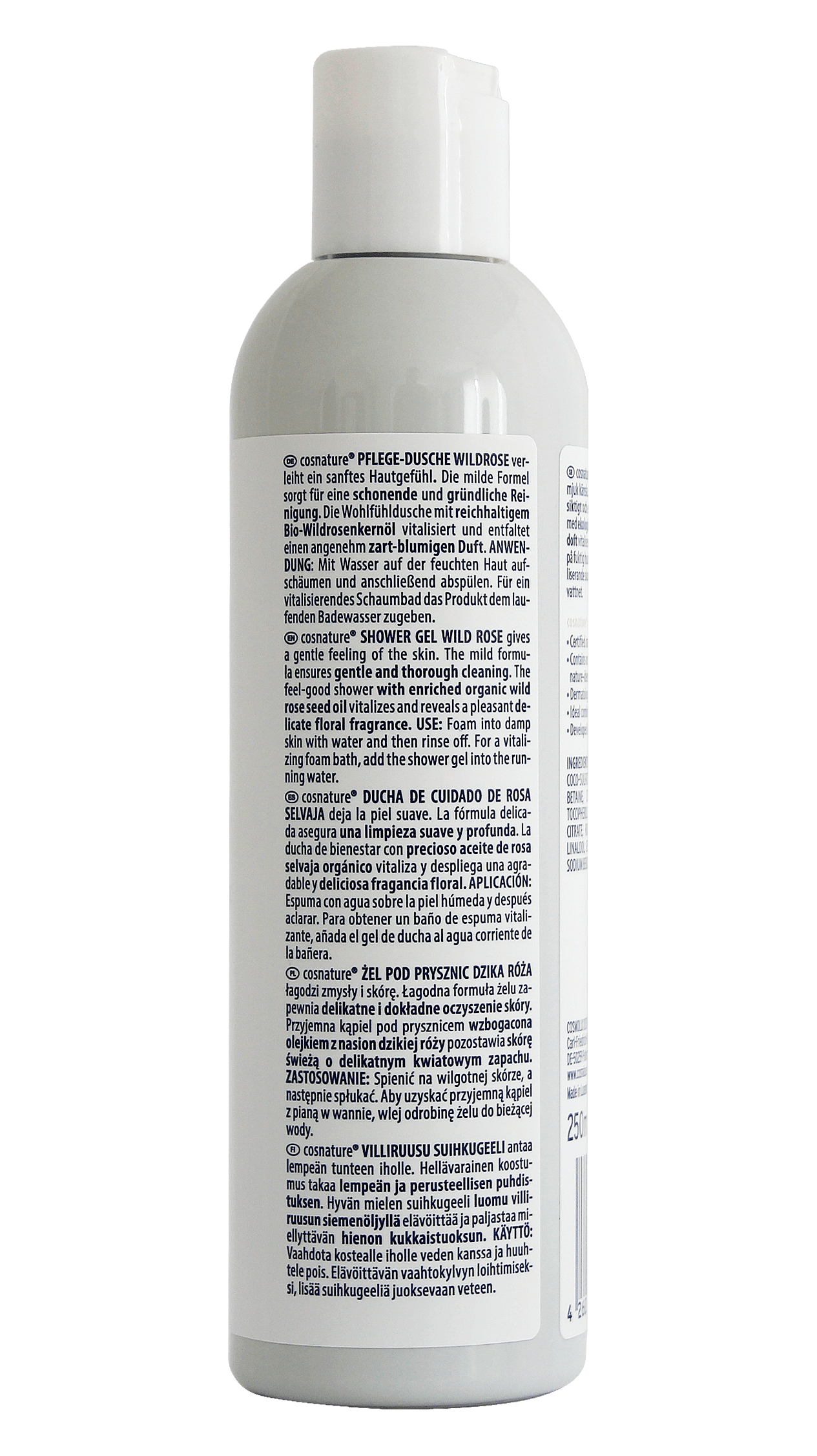 cosnature® PFLEGE-DUSCHE WILDROSE verleiht ein sanftes Hautgefühl. Die milde Formel sorgt für eine schonende und gründliche Reinigung. Die Wohlfühldusche mit reichhaltigem Bio-Wildrosenkernöl vitalisiert und entfaltet einen angenehm zart-blumigen Duft.