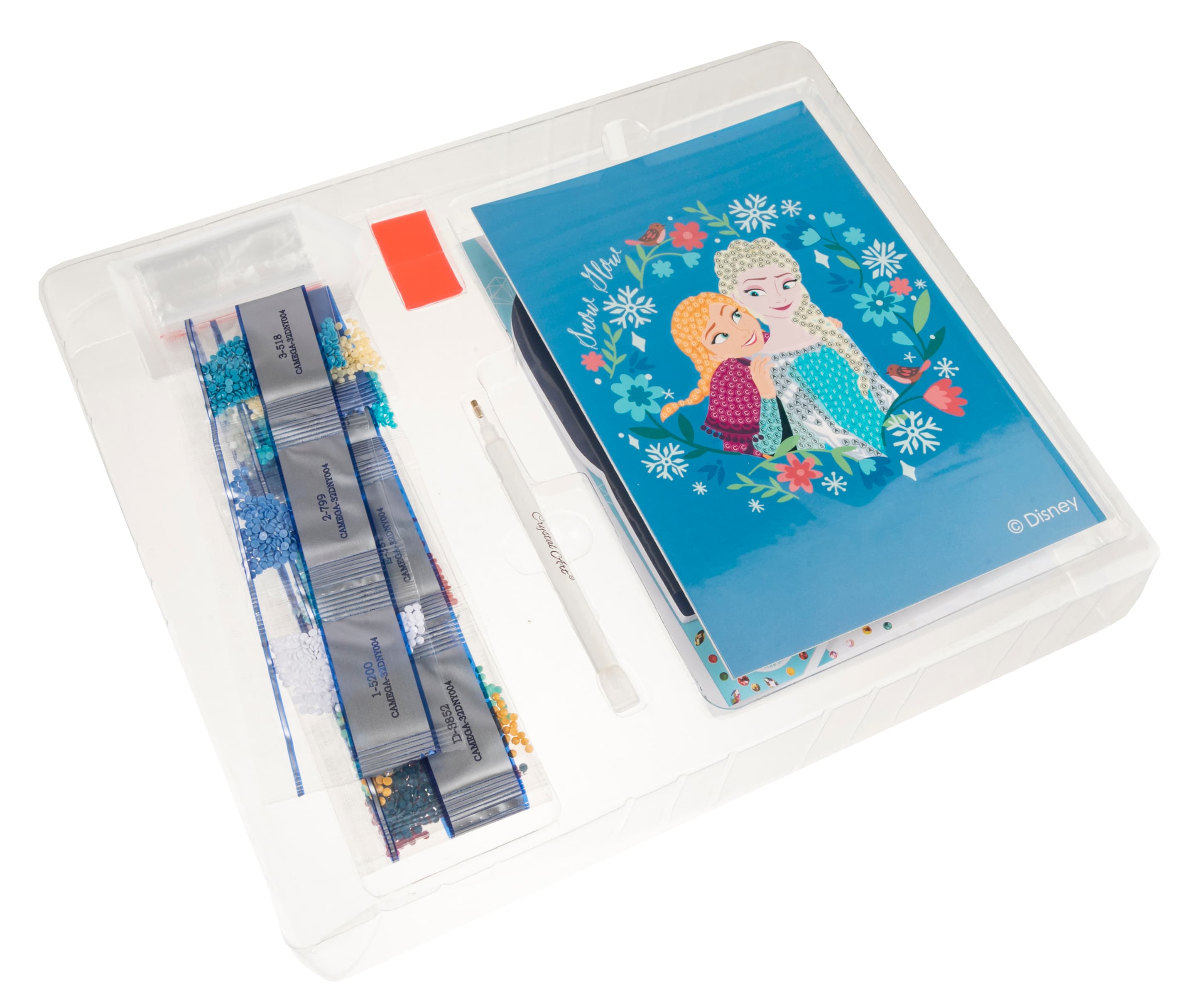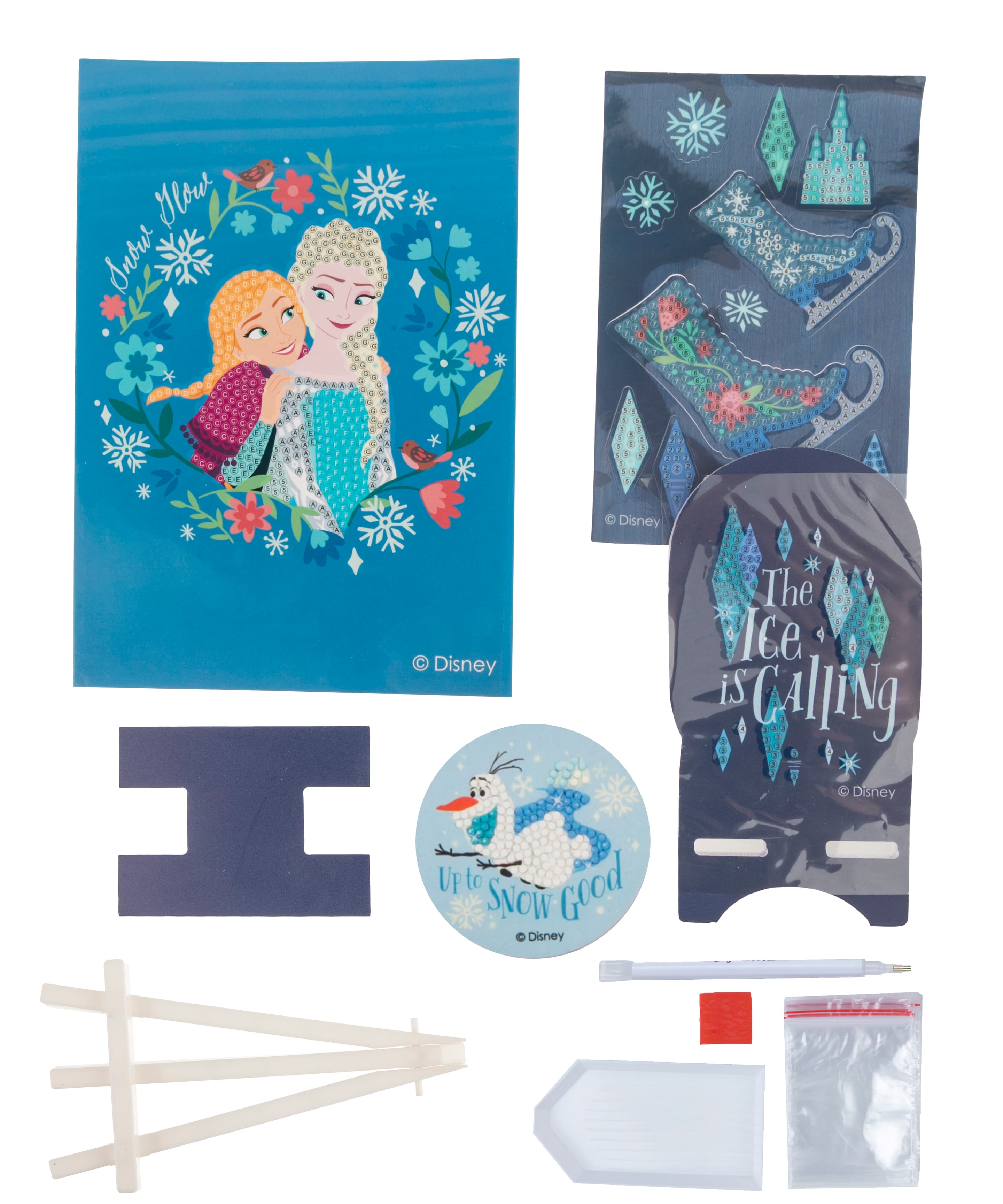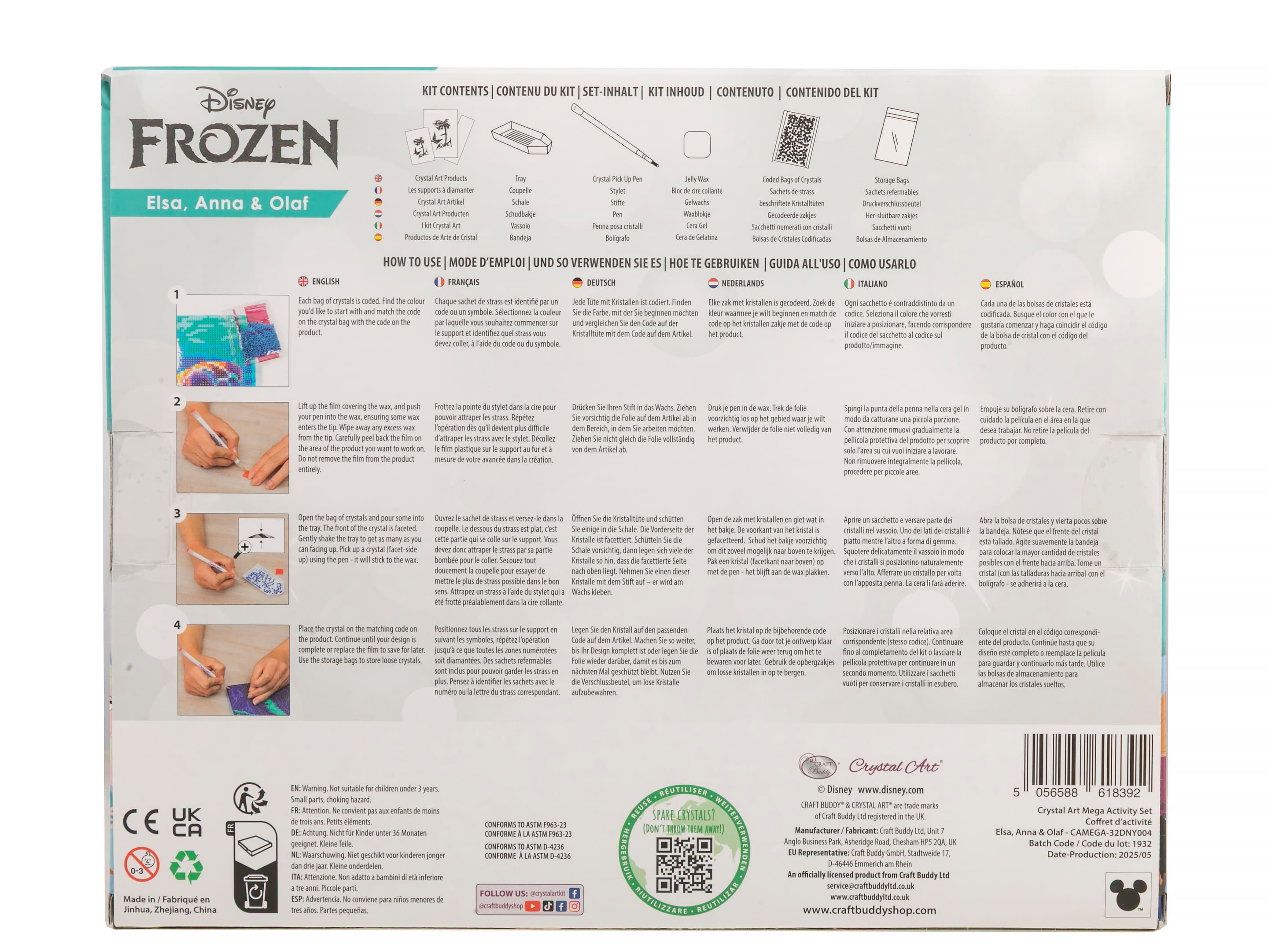 Gestalte wunderschön funkelnde Kristallbilder, Sticker und Figuren nach verschiedenen, vorgegebenen FROZEN-Designs. Alle Kreativsets enthalten: Karte mit selbstklebender Bildvorlage und Ständer, Stickerset, 2 BUDDIES, Lesezeichen, vorsortierte Beutel mit farbigen Kristallen, Stift zum Aufnehmen der Kristalle, Schale, Gelwachs, Bastelanleitung