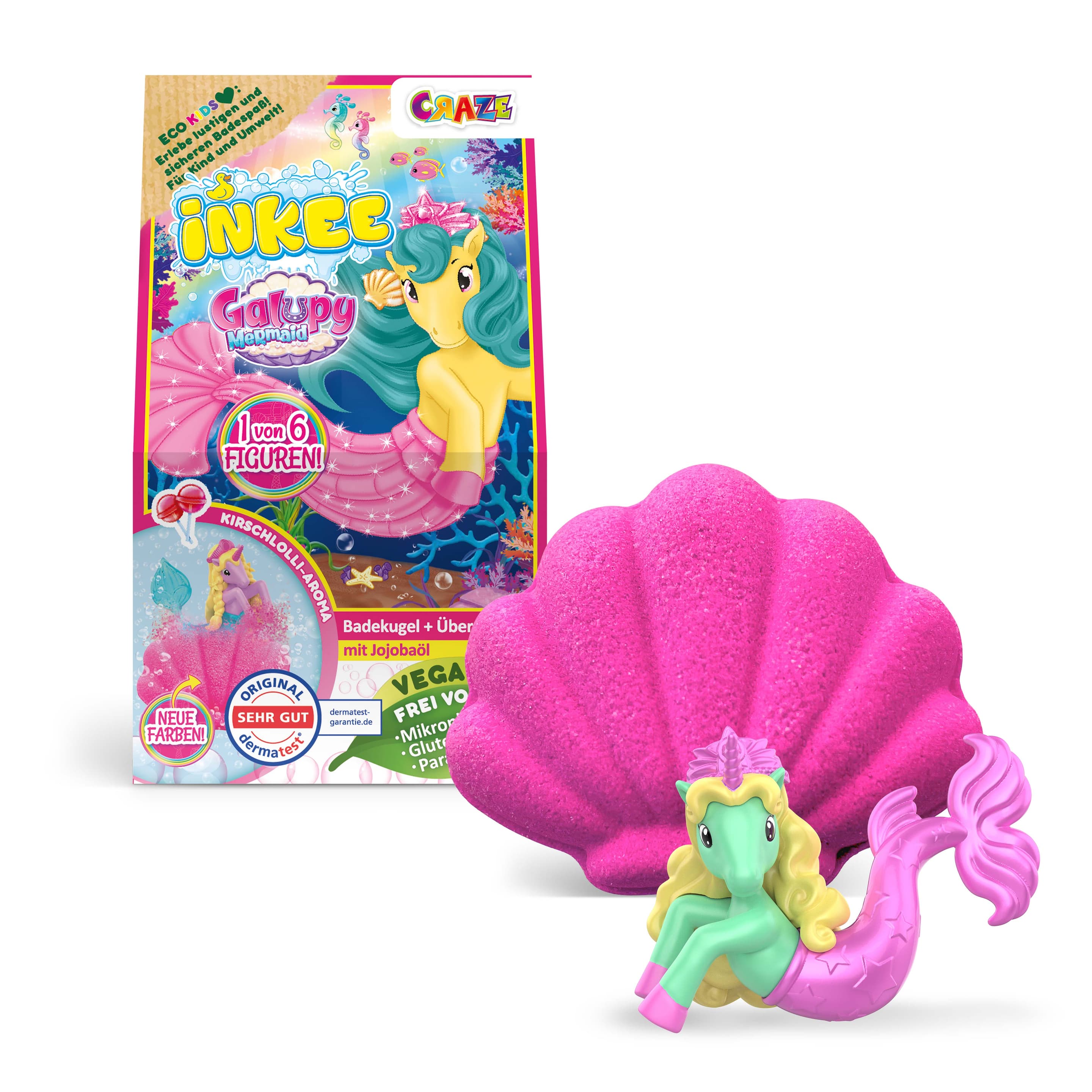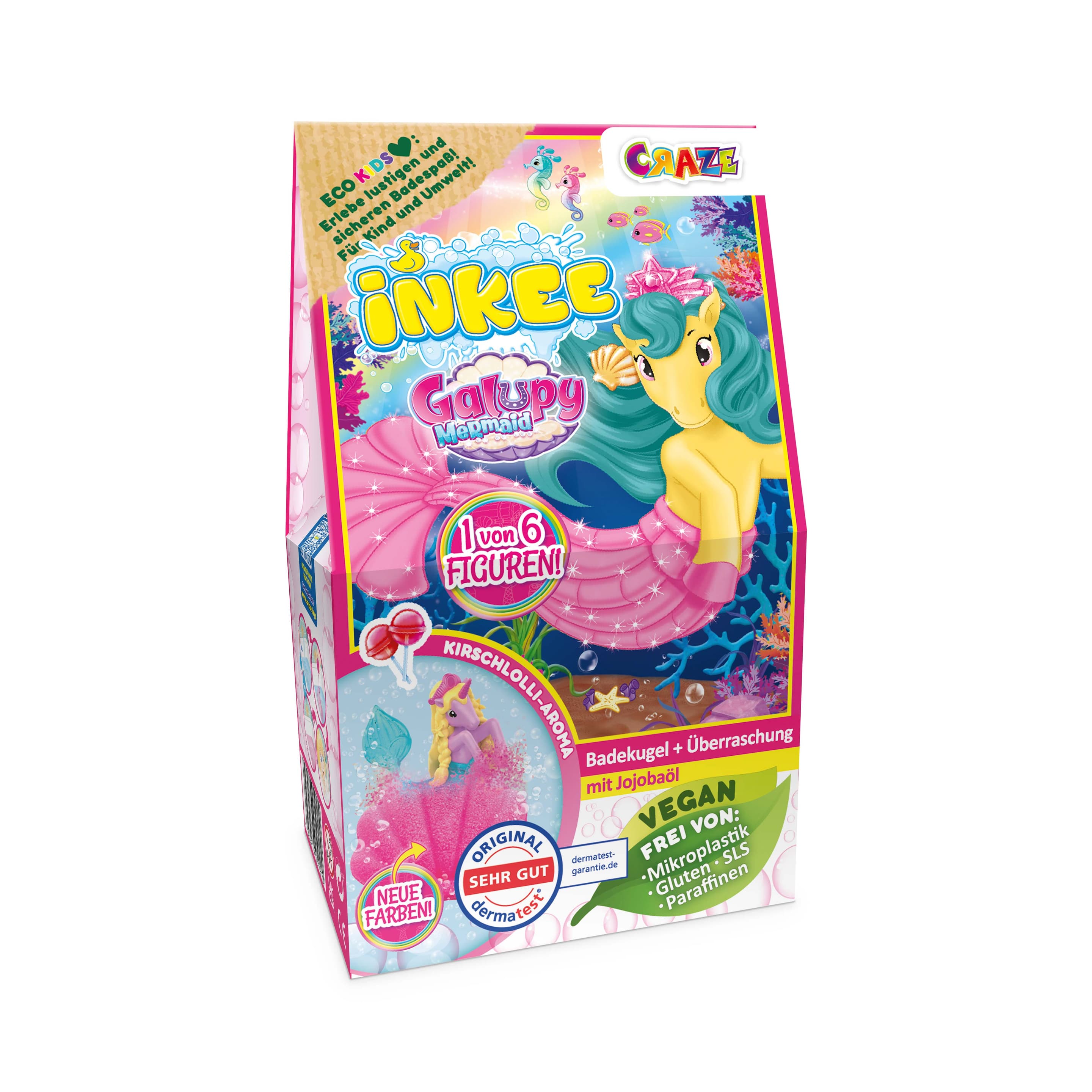 Überraschungs-Badebombe mit einer Galupy-Meerjungfrau-Überraschungsfigur im Inneren, mit 6 Sammelcharakteren. Mit Erdbeer- und Sahnearoma. Verpackt in einem Karton.
